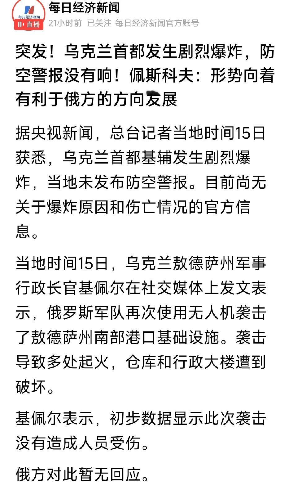 还有网友发文说,不可能,因为乌克兰的无人机防御设施世界第一!已经出口到中东国家了。敖德萨那可是当年叶女皇率领俄罗斯与奥斯曼帝国打了N多年才得到港口一定会拿回来的。不得不说的是,乌克兰昨天袭击了克里米亚,今天挨炸实属正常。如果不缺钱,你还会工作吗 霍尔木兹海峡的真正主人是谁 如何评价匈牙利总理欧尔班败选 山中易见千年树,求下联 真的有人花几十万打赏女主播吗 乌克兰首都基辅发生剧烈爆炸