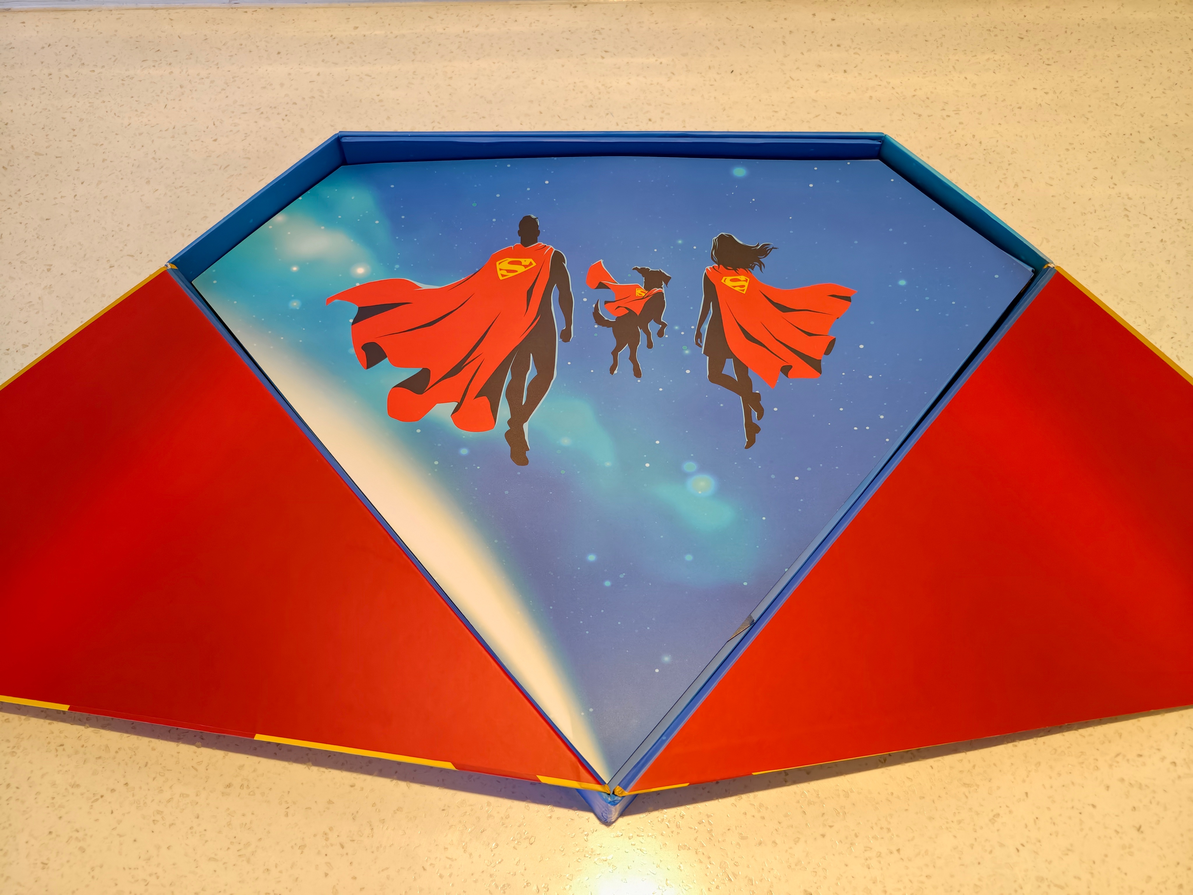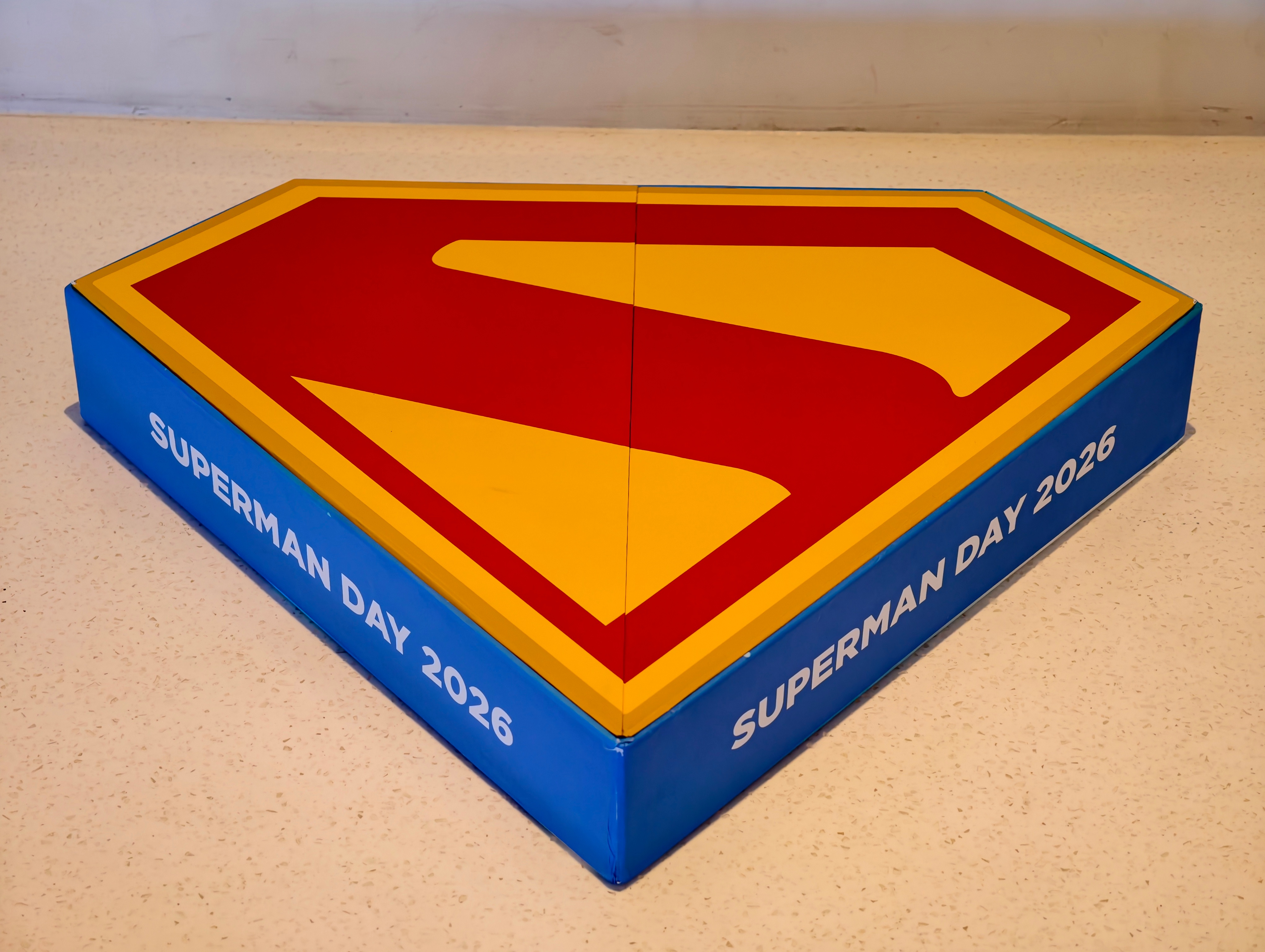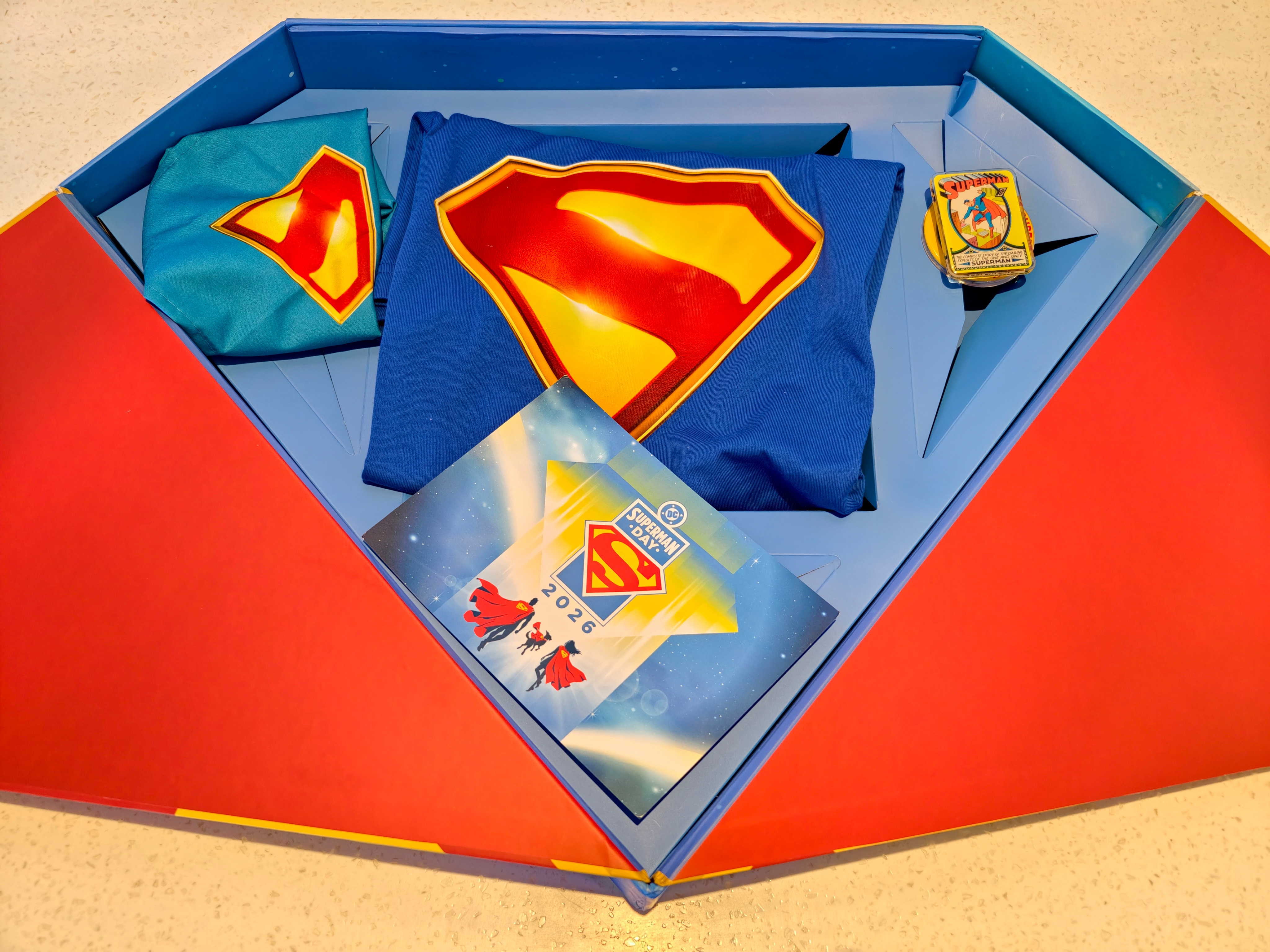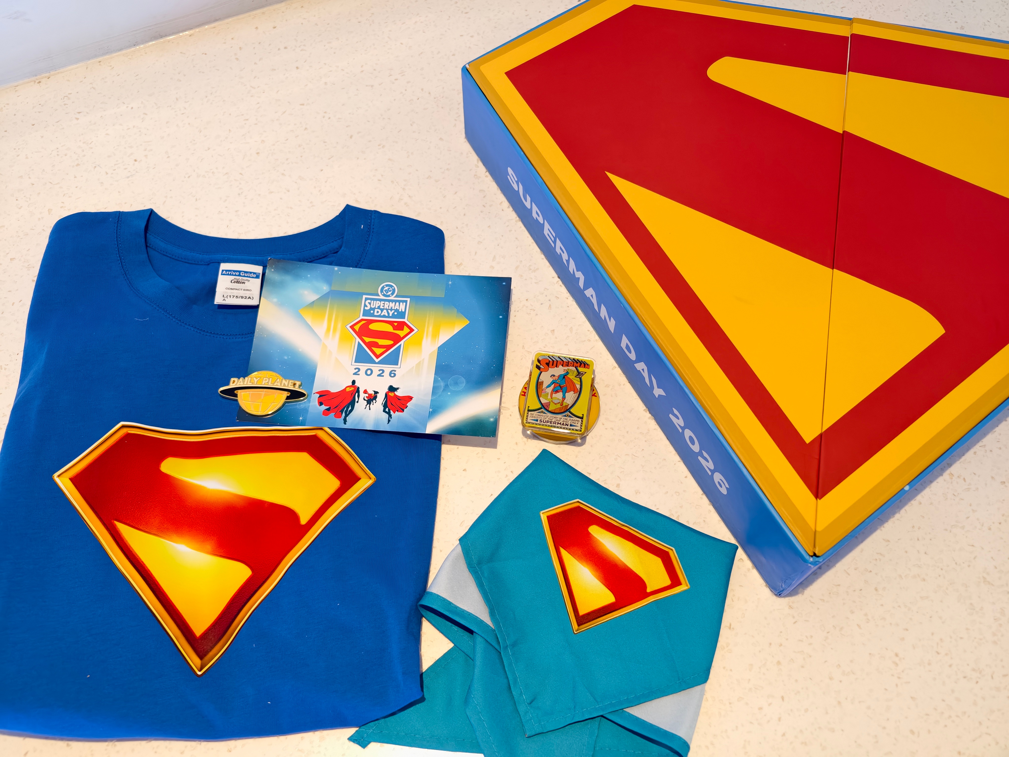 收到了DC超人日限定礼盒!经典的蓝、黄、红色,超显眼S盾礼盒,里面有一件超人T恤,口水巾,星球日报金属徽章,超人手机支架,以及一张超人、超级少女,超狗小氪的贺卡。