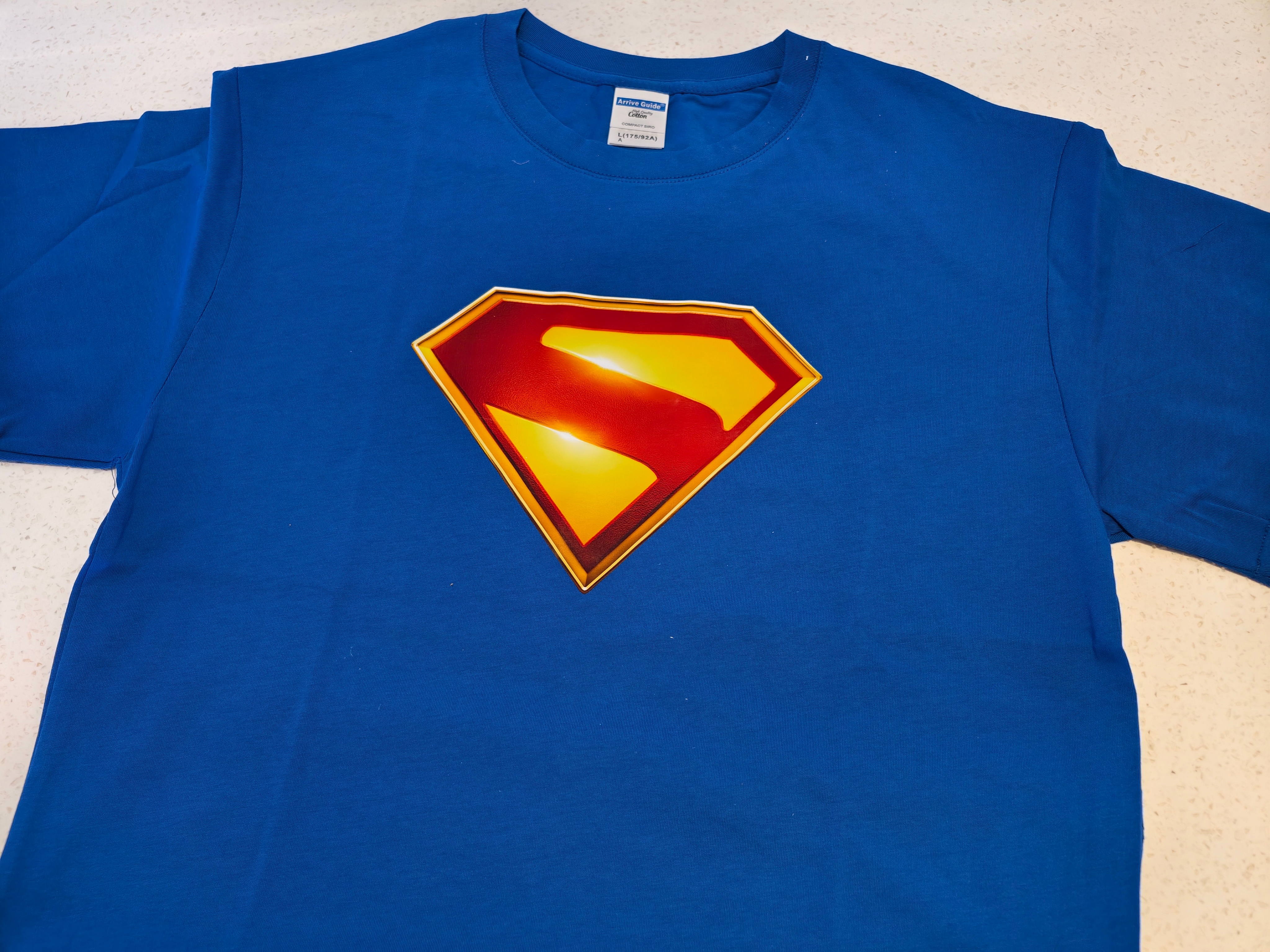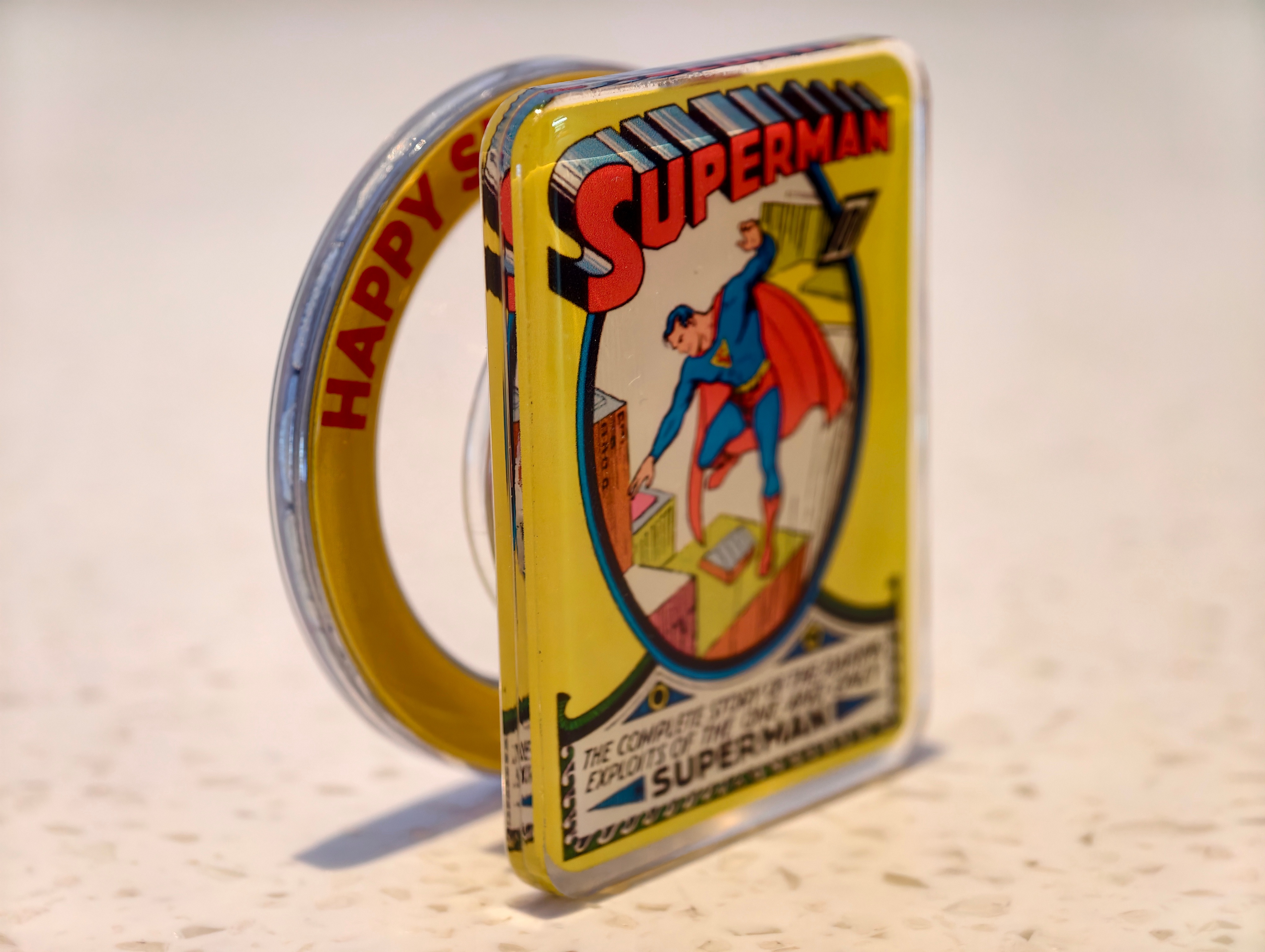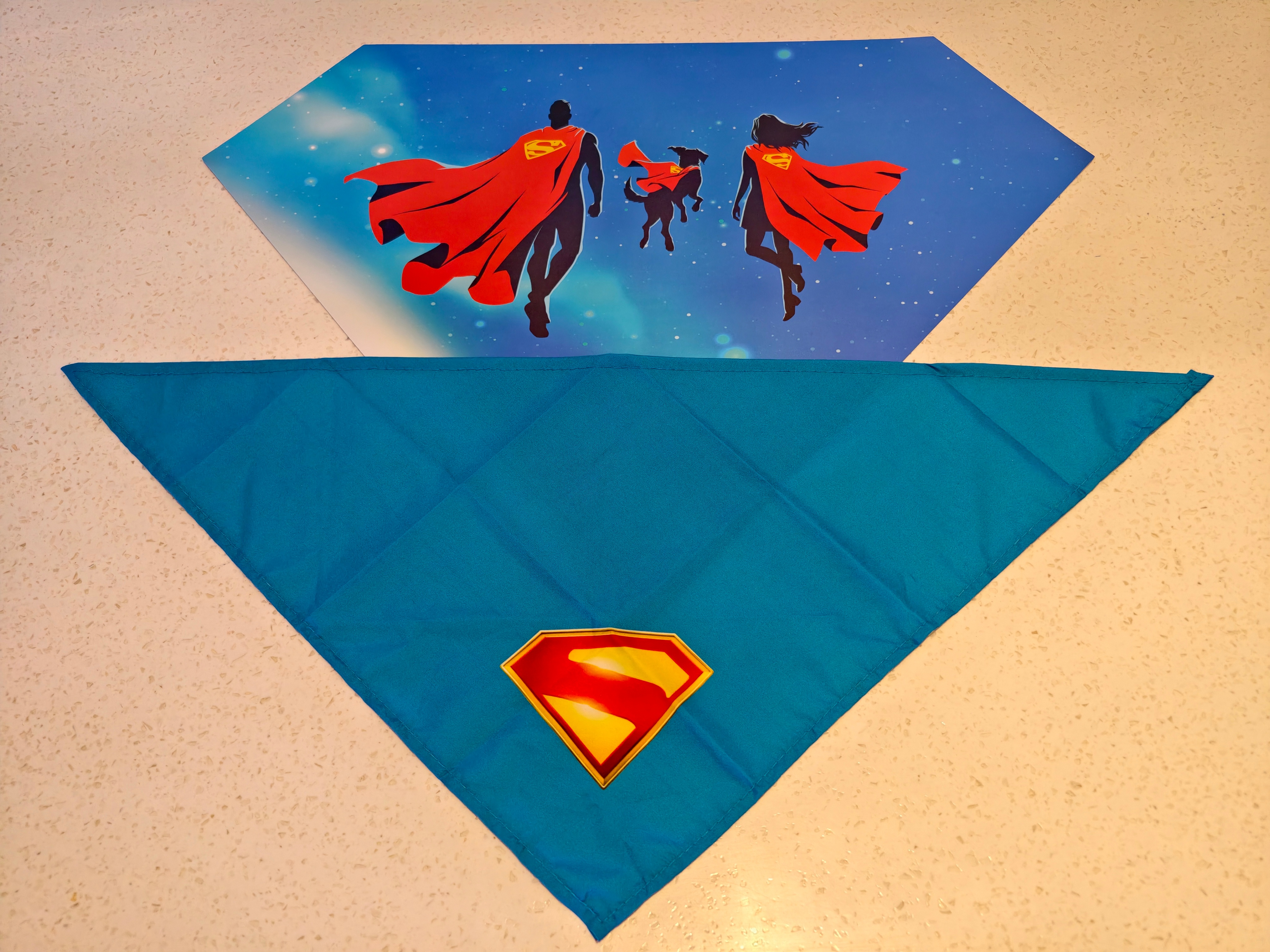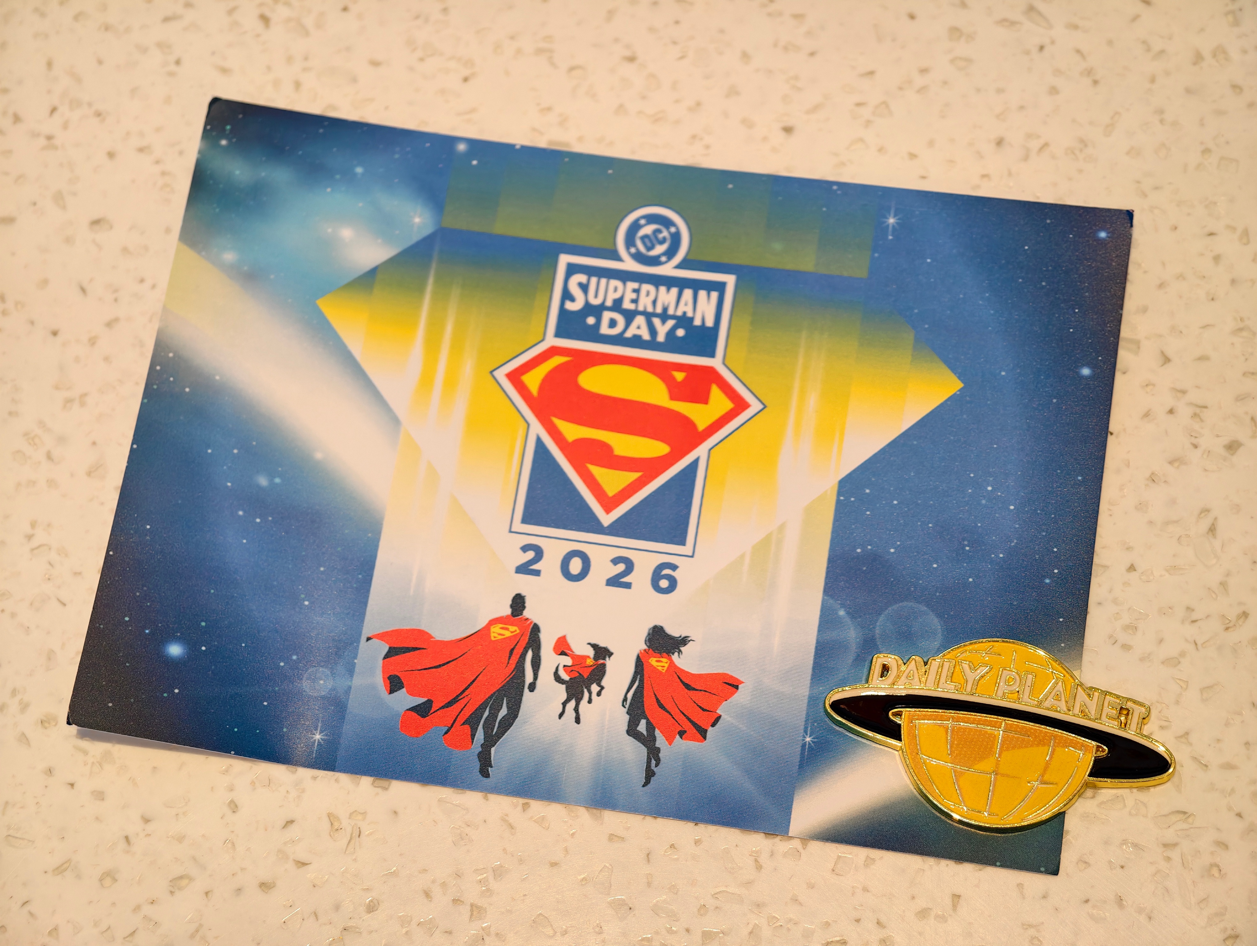 收到了DC超人日限定礼盒!经典的蓝、黄、红色,超显眼S盾礼盒,里面有一件超人T恤,口水巾,星球日报金属徽章,超人手机支架,以及一张超人、超级少女,超狗小氪的贺卡。