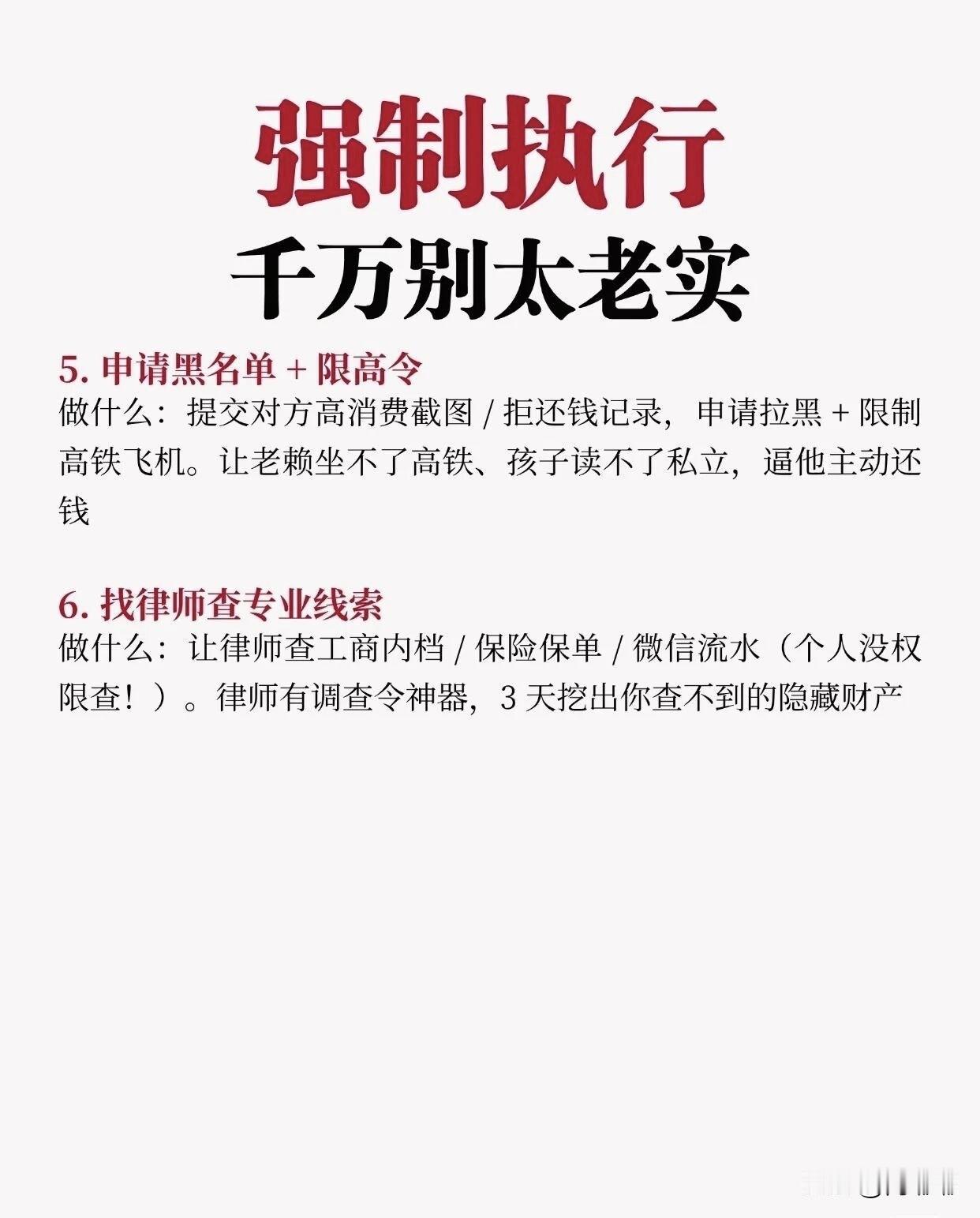 强制执行,千万别太老实。[祈祷]打赢官司拿不到钱,记住这6个主动追钱动作,比躺平等通知快三倍。