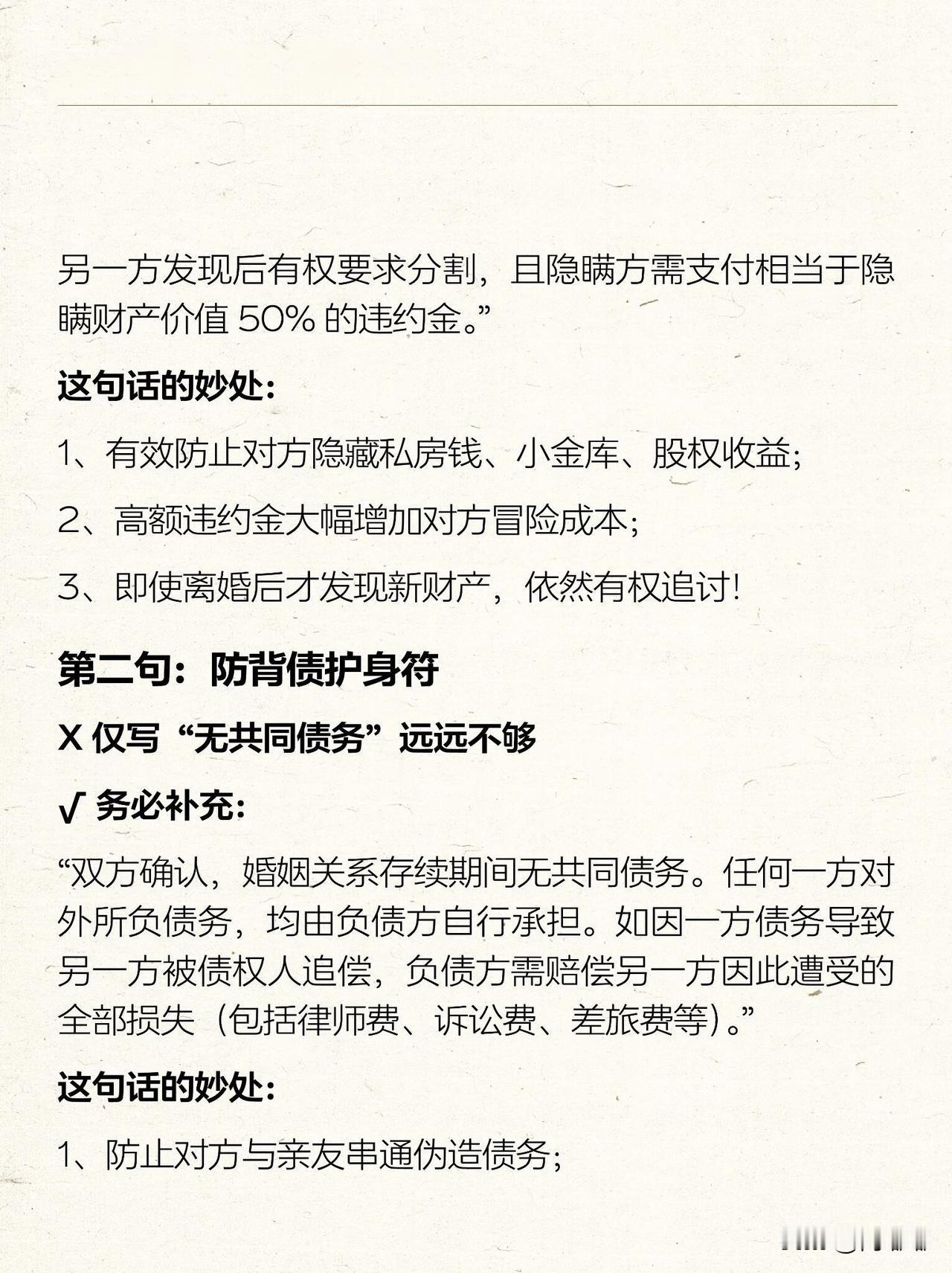 所以聪明的做法是在协议里加上这样一条“双方确认,除本协议列明的财产外,再无其他共同财产。若任何一方面存在隐瞒、转移、藏匿夫妻共同财产的行为,另一方发现后有权要求分割,且隐瞒方需支付相当于隐瞒财产价值50%的违约金”。