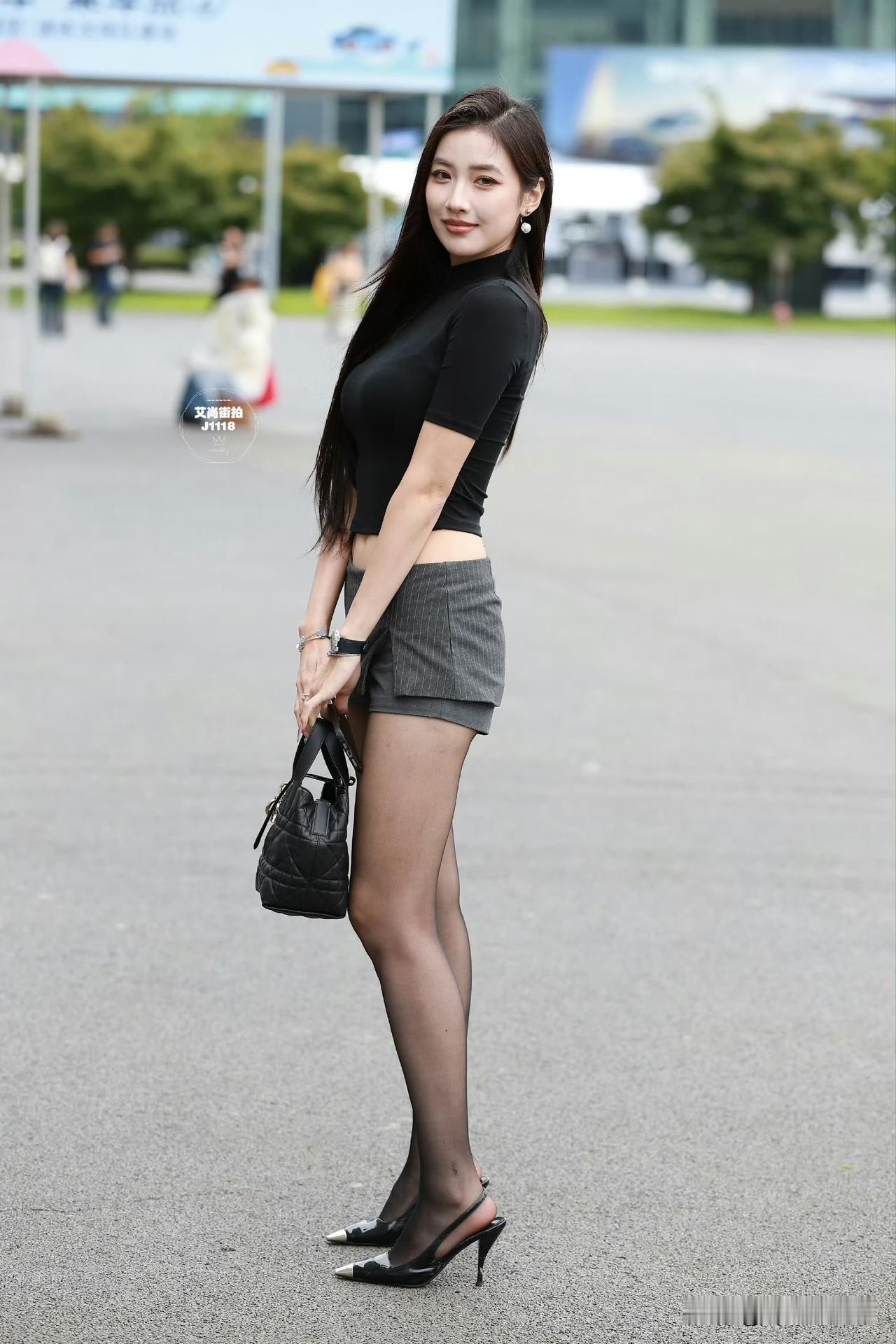 都市时尚少女,黑色短裙搭配高跟鞋,自信微笑,走在街头。
