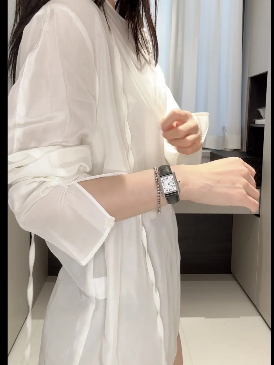 米白色收腰西装,搭配同色高跟鞋,清爽干练又精致。