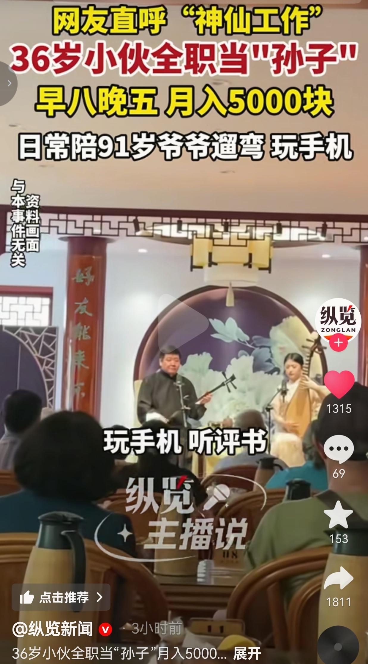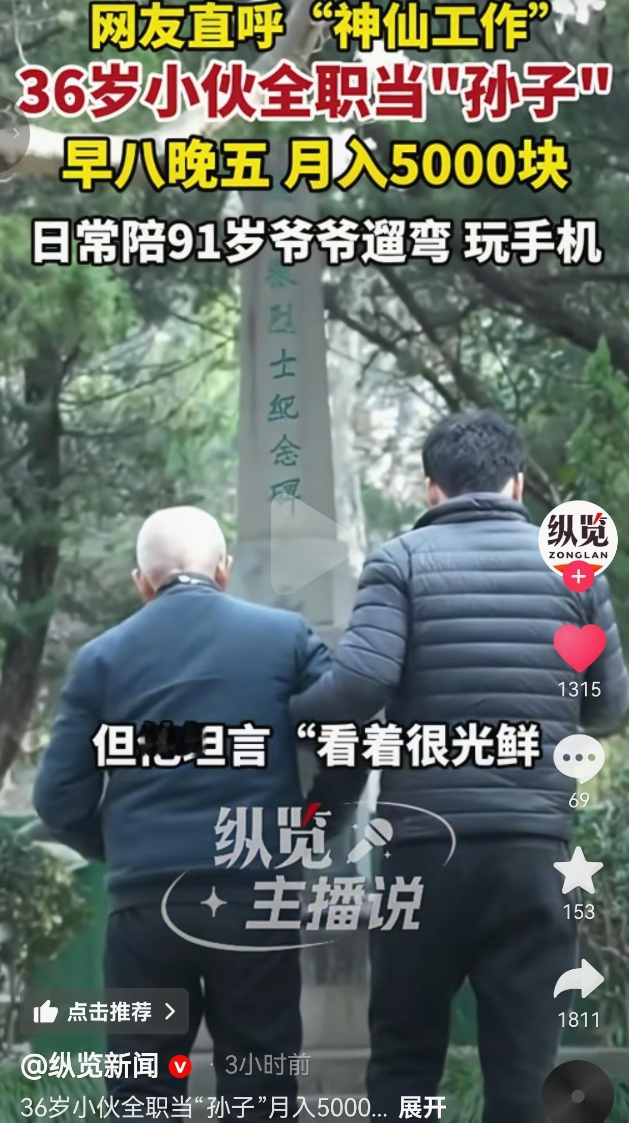 36岁的小伙,找了份“全职孙子”的工作,早八晚五,月入5000,日常就陪91岁爷爷遛弯、玩手机,近半个月最累的活,就只是拎了一次20斤大米!网友:这才是打工人的神仙工作!