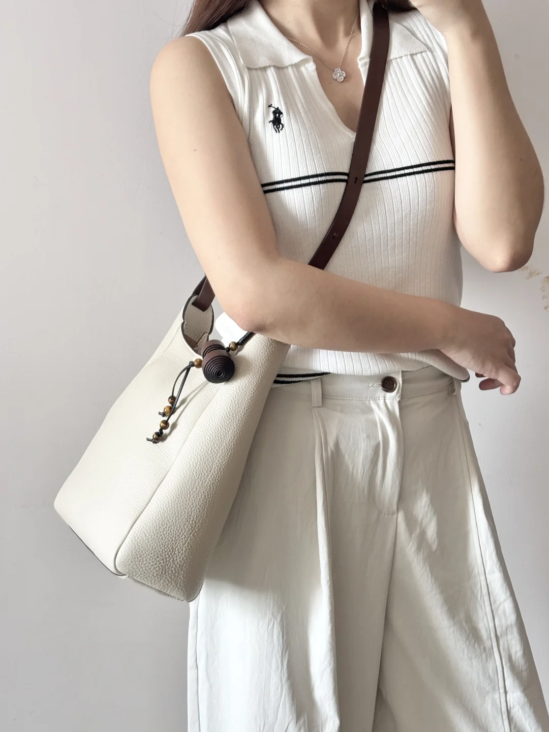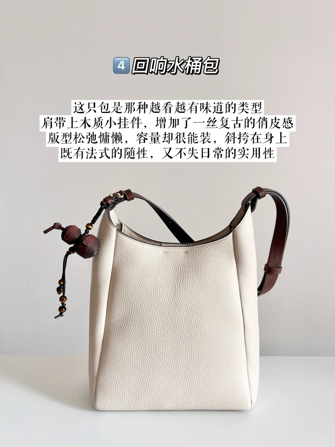 肩带上木质小挂件,增加了一丝复古的俏皮感
