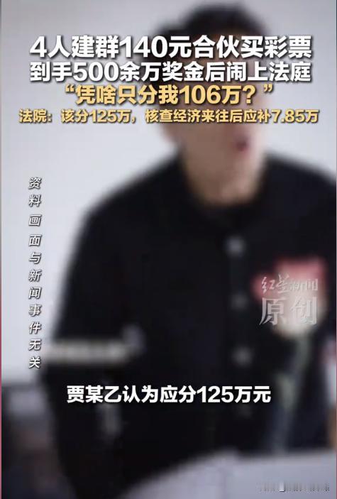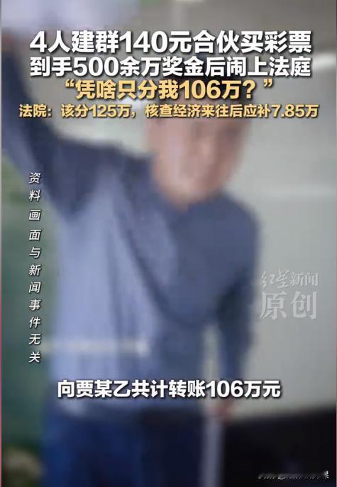 河南许昌,一男子与3个朋友一起合买彩票,花了140元中了个一等奖,税后奖金高达500多万元。男子去兑奖后,按约定每人应分得125万元,但其中一个朋友因欠男子钱,以及答应给男子10万元买车,所以男子直接给对方转了106万元。这下朋友不乐意了,多次要求男子返还差额,在遭到拒绝后,怒将男子告上法院。男子也怒了,指责朋友斤斤计较,本来都不打算给朋友分钱的。法院判了!