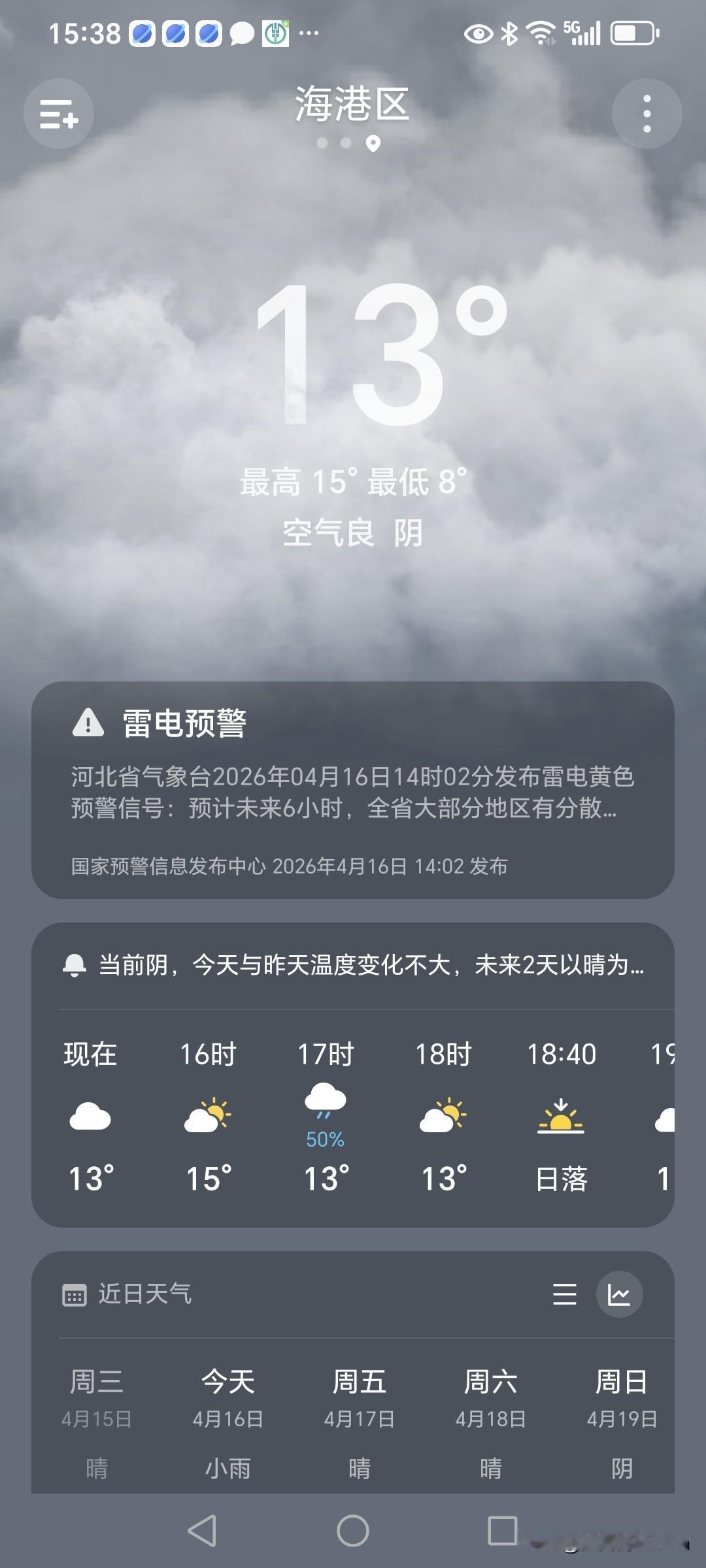 外面阴天,最高温度15度,最低温度8度,晴天还好些,不显得冷。