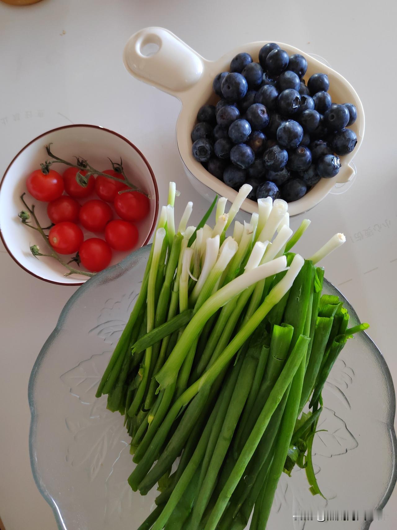 中不溜溜大小的蓝莓,20块钱一斤,我买了一斤,小葱一块钱一把,我买了两把。