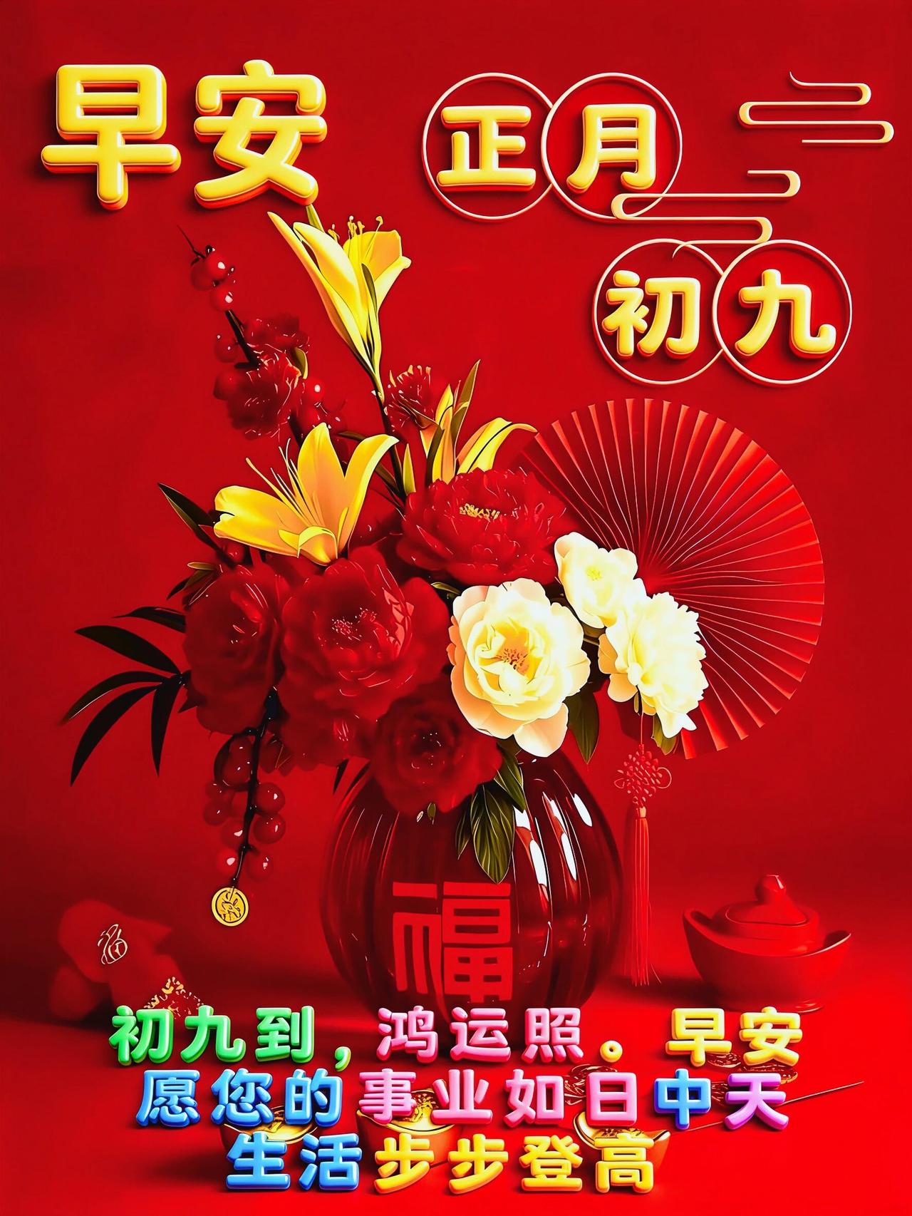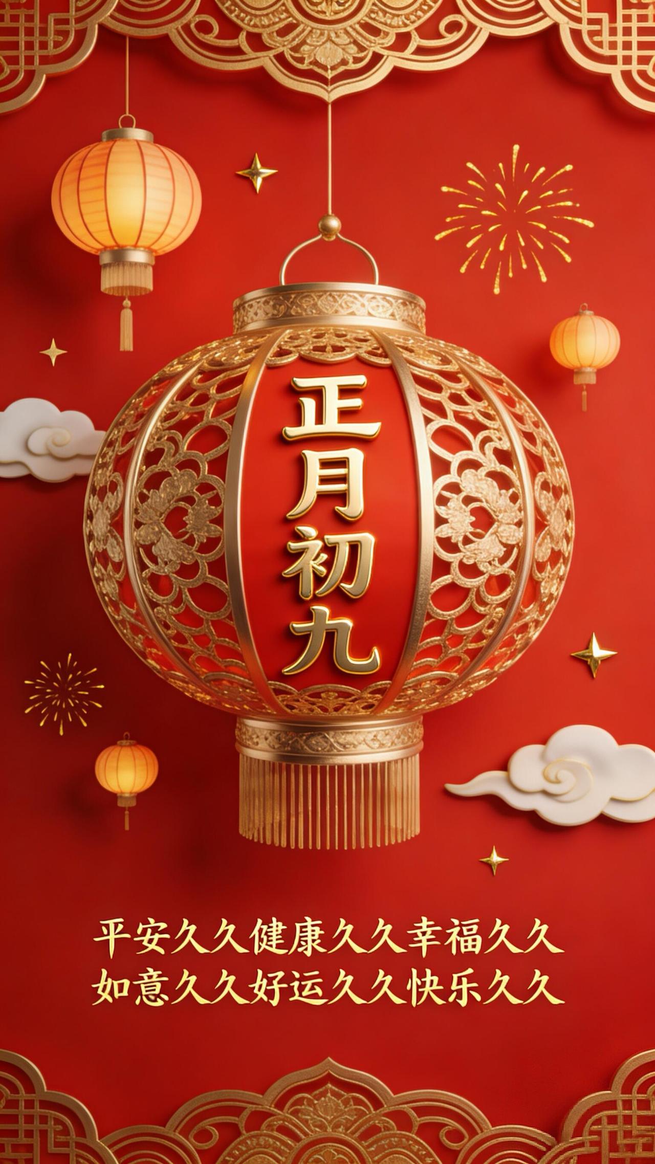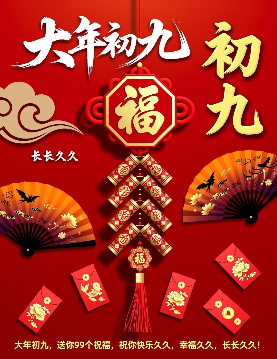 大年初九,长长久久!把最暖的九个祝福,送给最亲的你!一祝家人平安,二祝二老康健,三祝夫妻恩爱,四祝孩子拔尖!五祝邻里和睦,六祝财运连连,七祝笑口常开,八祝福气满满,九祝家和万事兴!愿这份幸福,陪你岁岁年年!