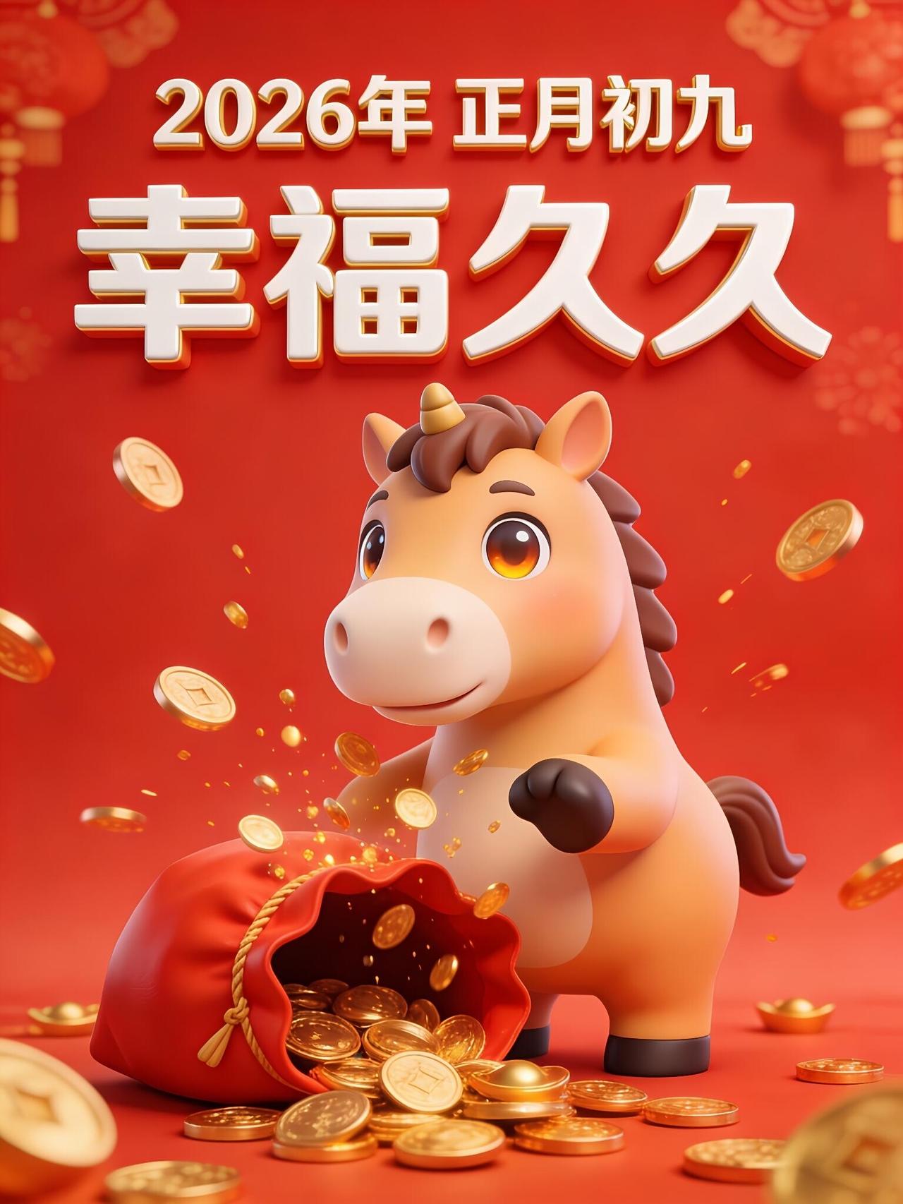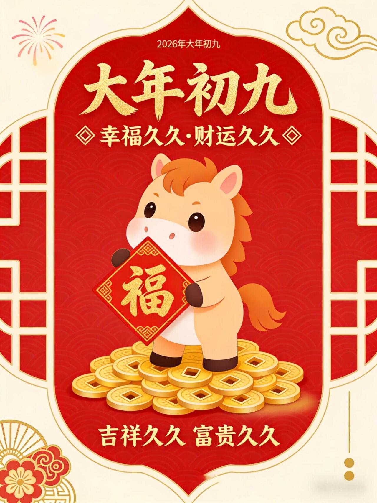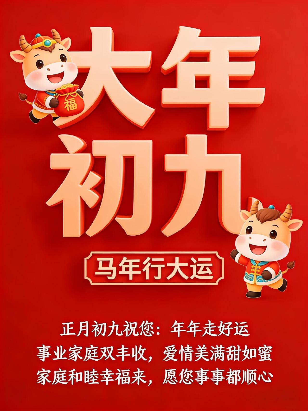 大年初九,长长久久!把最暖的九个祝福,送给最亲的你!一祝家人平安,二祝二老康健,三祝夫妻恩爱,四祝孩子拔尖!五祝邻里和睦,六祝财运连连,七祝笑口常开,八祝福气满满,九祝家和万事兴!愿这份幸福,陪你岁岁年年!