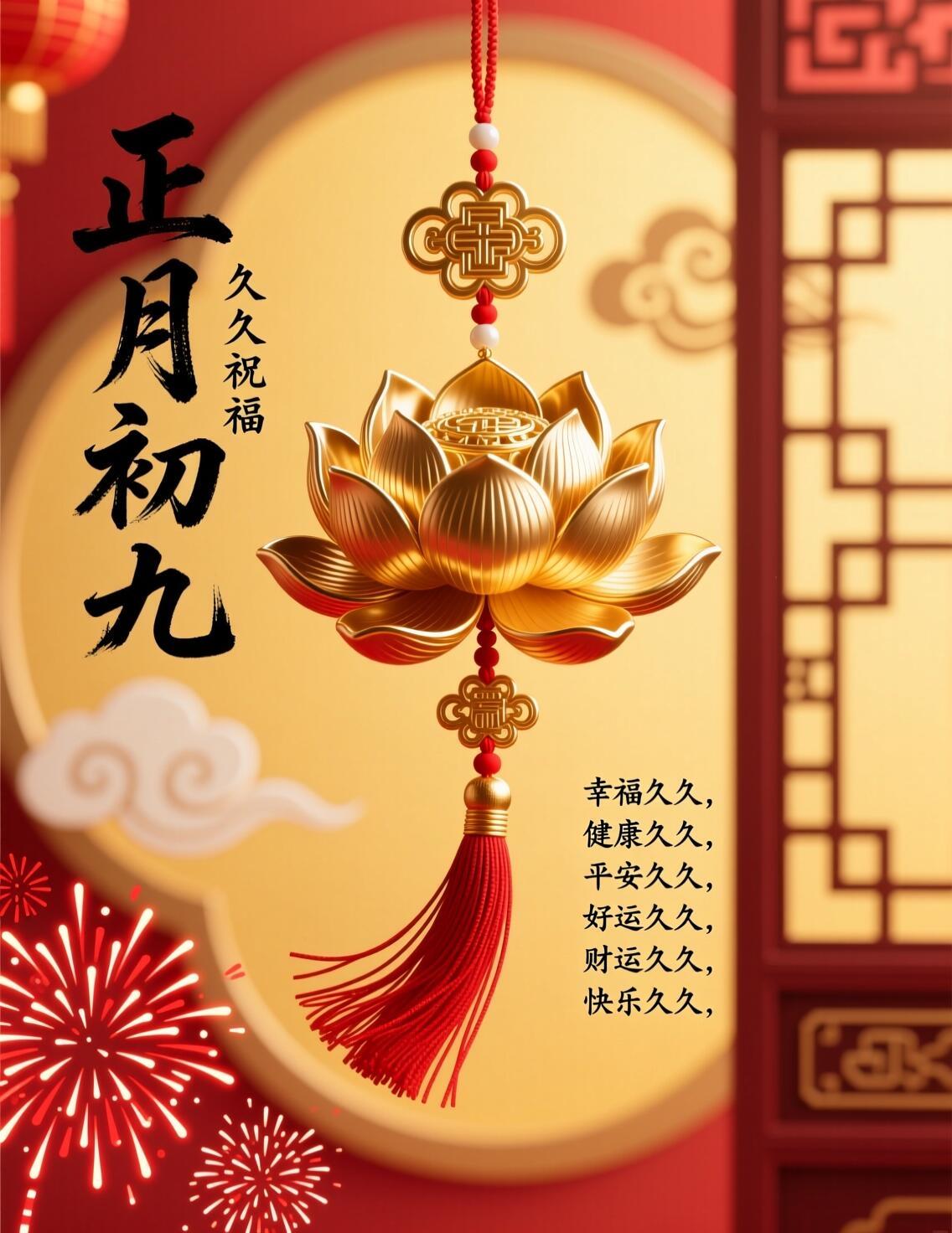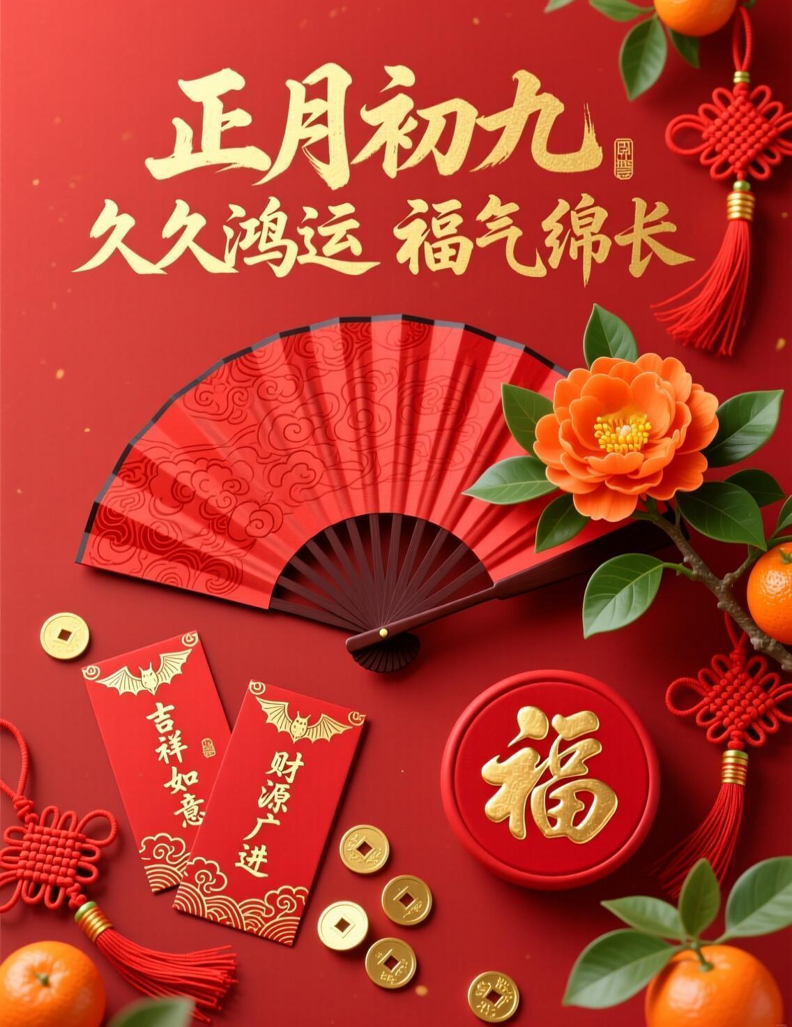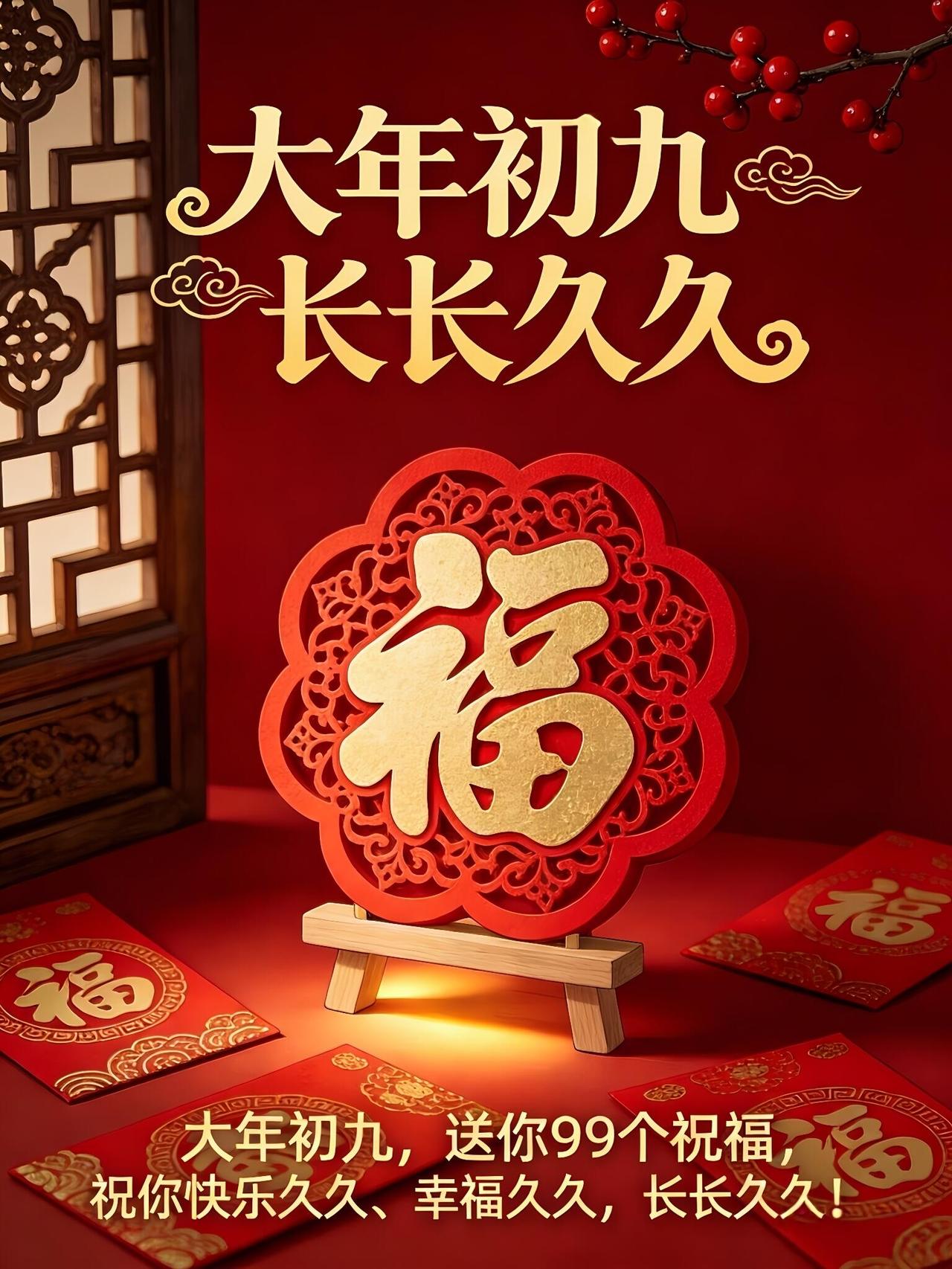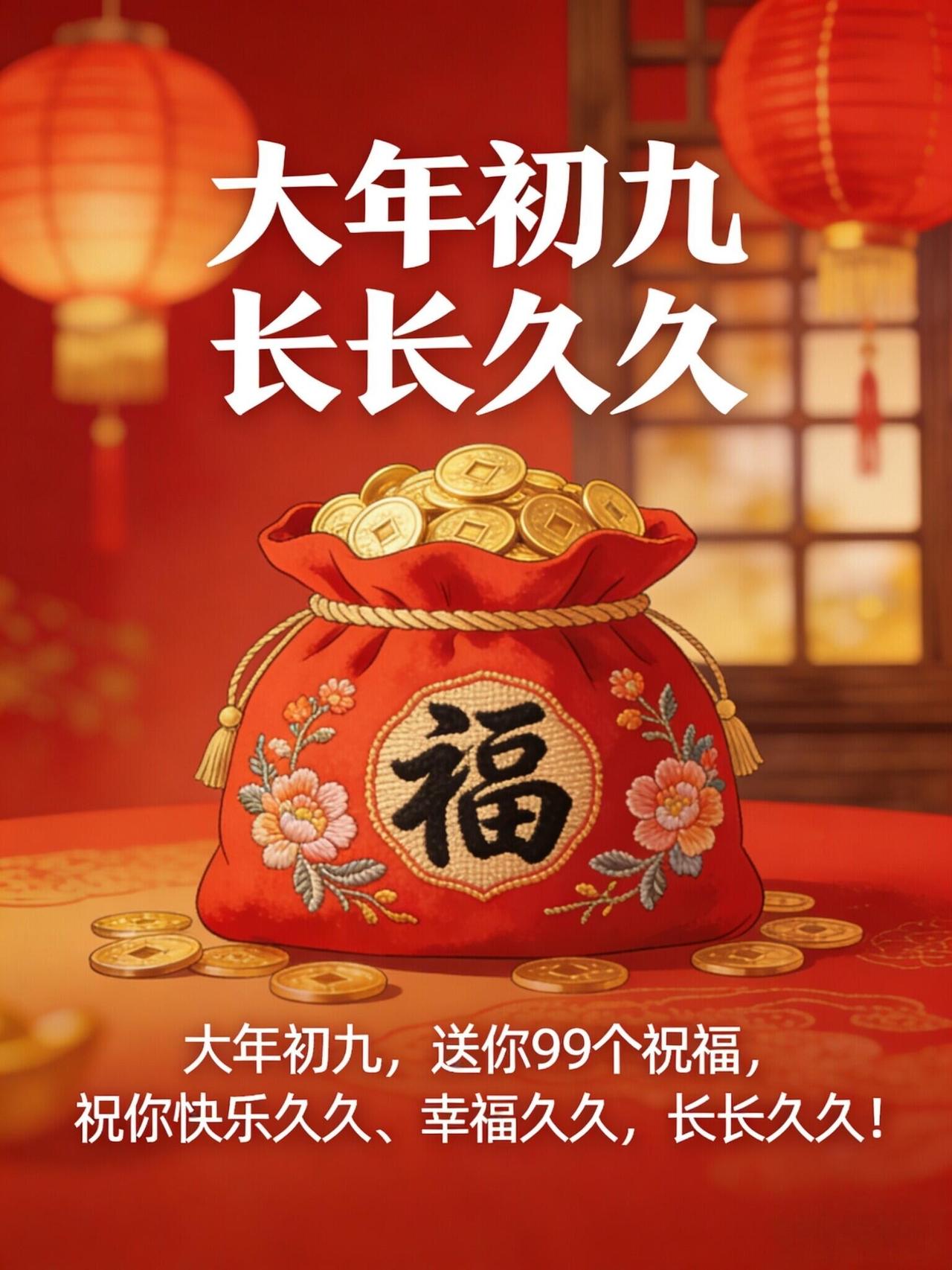 正月初九,福气依旧!九九的期盼,九九的挂牵,好事喜事把你围得团团转。健康久久,平安久久,愿你体魄强健活力久久;财运久久,福气久久,愿你腰包鼓鼓富足久久;顺心久久,开心久久,愿你马年大吉好运久久!