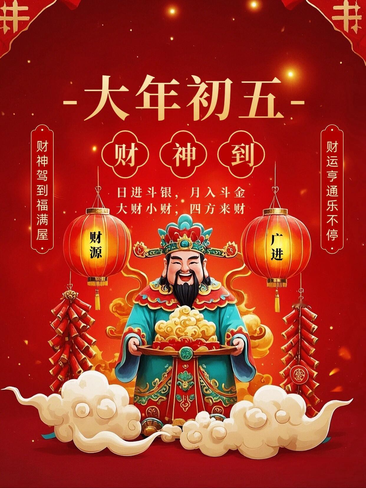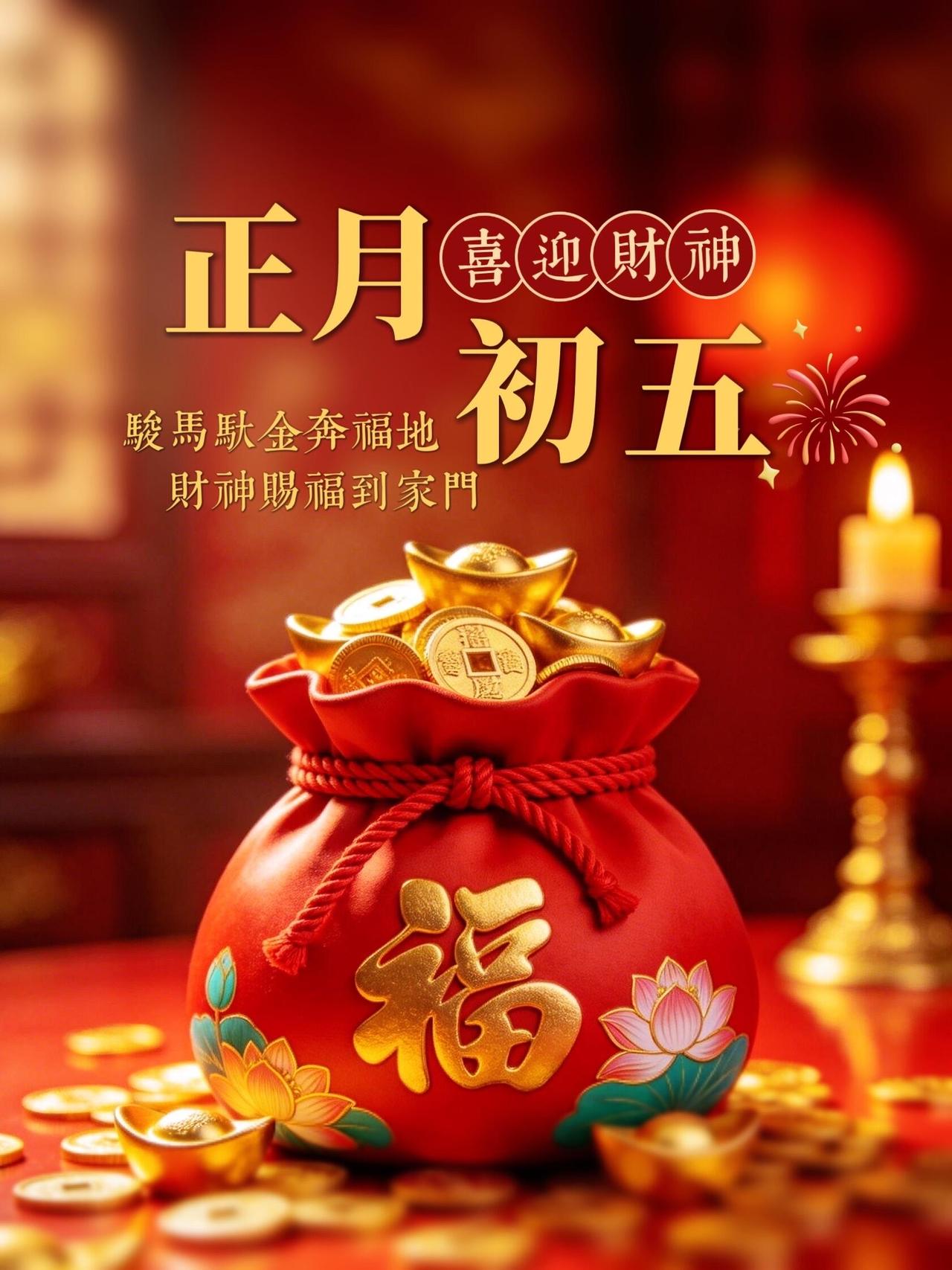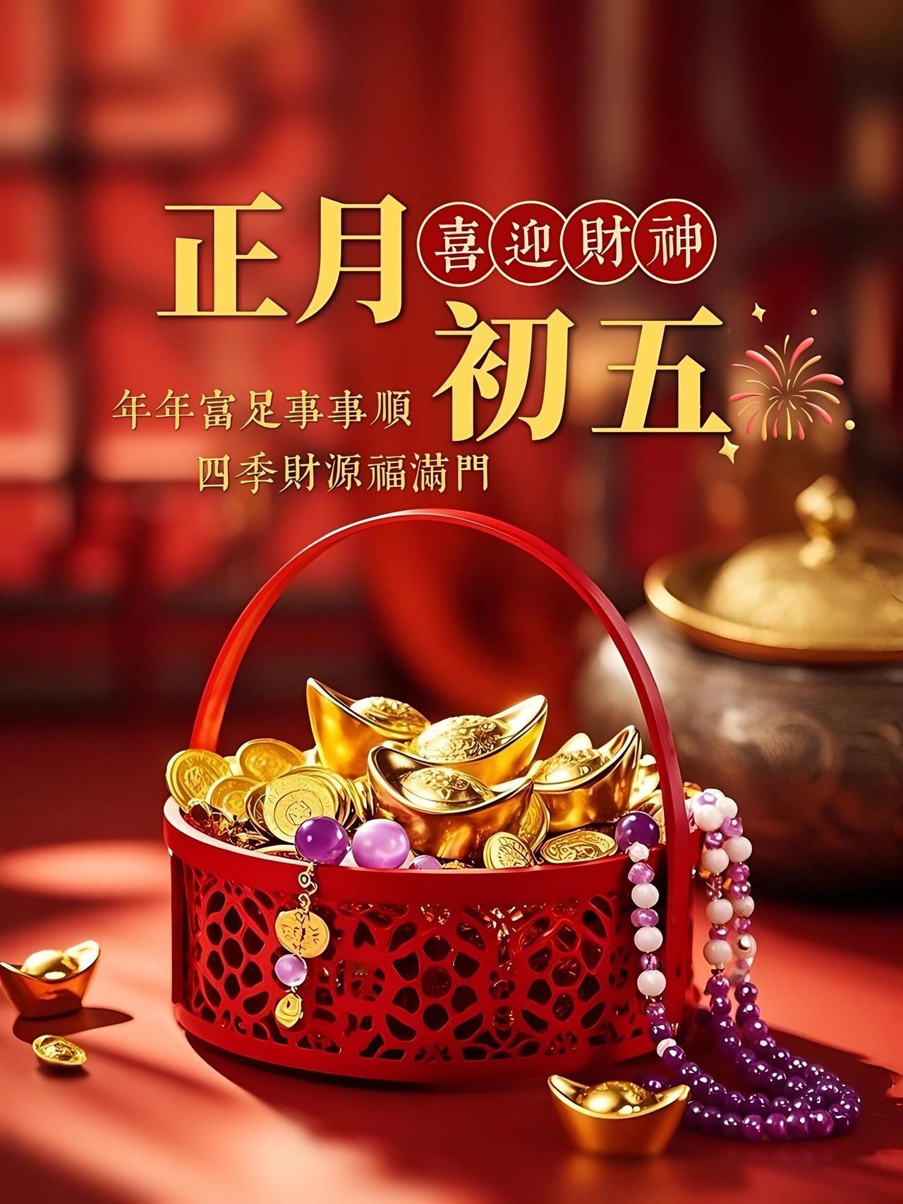 初五迎财神,朝富一朝,夕富一夕!百事皆顺,喜乐安宁,万事顺遂。身安福安,岁岁团圆