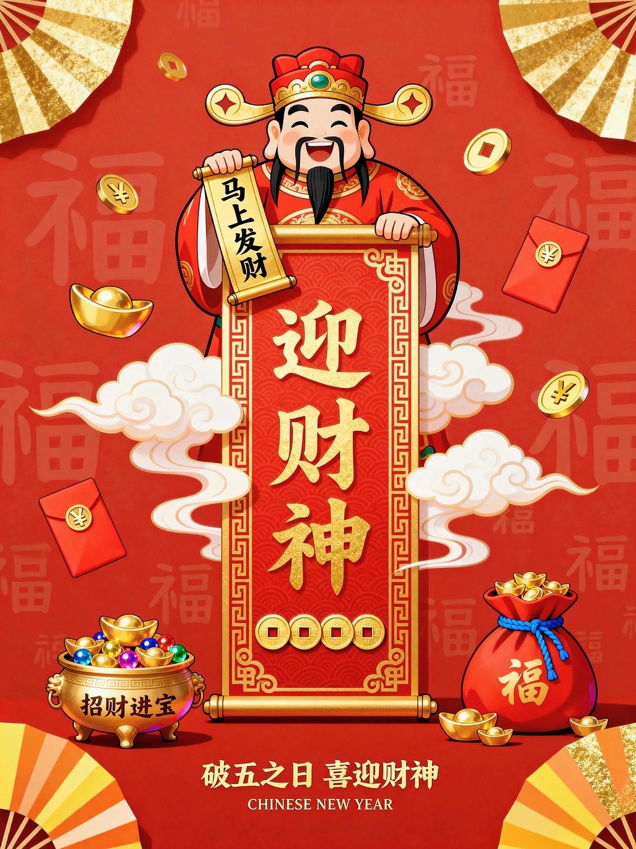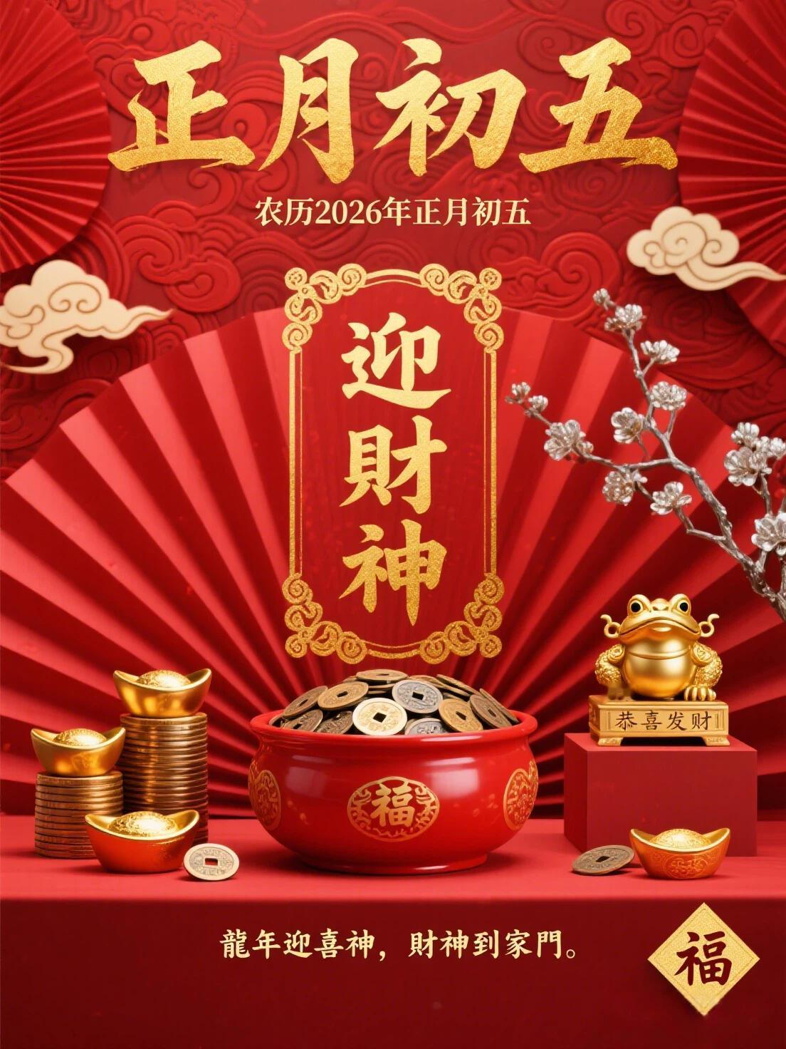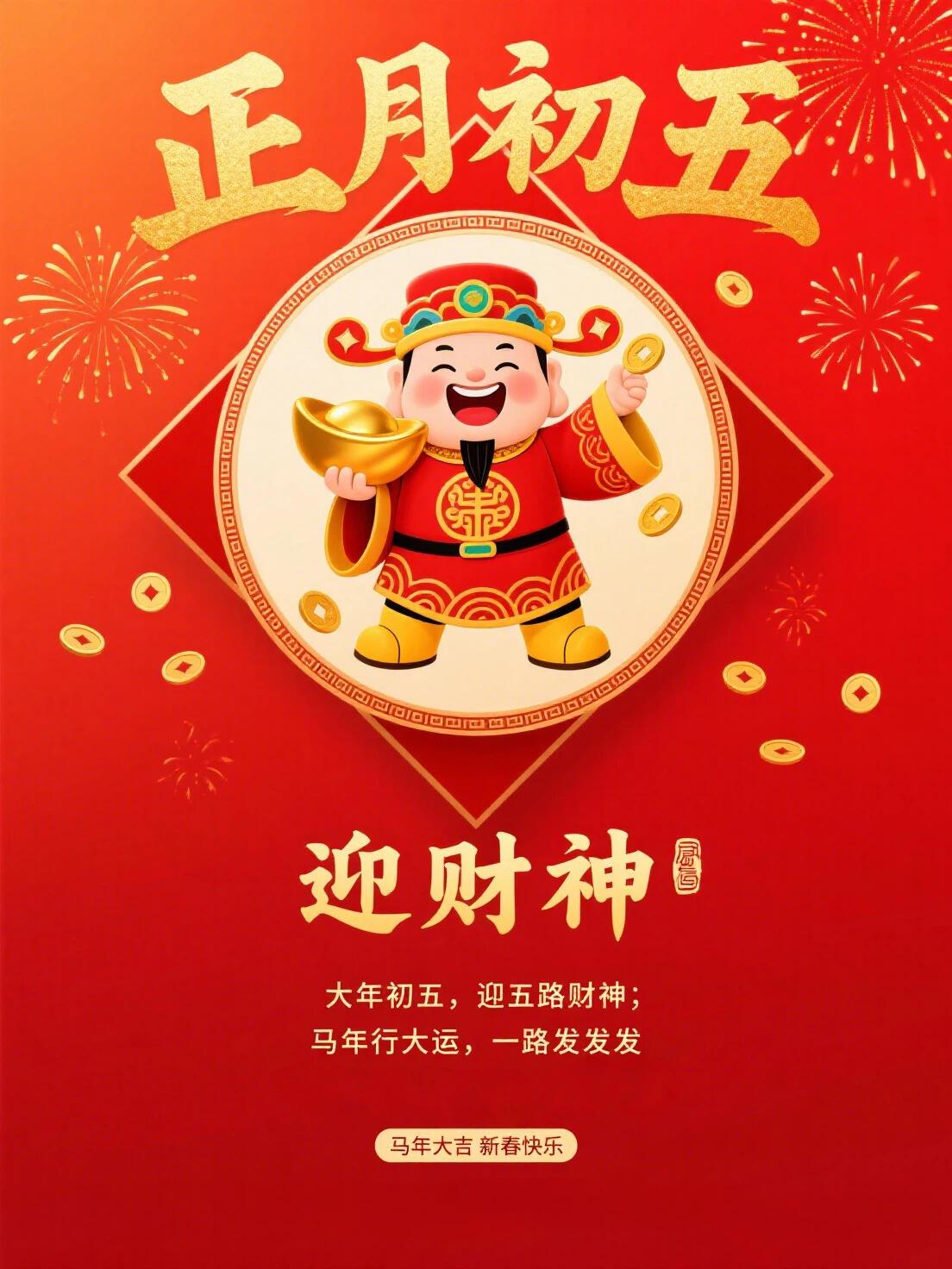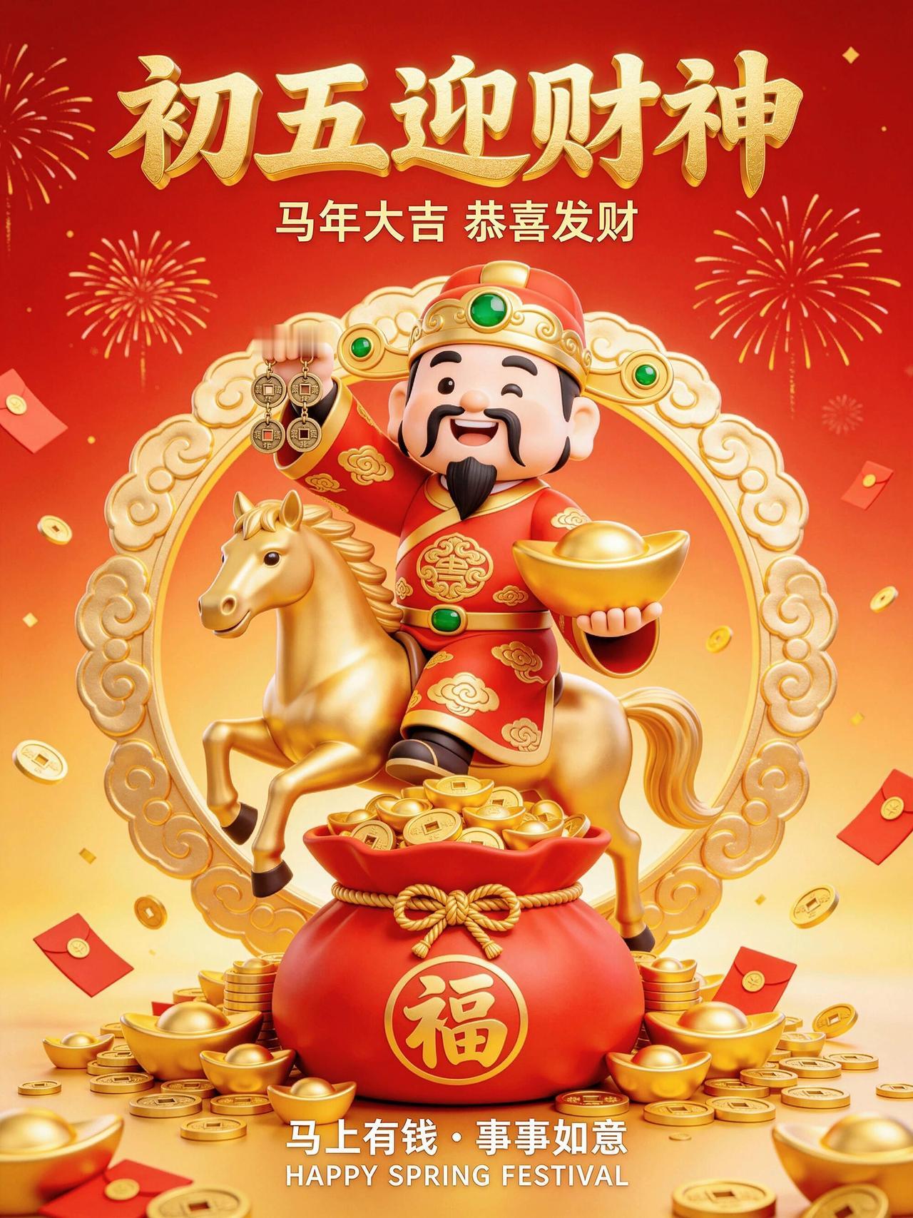 初五迎财神,朝富一朝,夕富一夕!百事皆顺,喜乐安宁,万事顺遂。身安福安,岁岁团圆