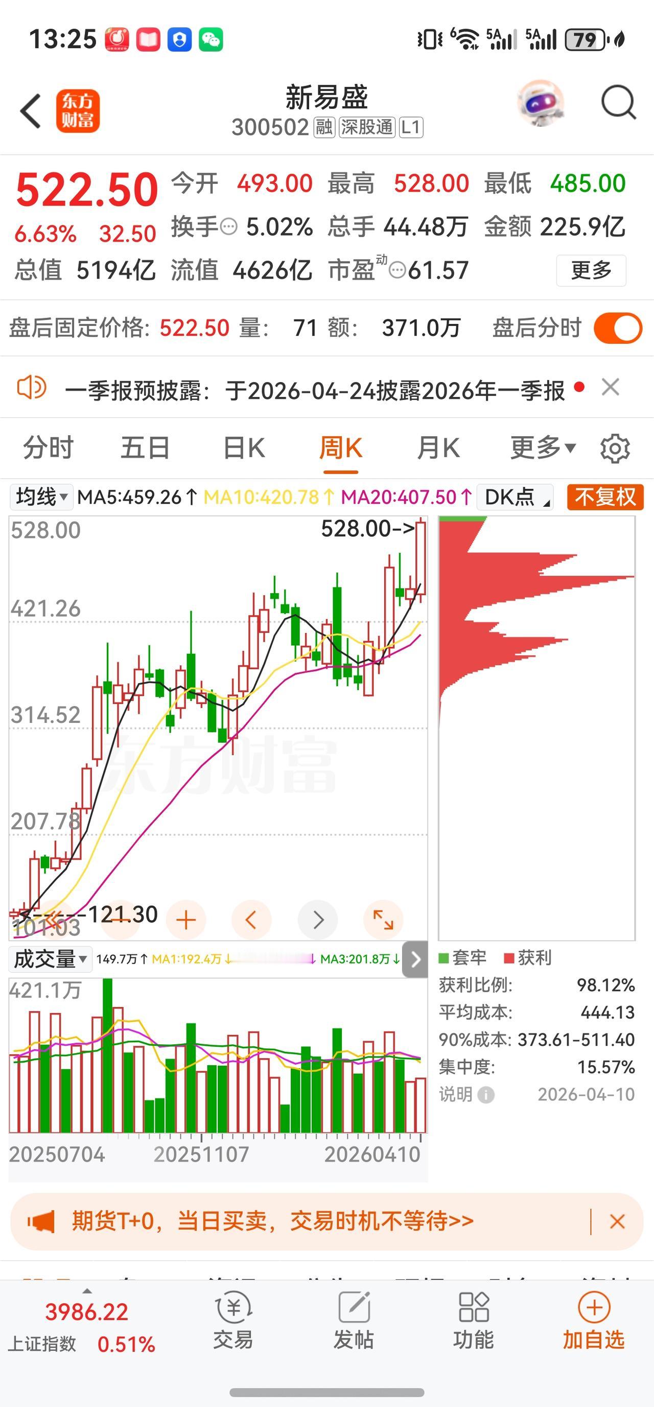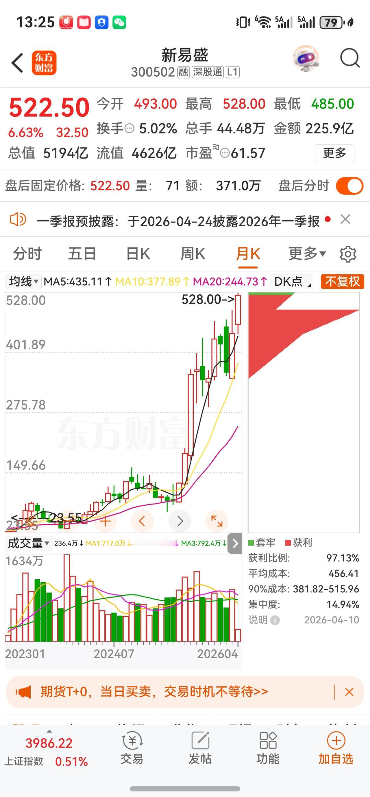 4月10日 522.50元 +6.63% 225.95亿元 5.02% 盘中最高528元创历史新高,总市值站上5193.70亿元。