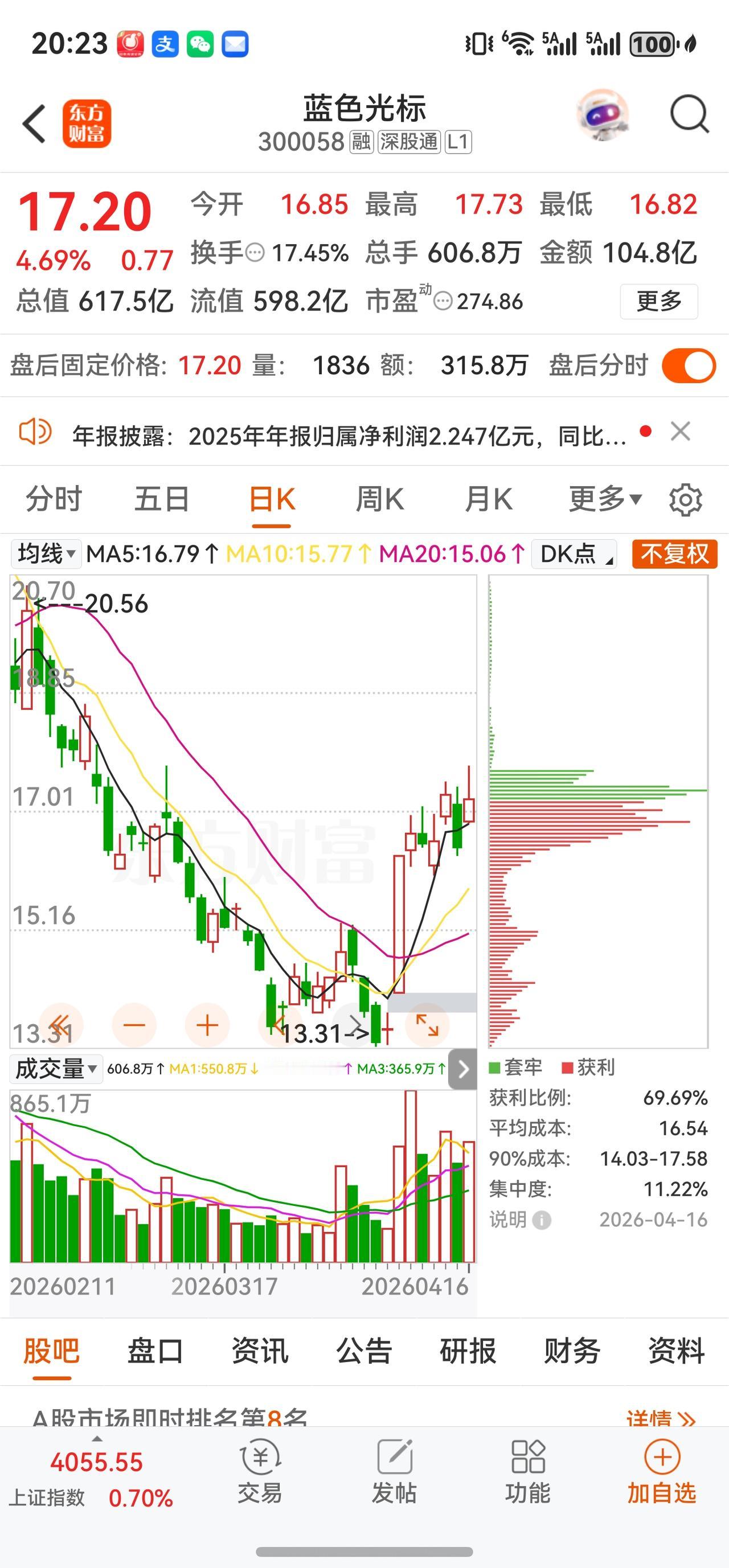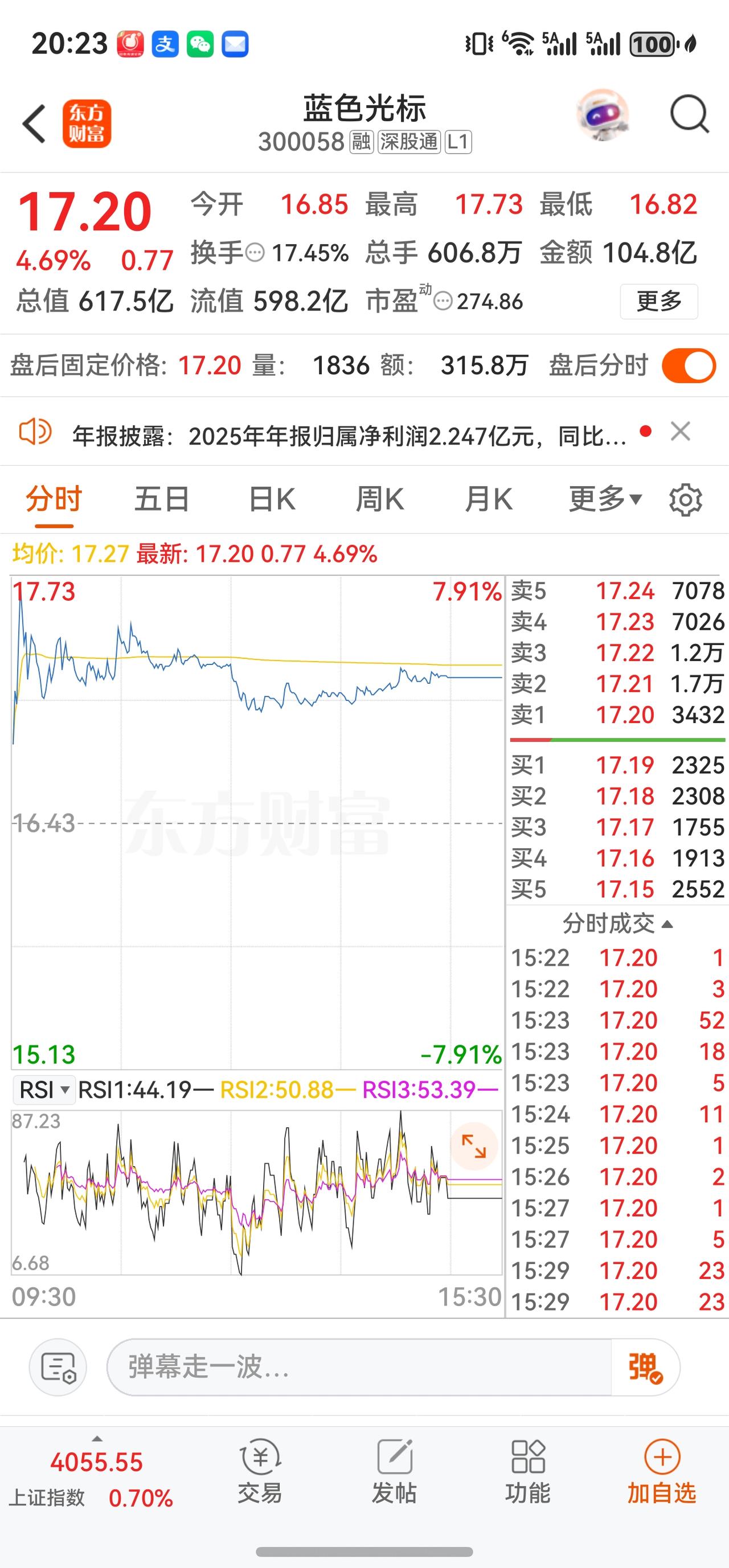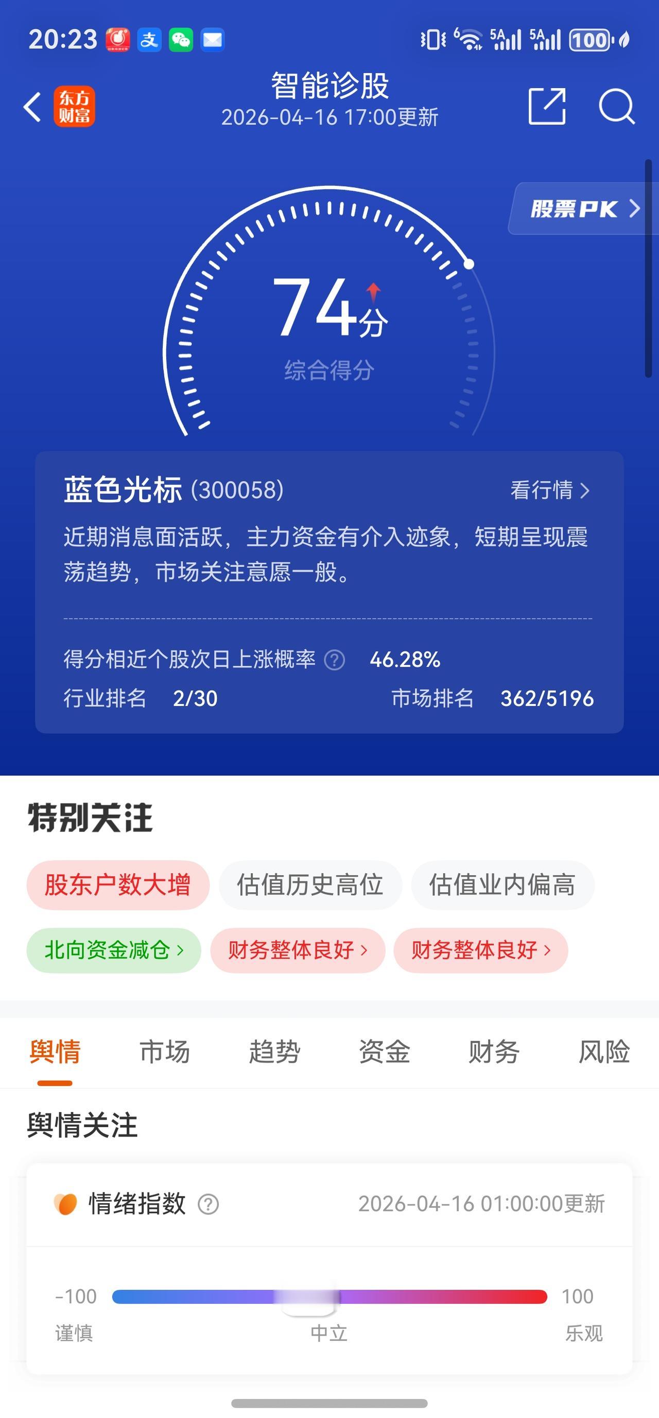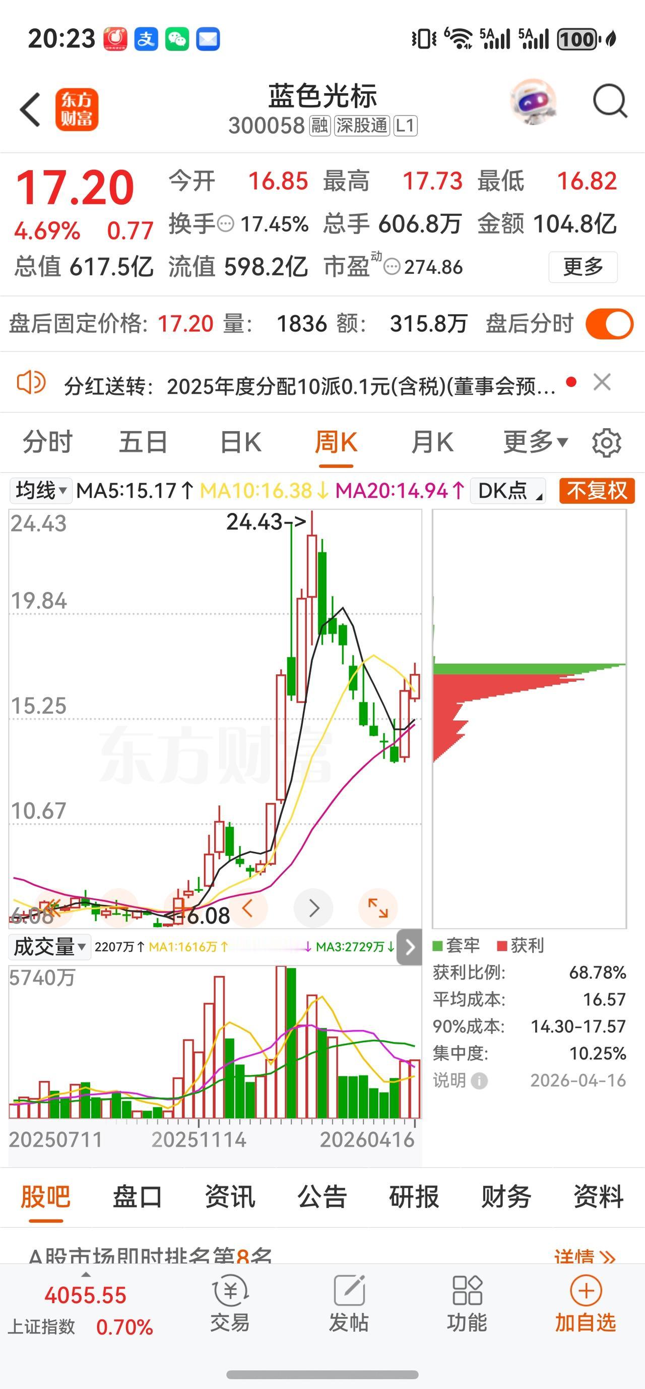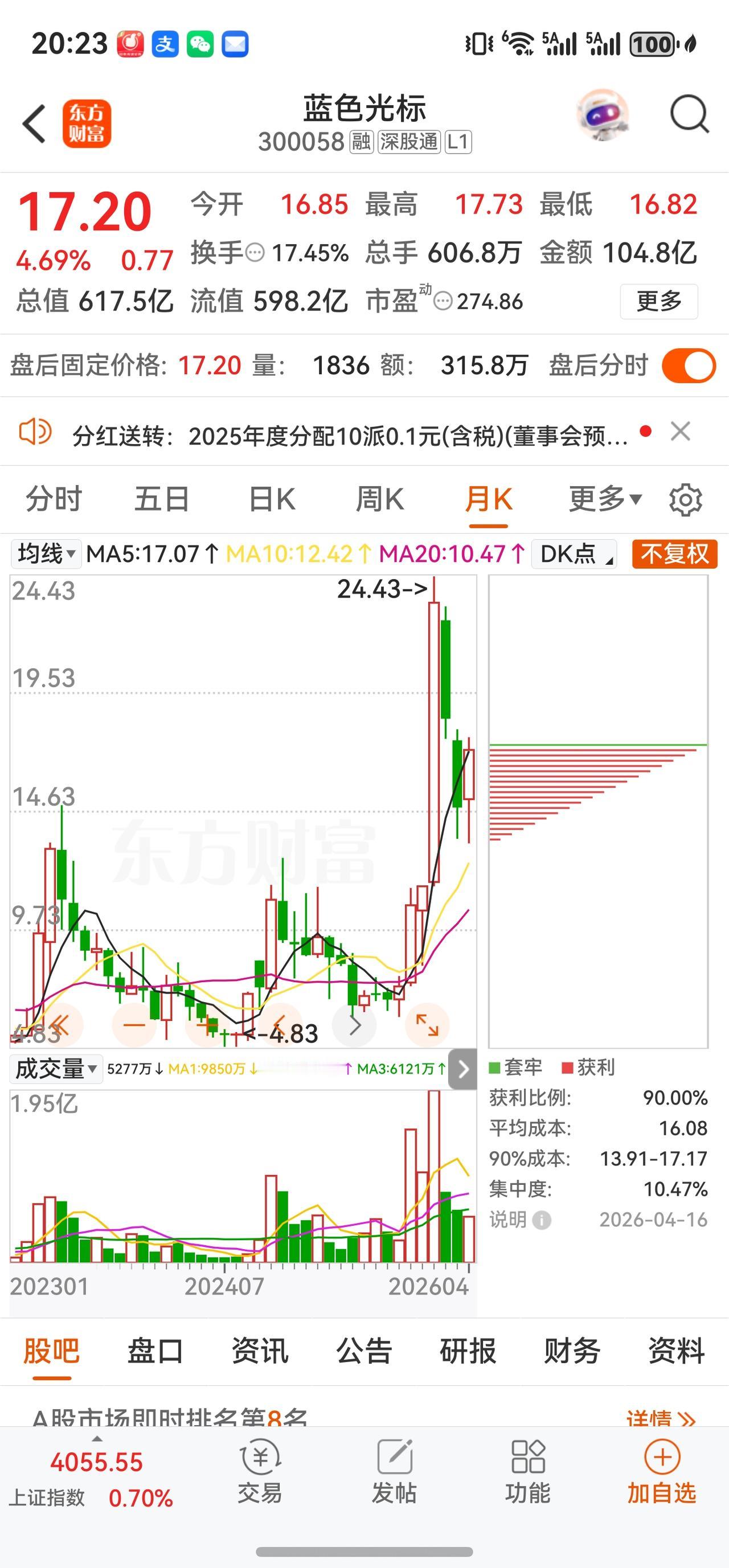 2026年4月16日,蓝色光标全天交投异常活跃,股价收于 17.20元,上涨4.69%,盘中最高触及17.73元,振幅5.54%。