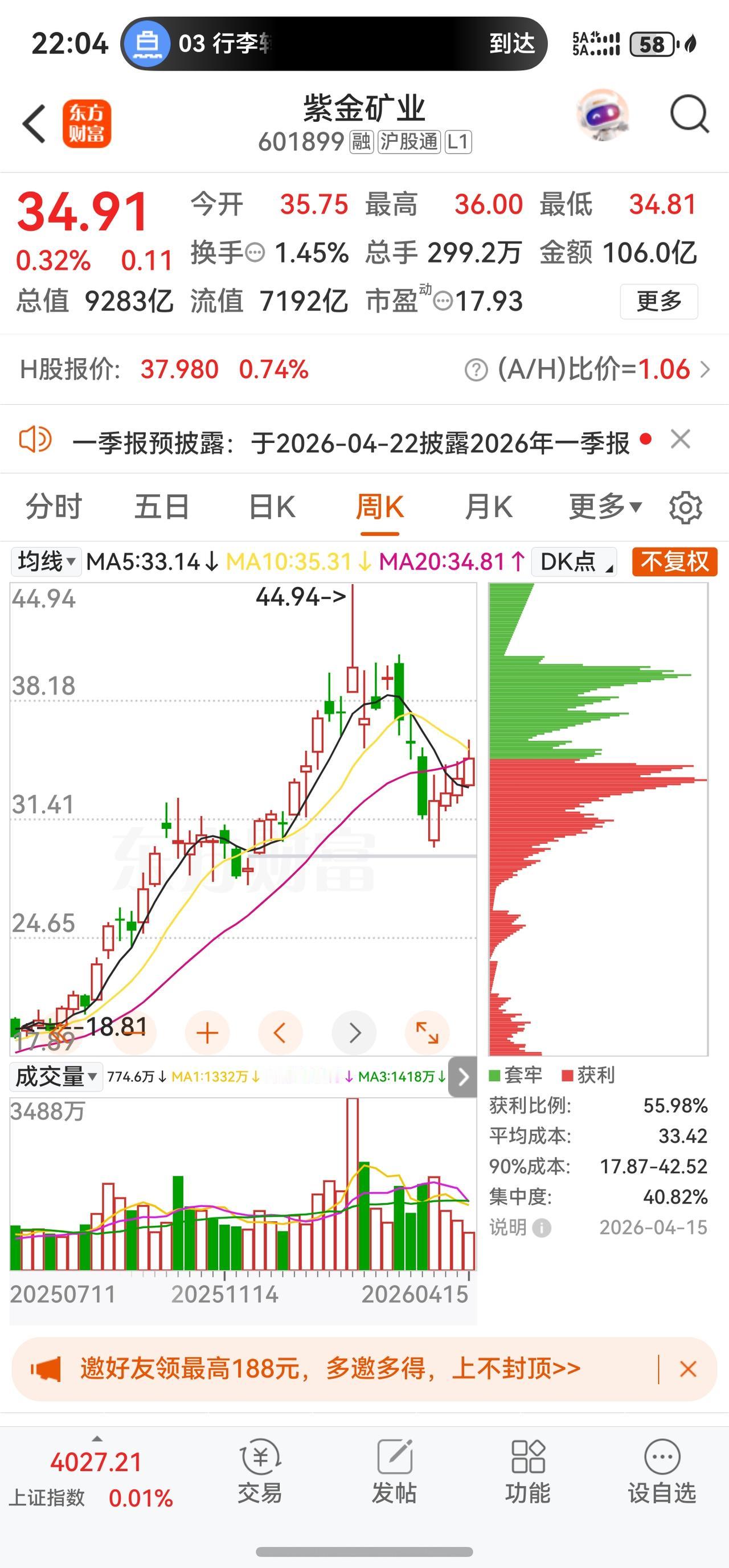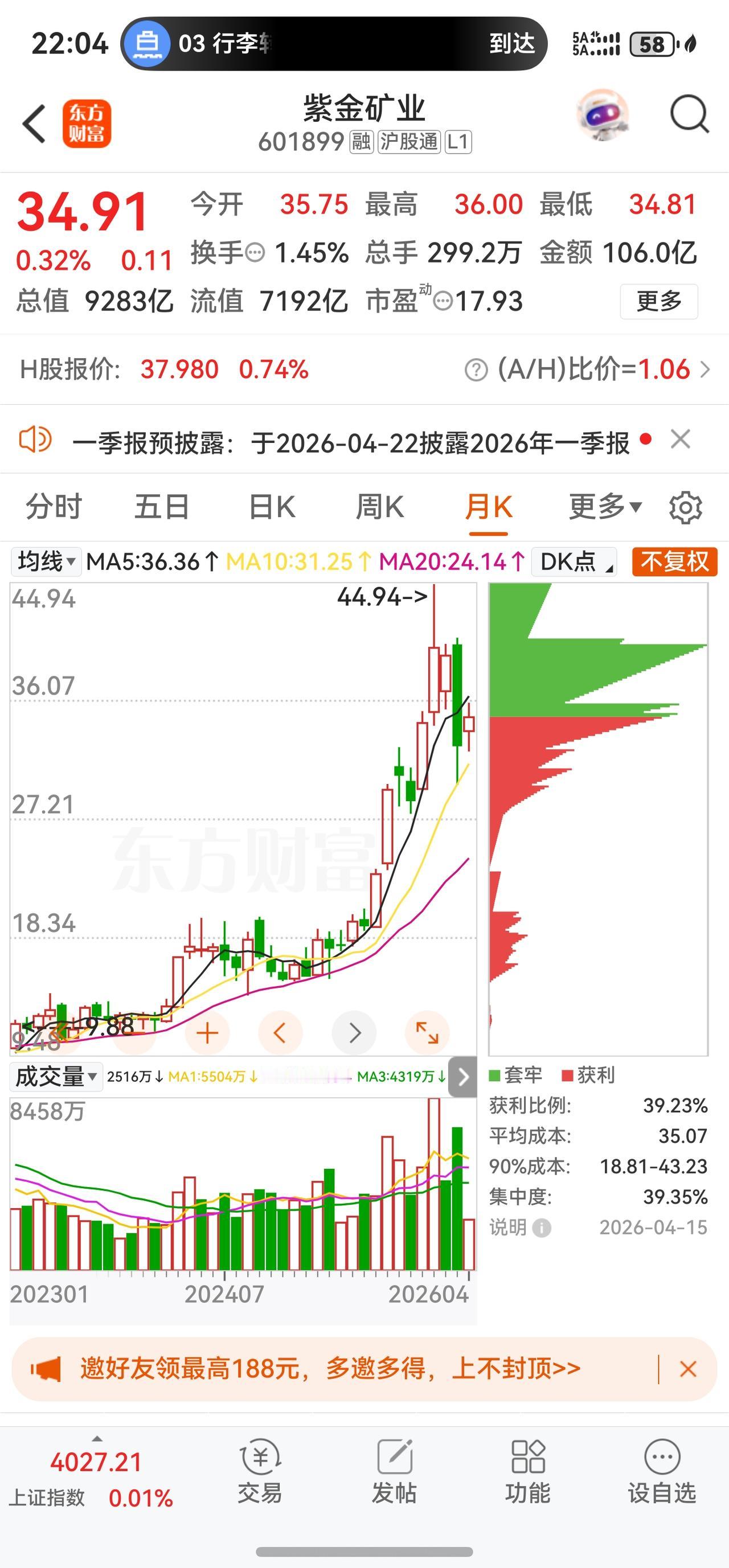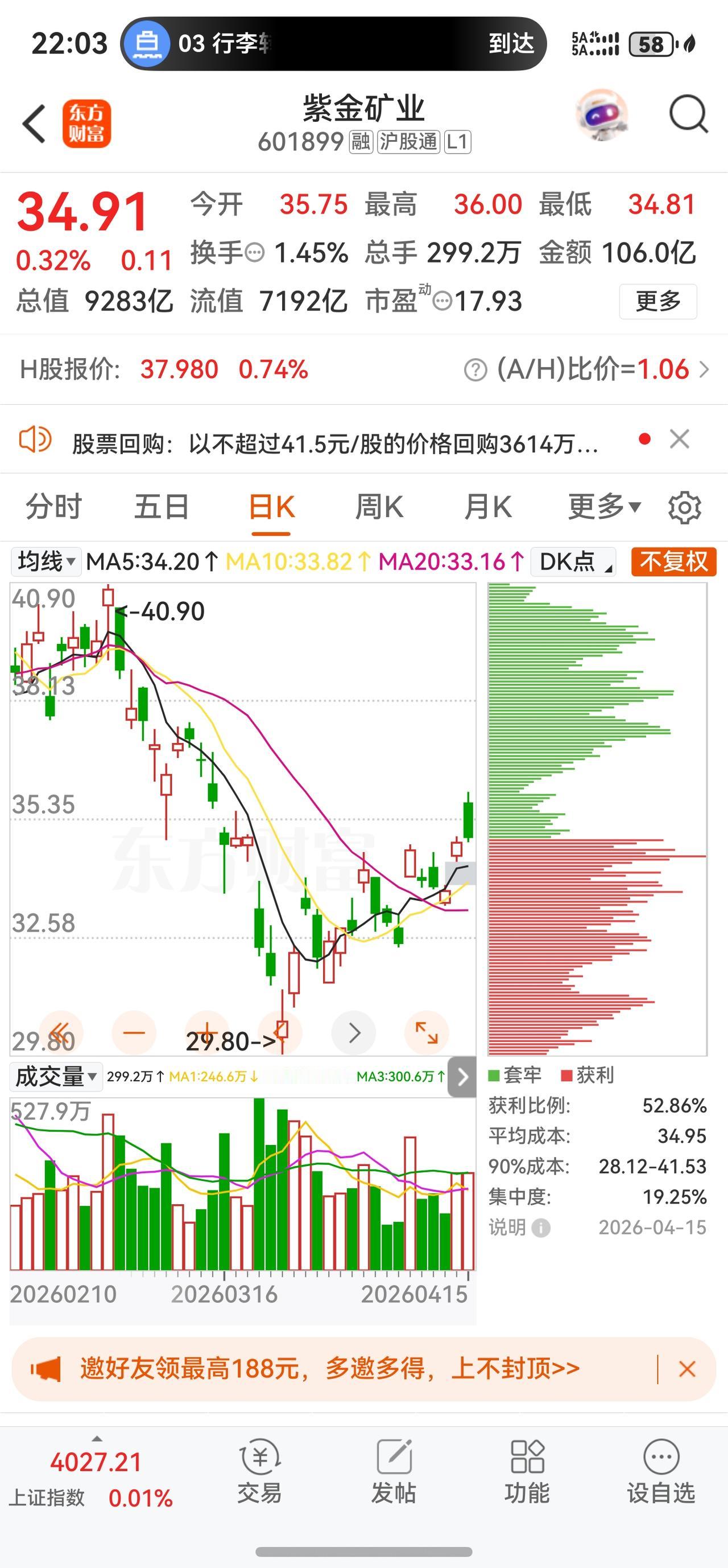 2026年4月15日,紫金矿业A股全天小幅收涨,报收34.91元,上涨0.32%。全天振幅3.42%,成交299.18万手,成交额105.98亿元,换手率1.45%,量比1.11。盘中最高触及36.00元,最低下探34.81元。该股目前在新浪财经客户端A股市场人气排名第8名,市场关注度极高。总市值随之上行至9282.82亿元。