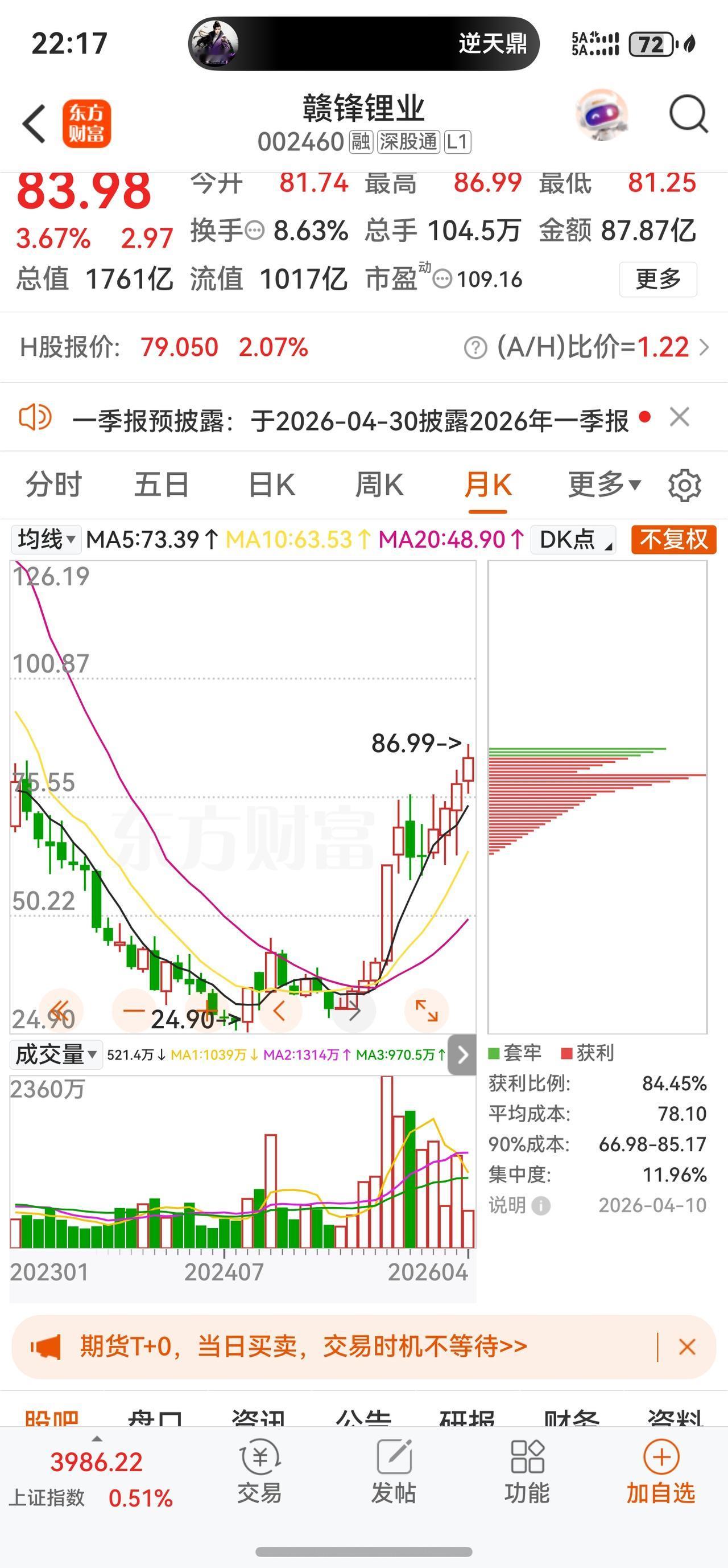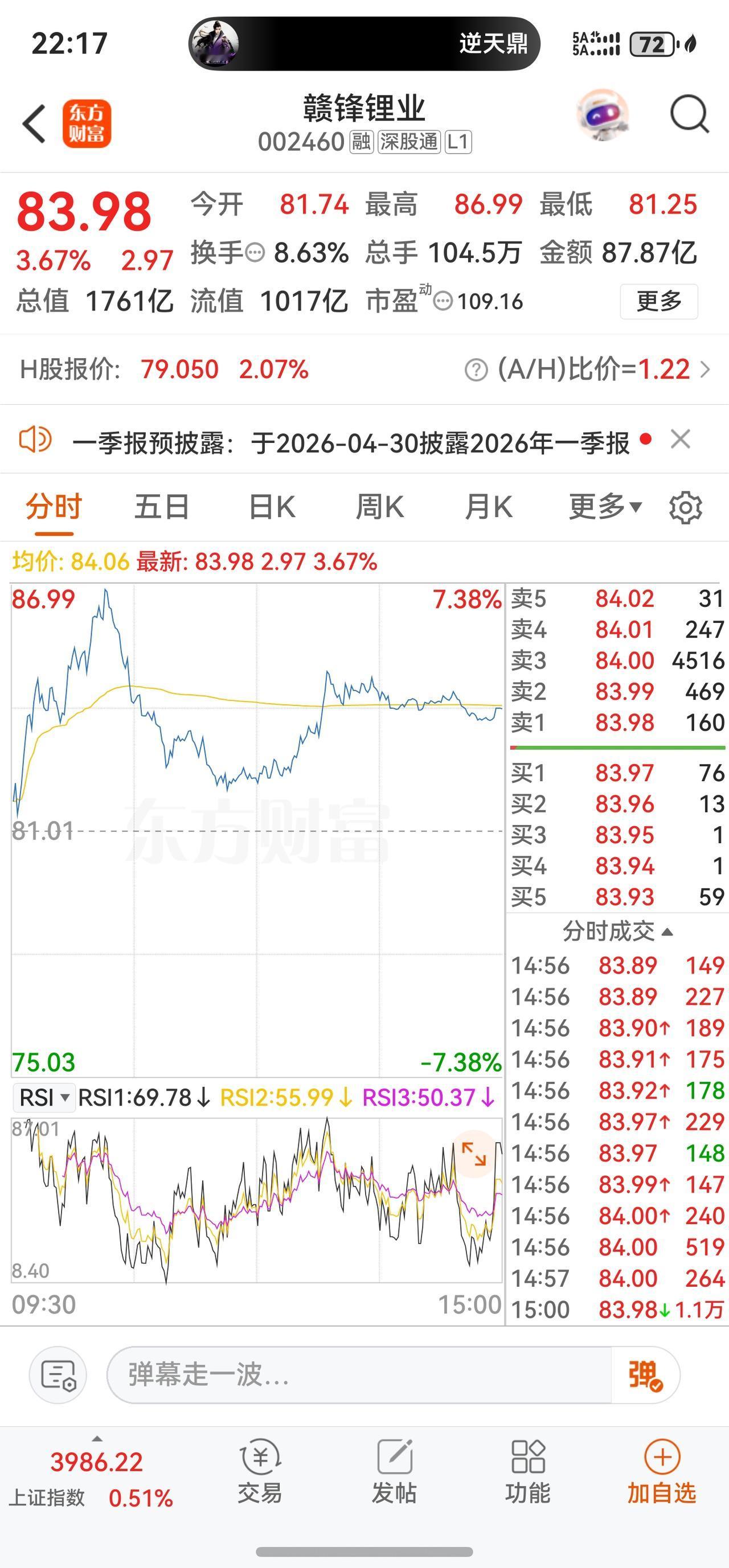 截至4月10日收盘,该股报83.98元,较上周的79.75元上涨5.30%。本周股价从78.96元低点启动,一度触及86.99元高点,周内振幅达11.7%,换手率8.63%创近阶段新高。当前动态市盈率约109.17倍,总市值1760.80亿元,在能源金属板块市值排名第1位。