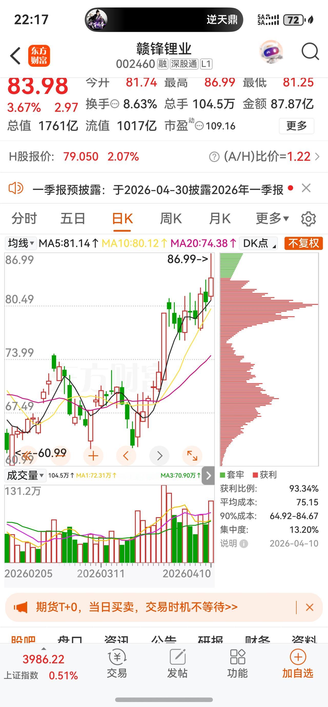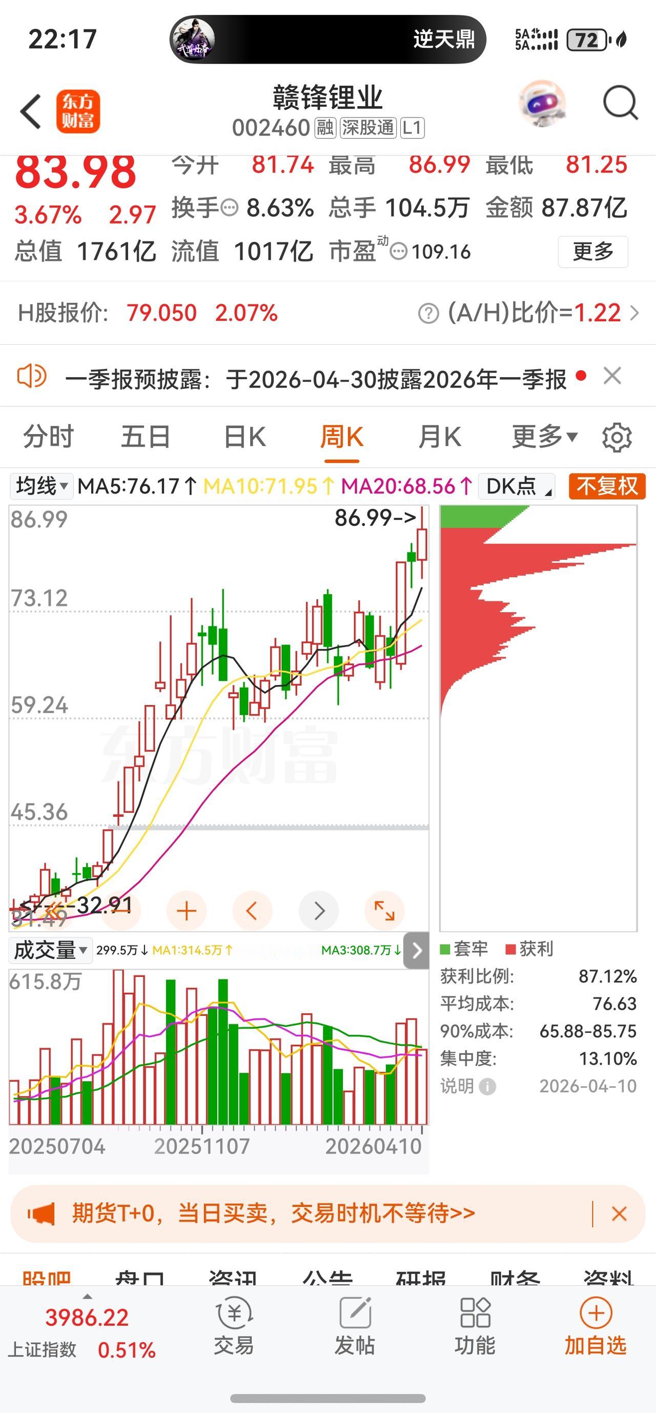 2026年4月7日至10日,赣锋锂业A股震荡上行,周涨幅5.30%,股价创近一年新高。