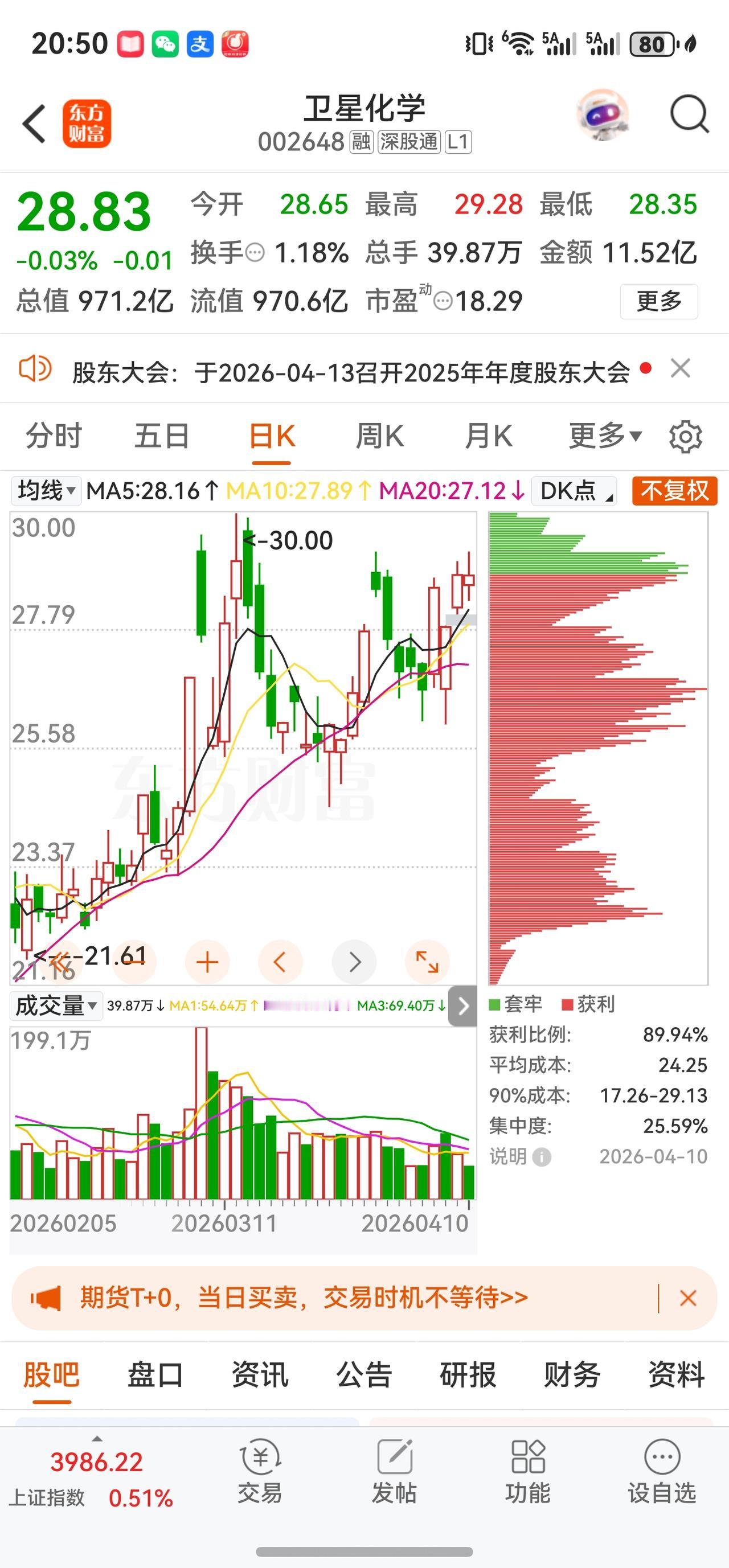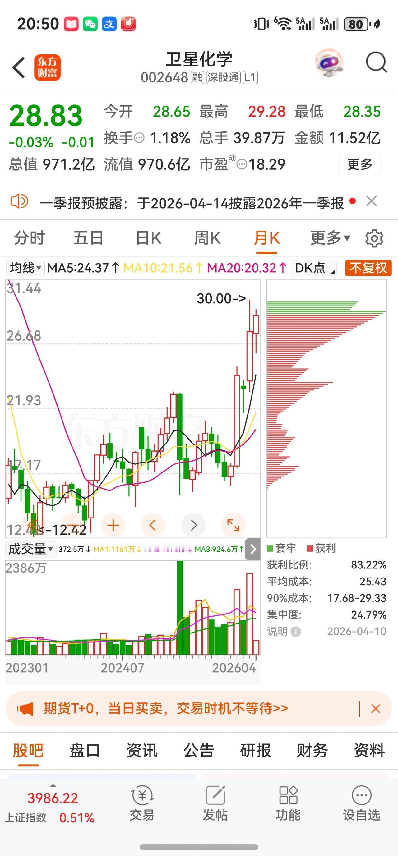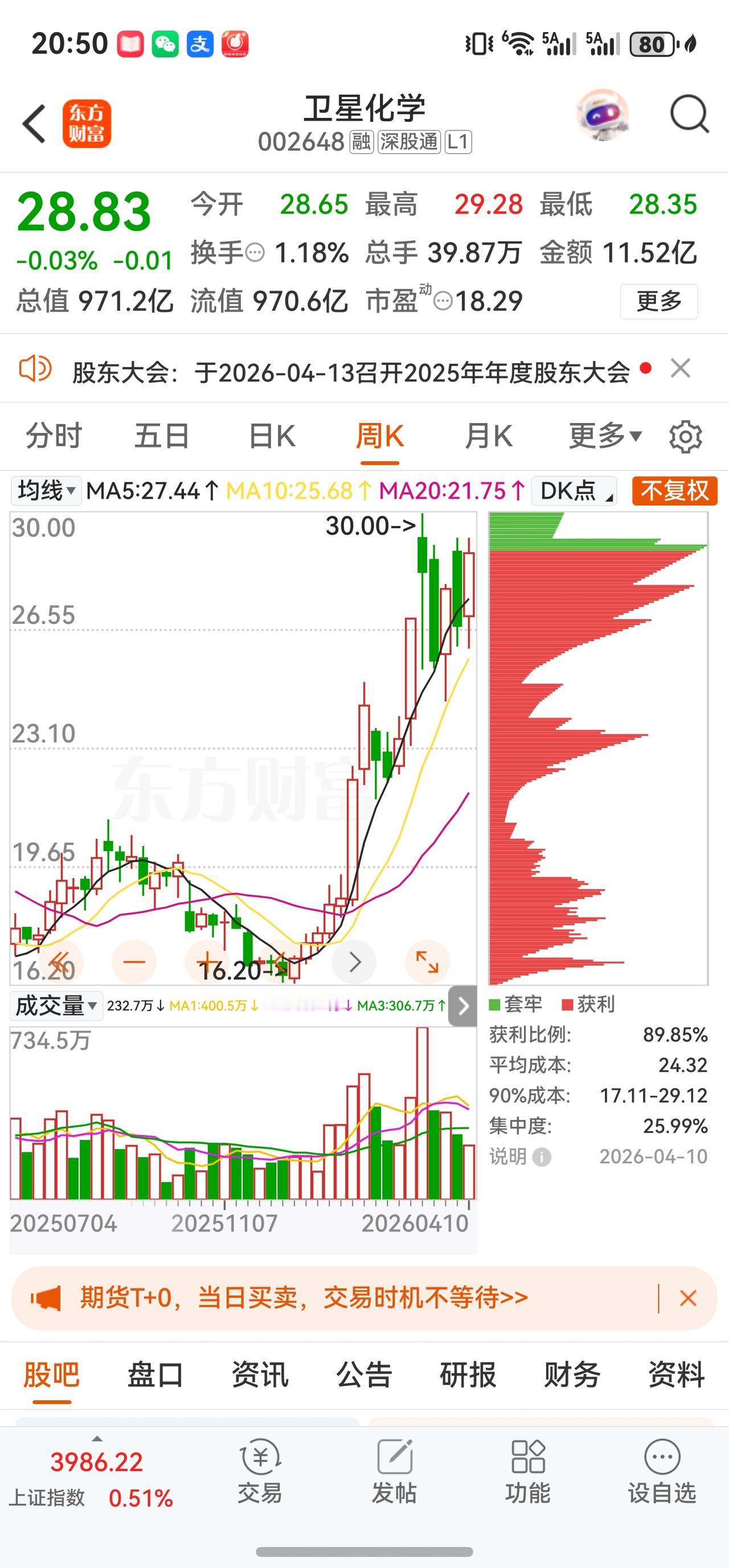 截至4月10日(本周四)收盘,卫星化学报收28.83元,较上周五(4月3日)的26.67元累计上涨约8.10%,实现逆势反弹。动态市盈率约18.29倍,总市值回升至约971亿元。