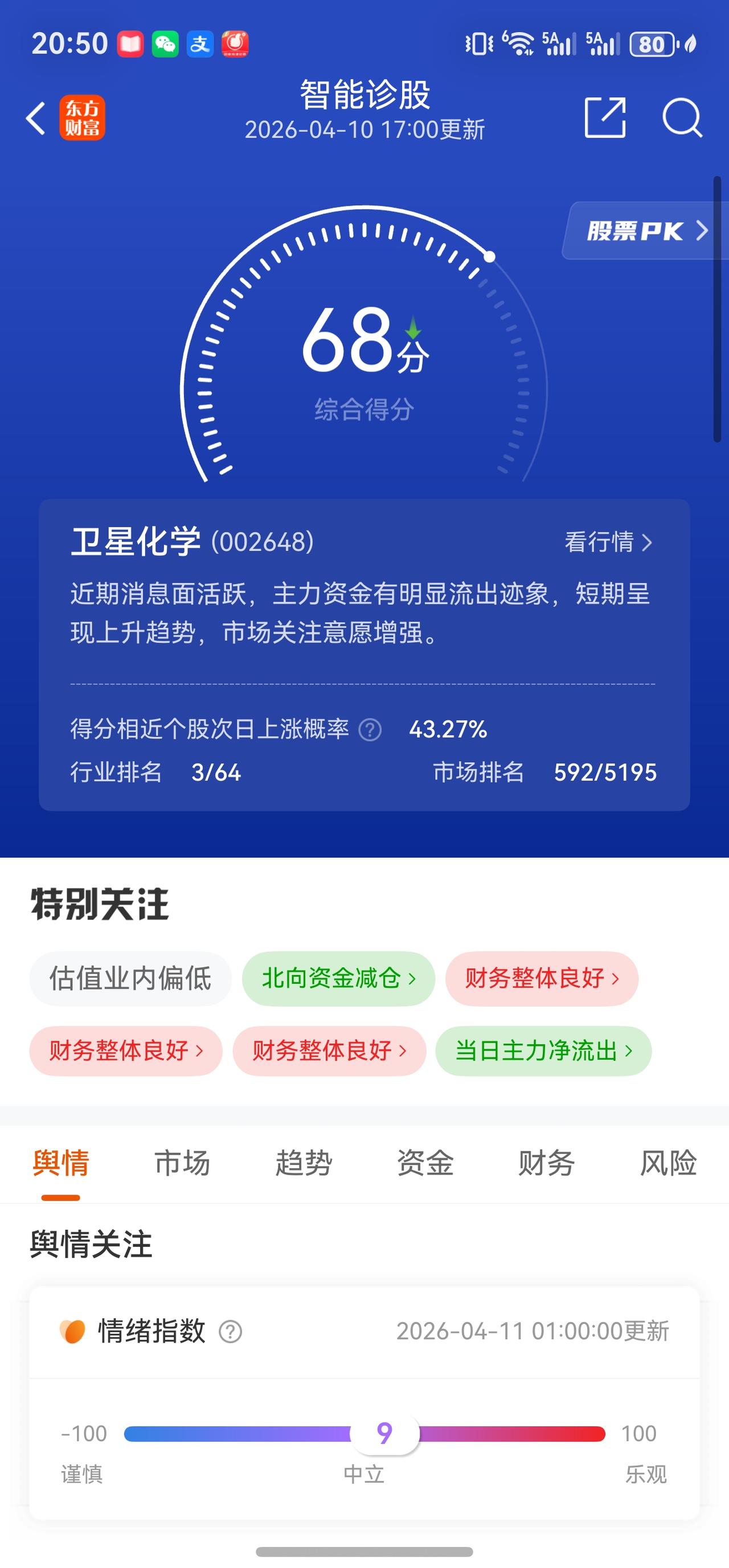 综合来看,卫星化学本周的大幅反弹主要受益于高油价逻辑的强化和前期超跌后的技术性修复。但由于主力资金在反弹过程中持续流出,且化工品价格波动、装置检修、即将披露的一季报等多重因素叠加,短期股价可能在27-30元区间维持震荡。