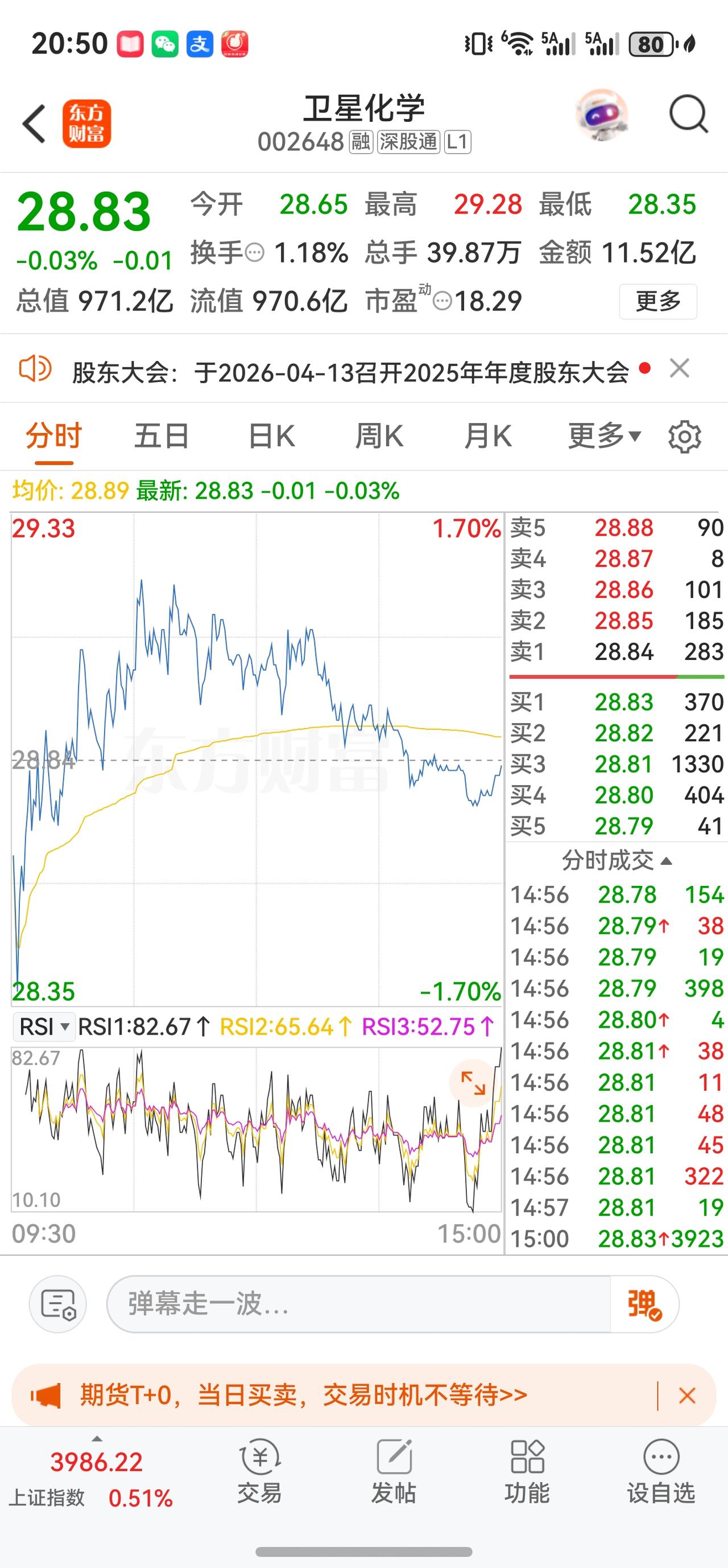 周5(4/10) -0.03% 28.83元 缩量窄幅震荡,成交额11.52亿元,换手率1.18%,多空双方维持均衡