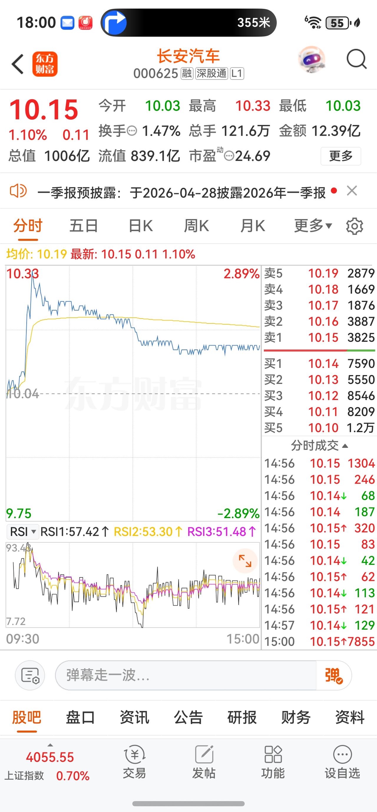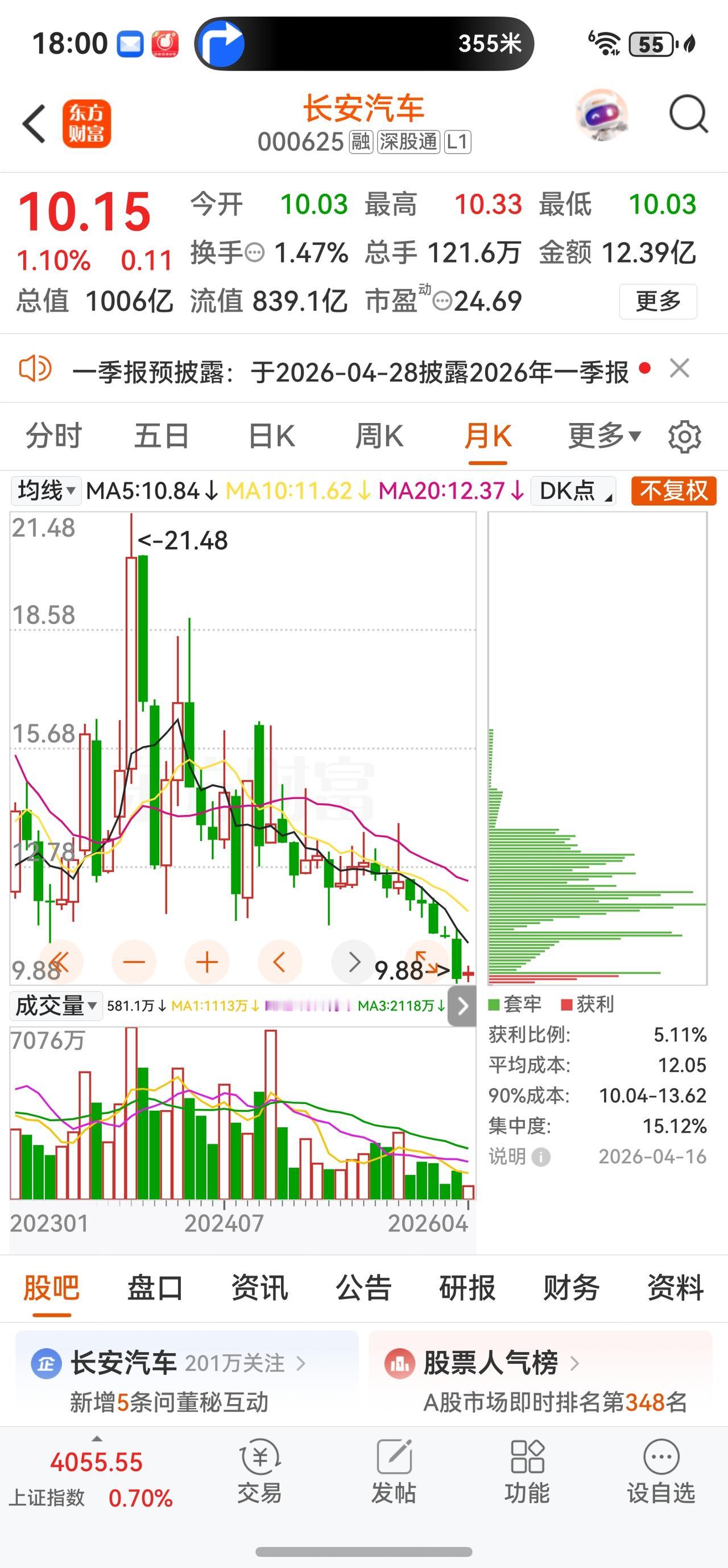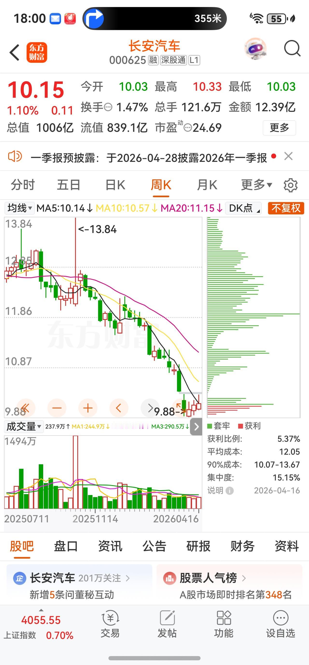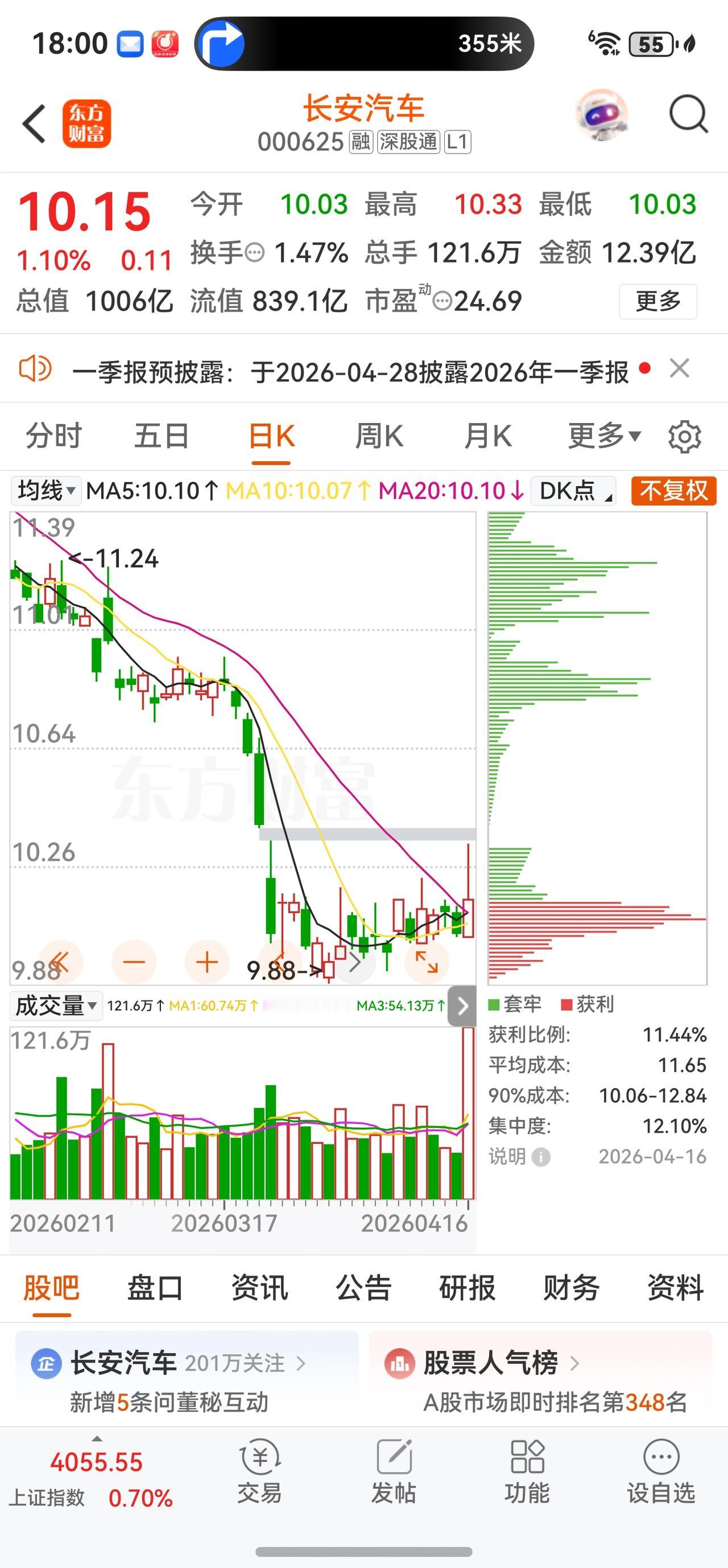 截至2026年4月16日收盘,长安汽车A股报收10.15元,上涨1.10%,振幅2.99%,成交额12.39亿元,换手率1.47%,总市值约1006亿元。盘中一度摸高10.33元,最低触及10.03元,总体呈现震荡小幅上扬态势。