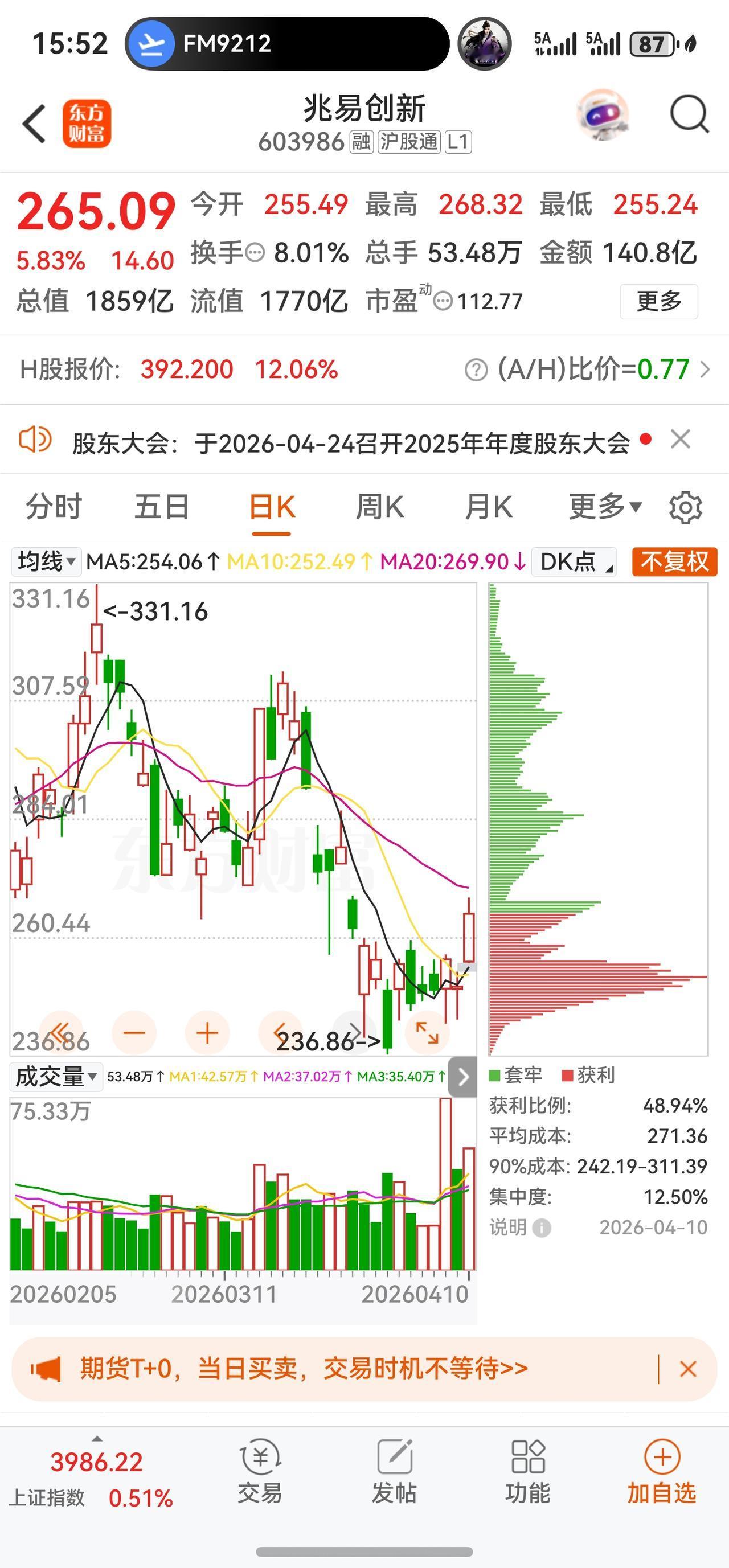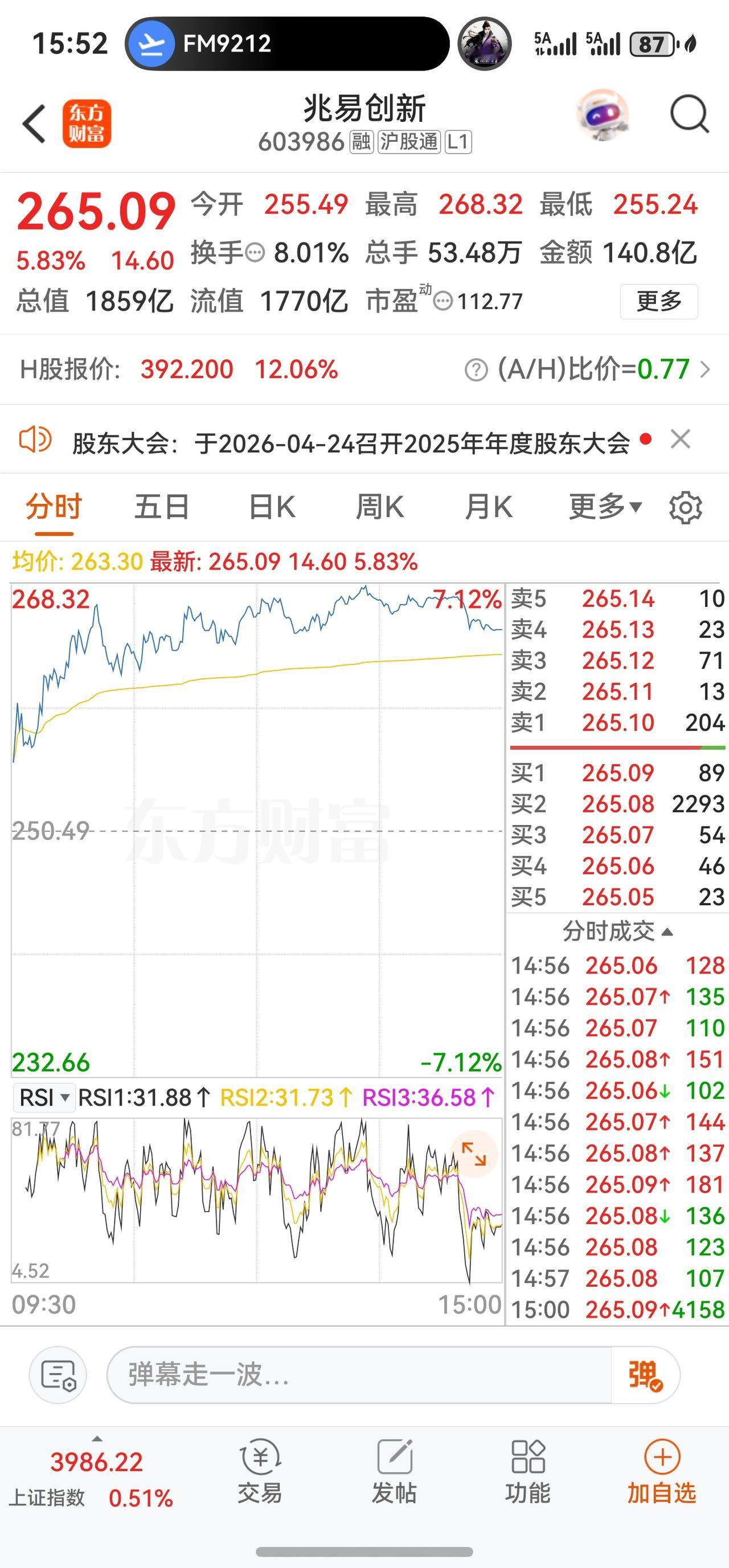 从249.1元启动到265.09元收盘,周涨幅6.42%,是年内首次周线实现"四连阳",但相比AI算力链的其他个股(如中际旭创周涨超20%、新易盛周涨约15%),弹性明显偏弱,更多呈现震荡修复特征。