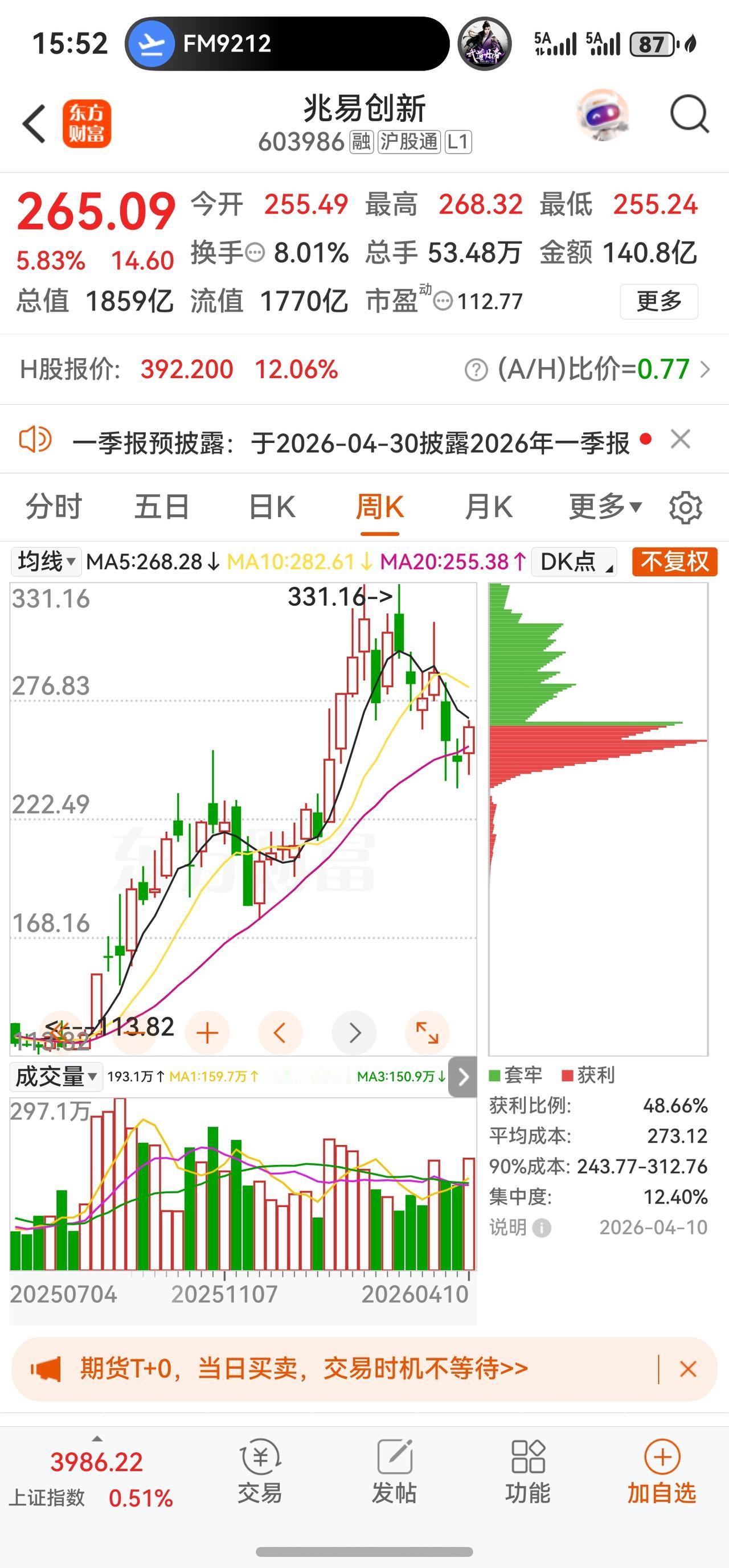 2026年4月7日至10日,兆易创新A股震荡上行,周涨幅6.42%,创下年内首次周线四连阳。