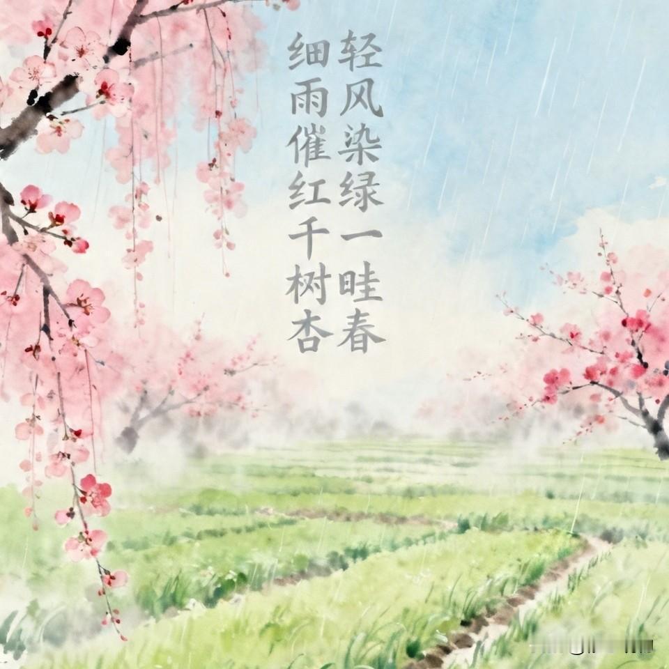 注:这副对联平仄规范,上联仄收、下联平收,节奏和谐。对仗工整,“细雨”对“轻风”,“催红”对“染绿”,“千树杏”对“一畦春”,词性、结构对称严谨。联中运用拟人手法,色彩对比鲜明,绘出春雨润花、春风染绿的春日美景,意境清新、画面感强,语言典雅流畅,是一副优秀的春日写景对联。“杏与春”虚实不全对等。