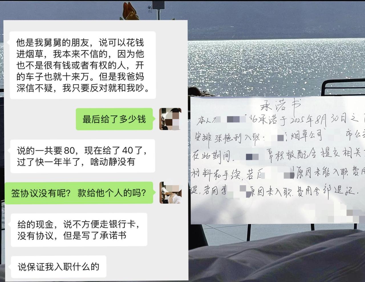 原来一位爸妈非要花40万现金,托舅舅的朋友帮刚毕业的女儿“买”烟草公司的工作,没签正规合同,只攥着一张“2025年入职否则退款”的承诺书,如今一年半过去,工作没影,钱也要不回来,最后连女儿找工作的时间都耽误了。当初儿女拼命反对,爸妈却信对方“能力通天”,连现金交易、不走银行卡的漏洞都没察觉,只觉得熟人介绍靠谱。