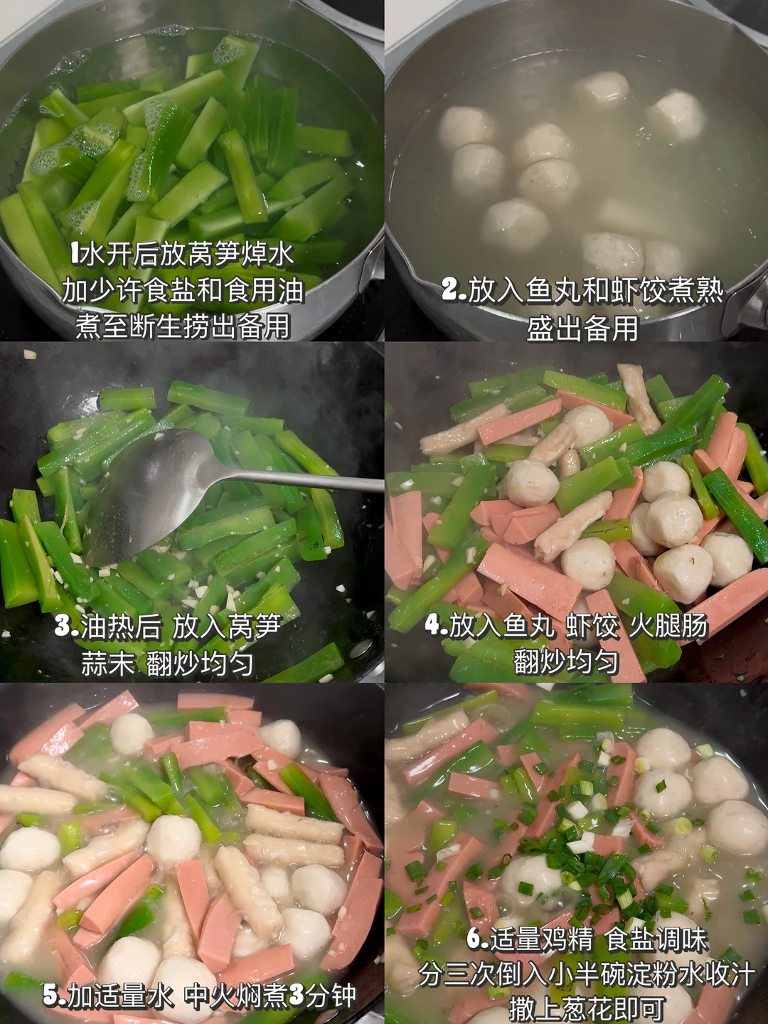 水开后放莴笋、少许食盐和食用油焯水,煮至断生盛出备用➡️鱼丸和虾饺放锅里,煮熟捞出备用➡️油热后,放入莴笋和蒜末,翻炒均匀➡️放入火腿肠、虾饺、鱼丸翻炒均匀➡️加适量清水,中火焖煮3分钟➡️适量鸡精,食盐调味,分三次倒入小半碗淀粉水,大火收汁,撒上葱花即可