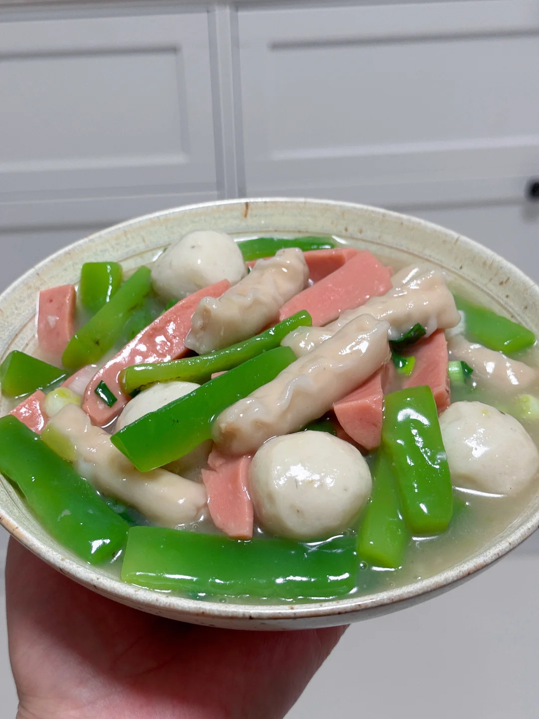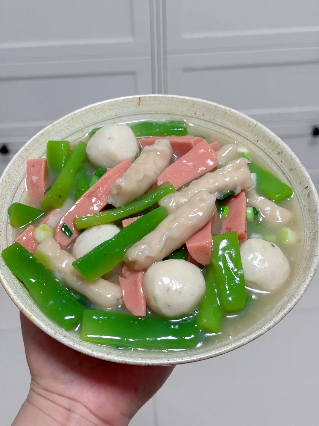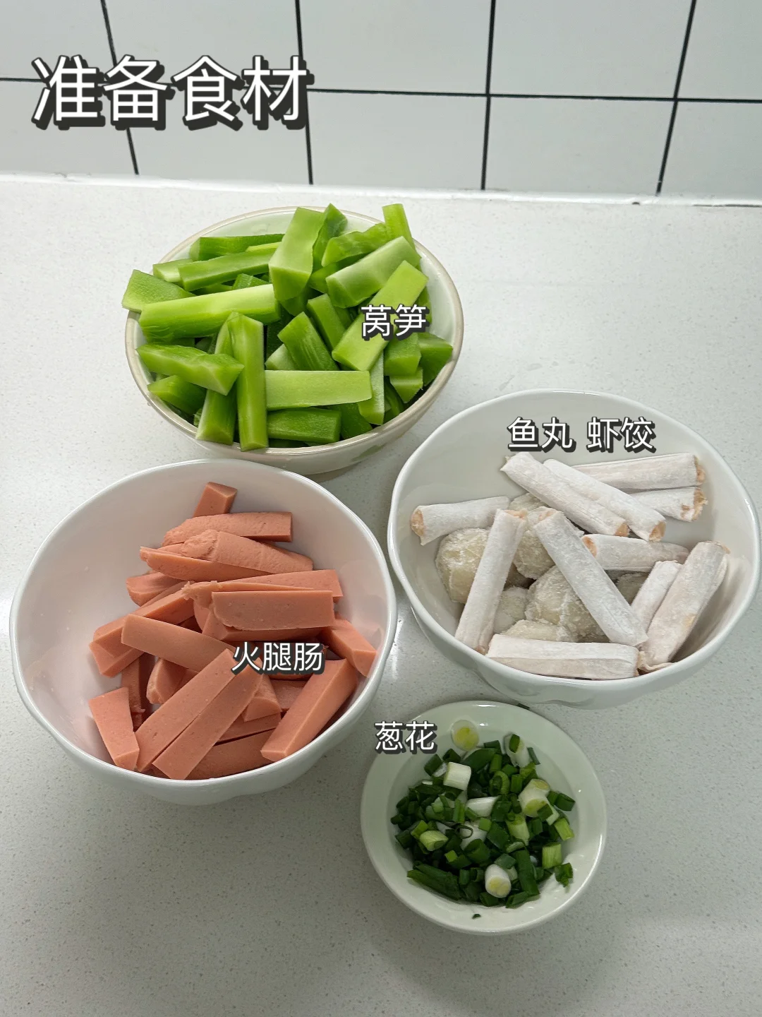 虾饺、莴笋条、火腿肠,蒜末,葱花,鱼丸