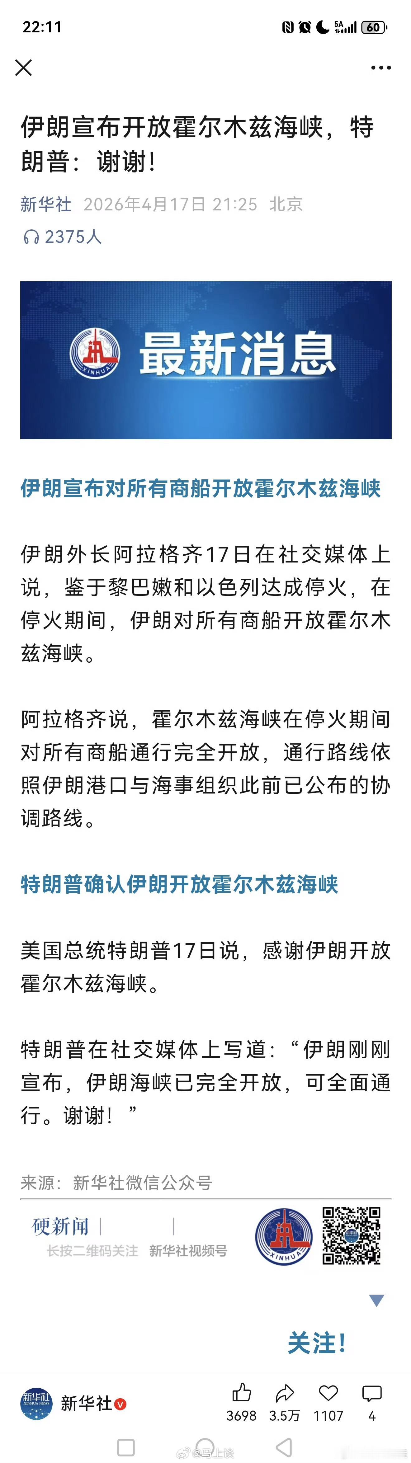 伊朗开放霍尔木兹特朗普发帖说谢谢霍尔木兹海峡开放