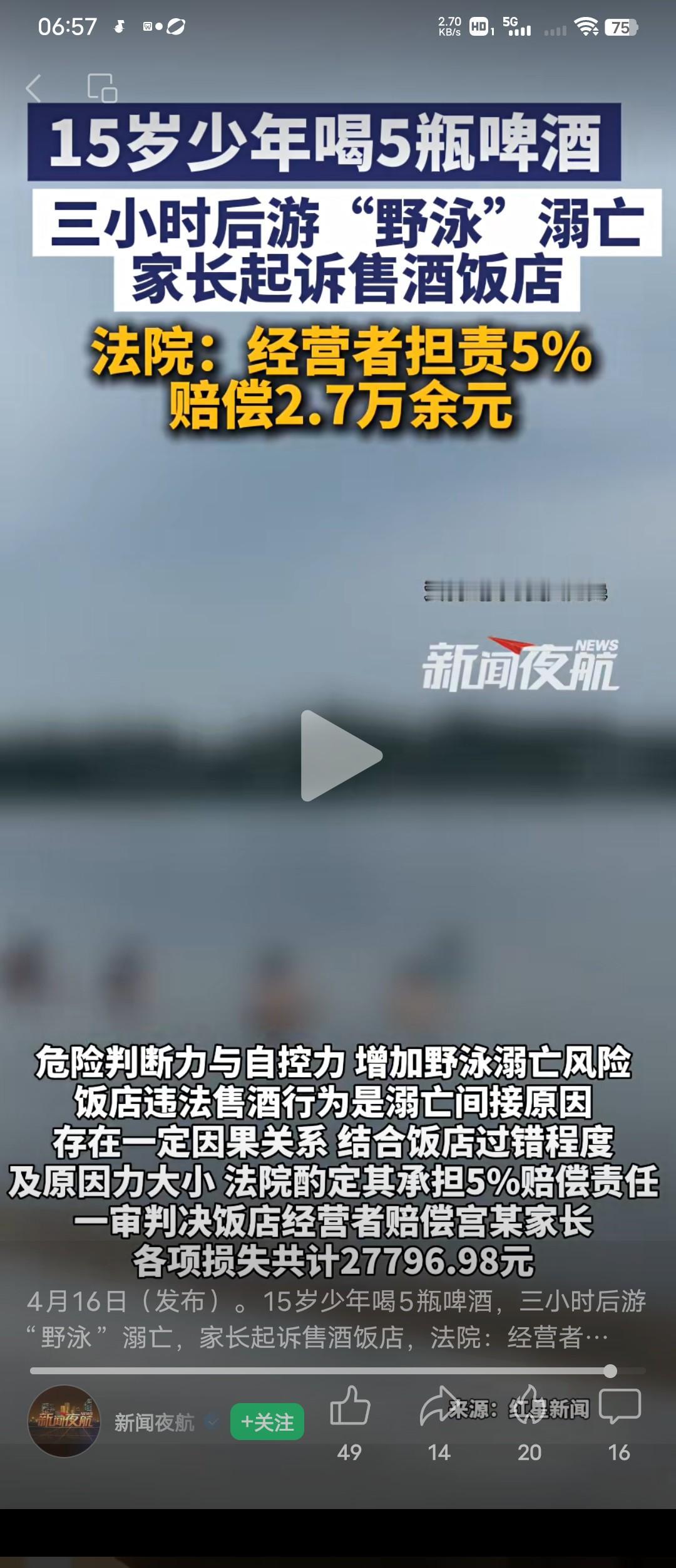 15岁少年和朋友在饭店庆生 喝五瓶啤酒游野泳溺亡,家长将饭店告上了法庭饭店需要担责吗?法院判了。