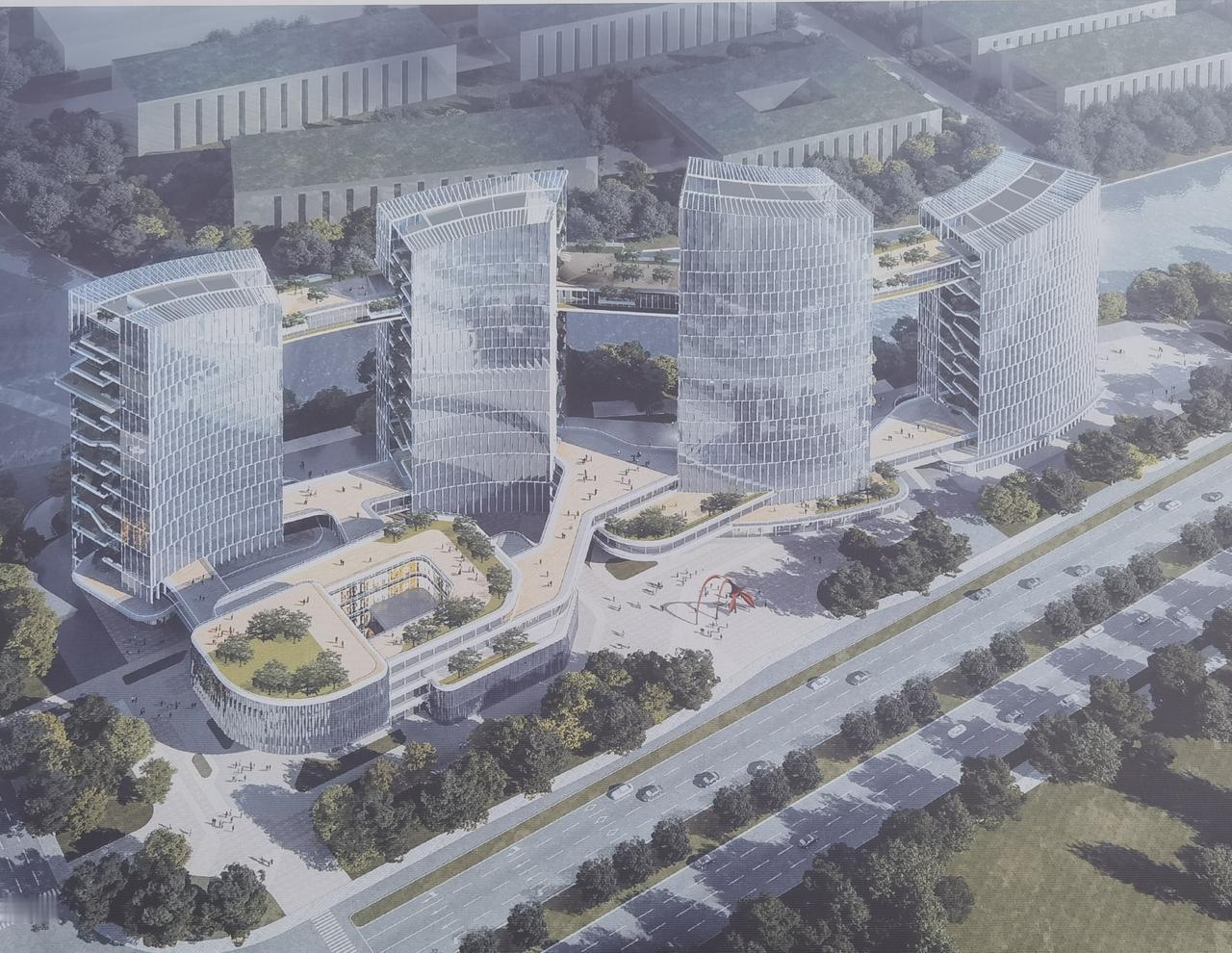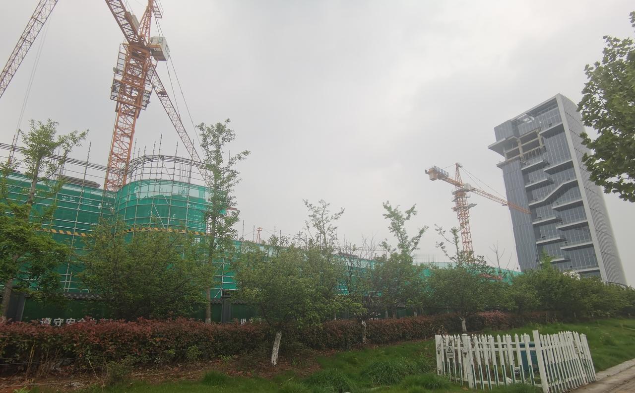 绍兴保税区商务中心的酒店大楼已装好幕墙,其它三栋已超过2层,正逐渐分成3个主楼,目前正在建设底部基础部分。