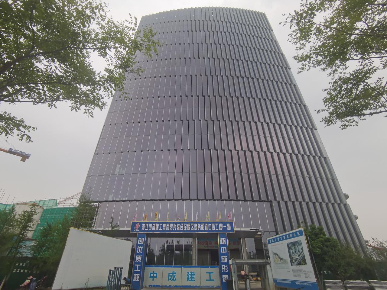绍兴保税区商务中心的酒店大楼已装好幕墙,其它三栋已超过2层,正逐渐分成3个主楼,