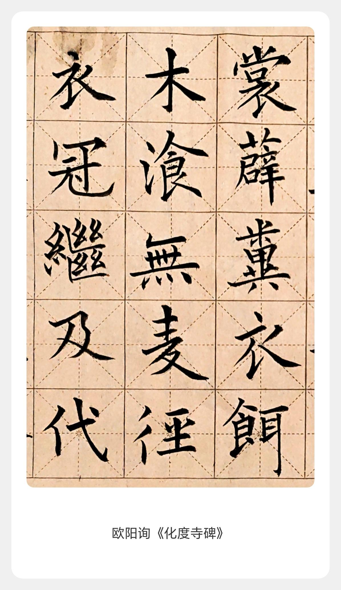 咱们学欧讲究“中宫收紧,斜中求正”,你看这字写的,中宫松得像散了架子,重心歪得站不住,横也不平竖也不直,一点欧楷端庄稳重的味儿都没有。为了装模作样区分五块碑,故意一会儿把字写瘦一会儿抻粗,《九成宫》的端庄你没摸到,《皇甫君碑》的险劲你写成了歪瓜裂枣,连欧阳通的《道因法师碑》都被你写得张牙舞爪,哪有一点欧家守法的样子?