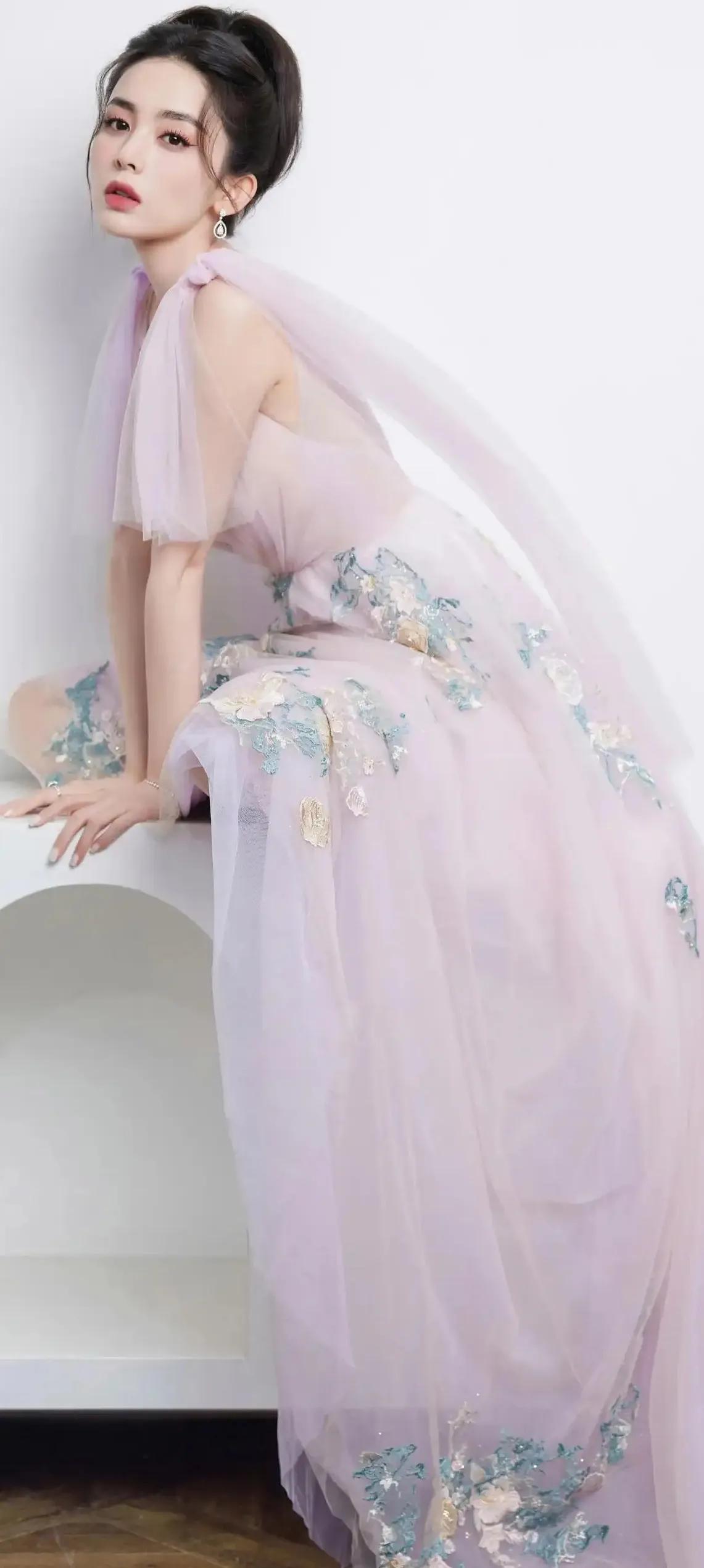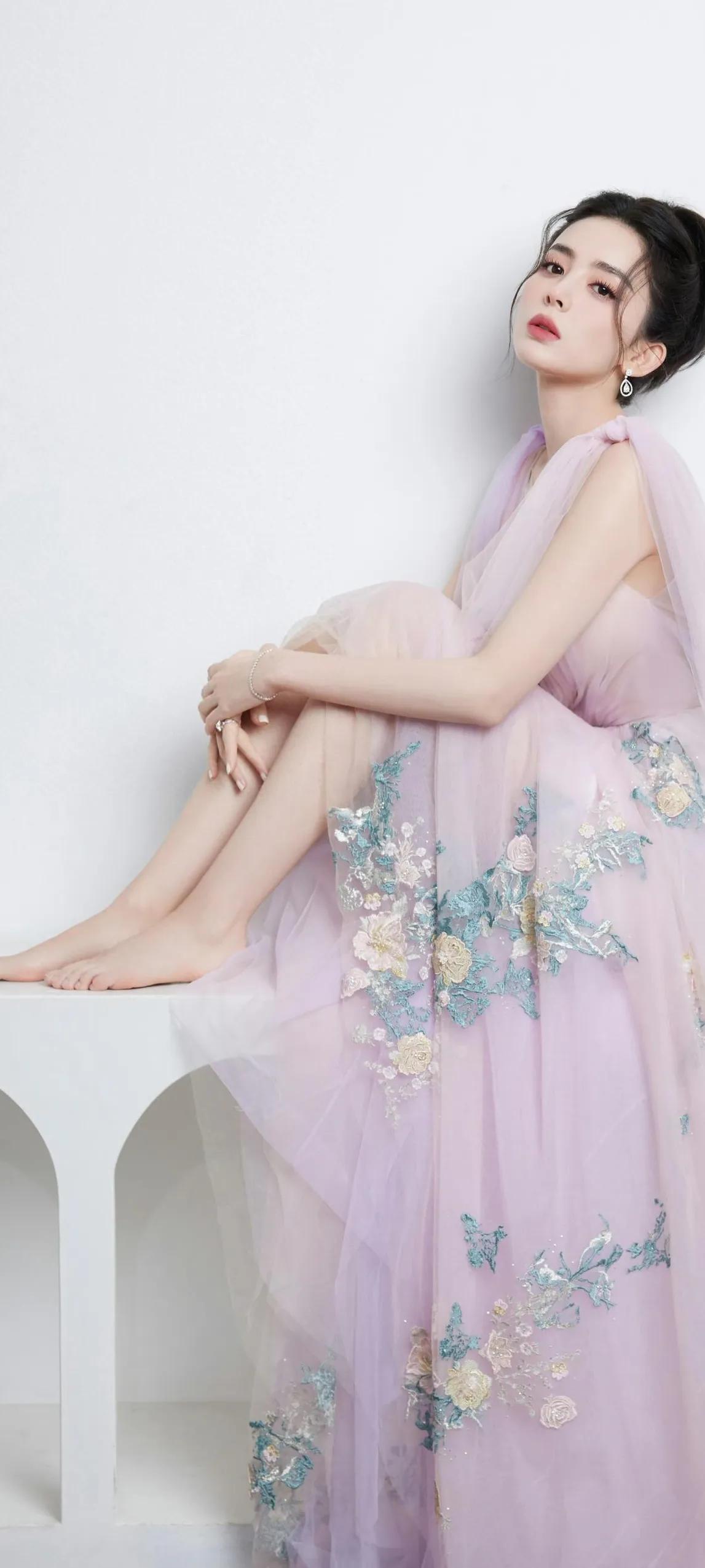 美女壁纸~古力娜扎,淡紫纱裙轻裹温柔,裙摆间的蓝金刺绣如春日繁花,在朦胧薄纱里晕染出浪漫光晕