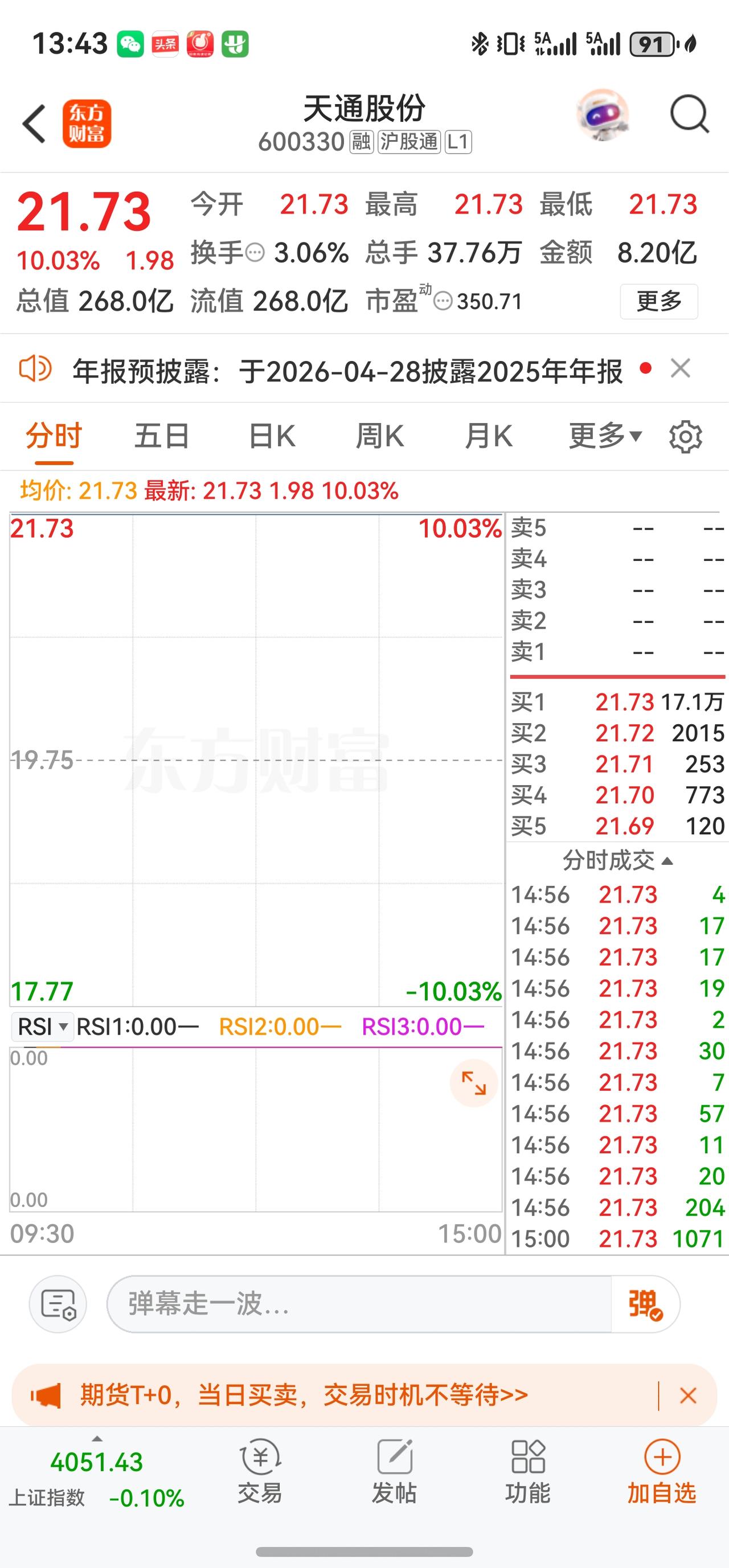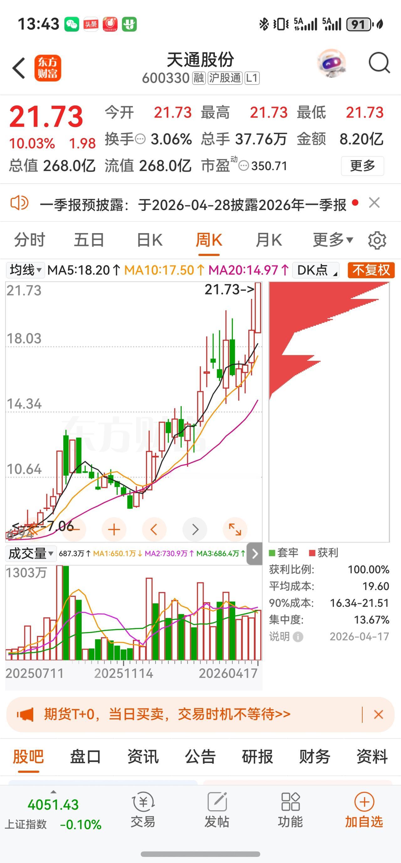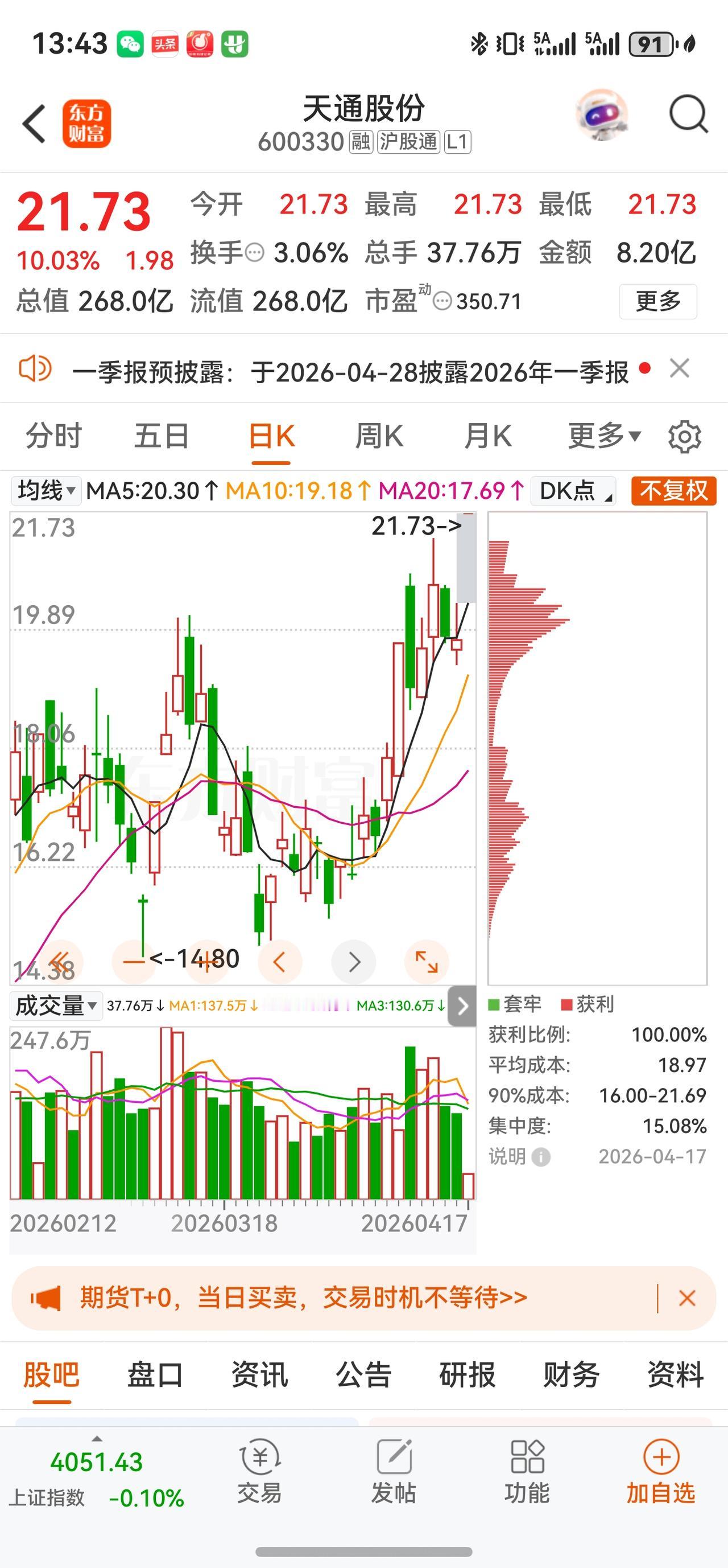 · 4月17日(周五):强势涨停,以21.73元收盘,涨幅10.03%,成交额8.20亿元,换手率3.06%,总市值回升至268.03亿元。