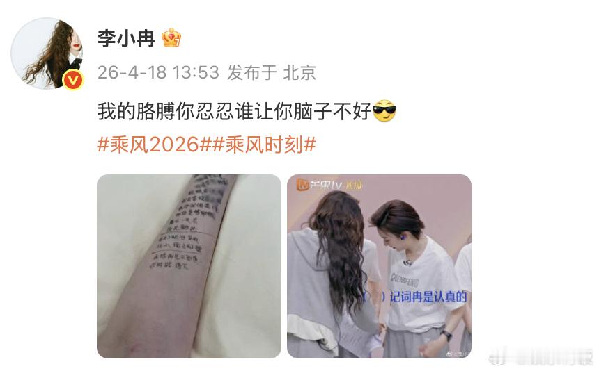 李小冉我的胳膊你忍忍李小冉记歌词是认真的 在记歌词这块我们李小冉真的是认真的 记在胳膊上,全是歌词~“在记了在记了。两条胳膊都在记了”,再给姐姐一点时间,歌词一定拿下