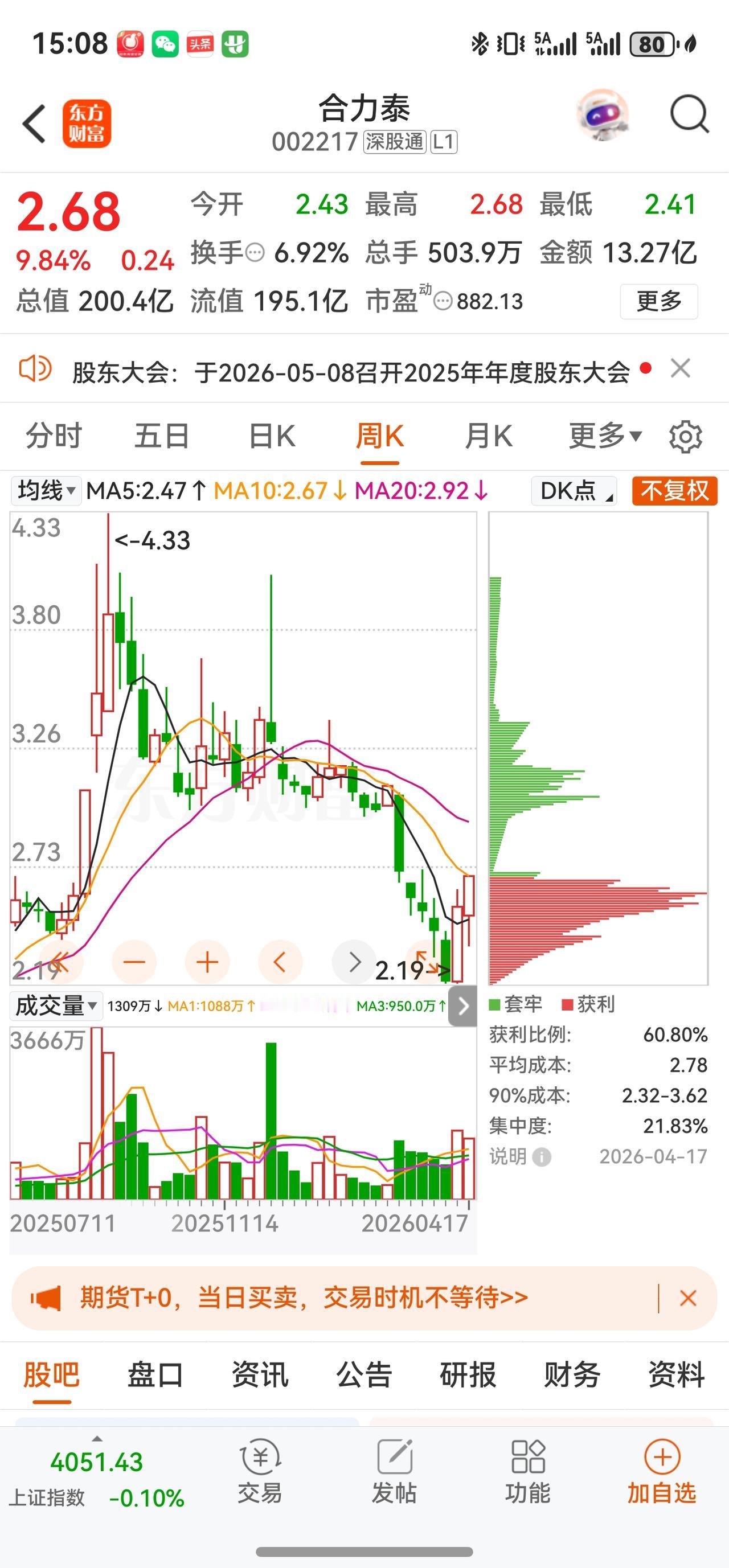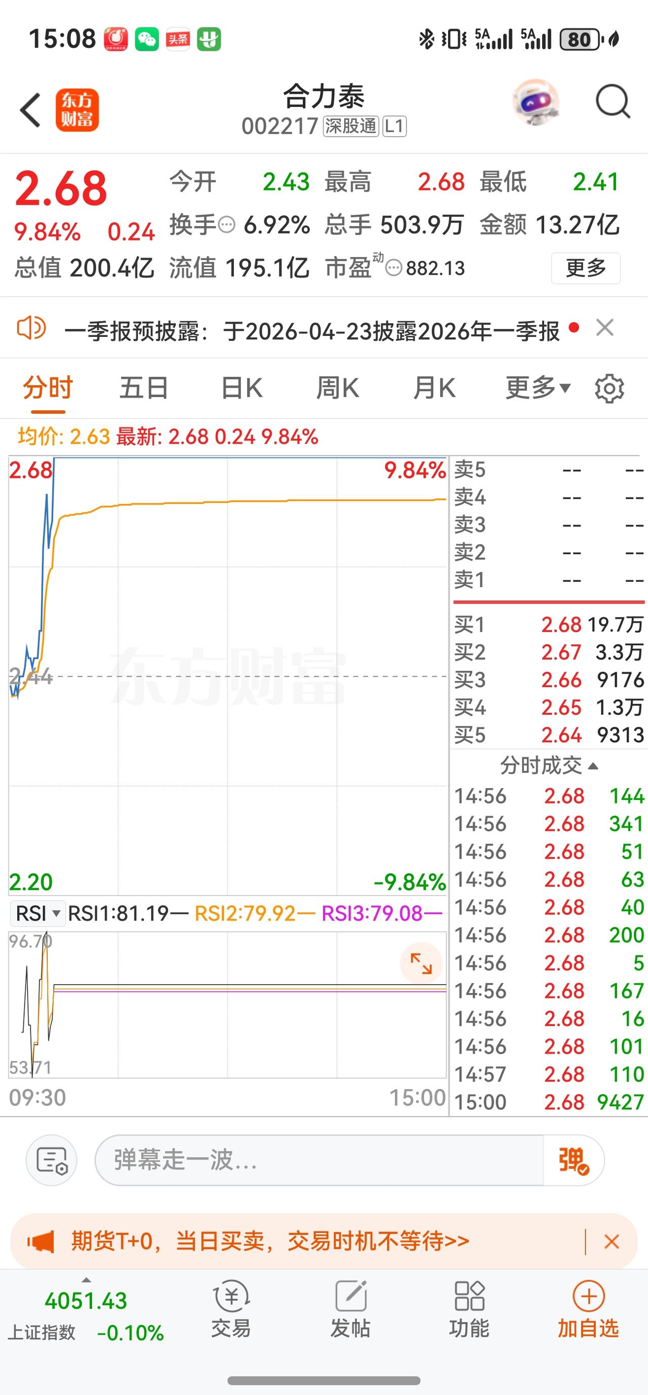 4月17日 2.68 +9.84%(涨停) 13.27亿元 6.92%