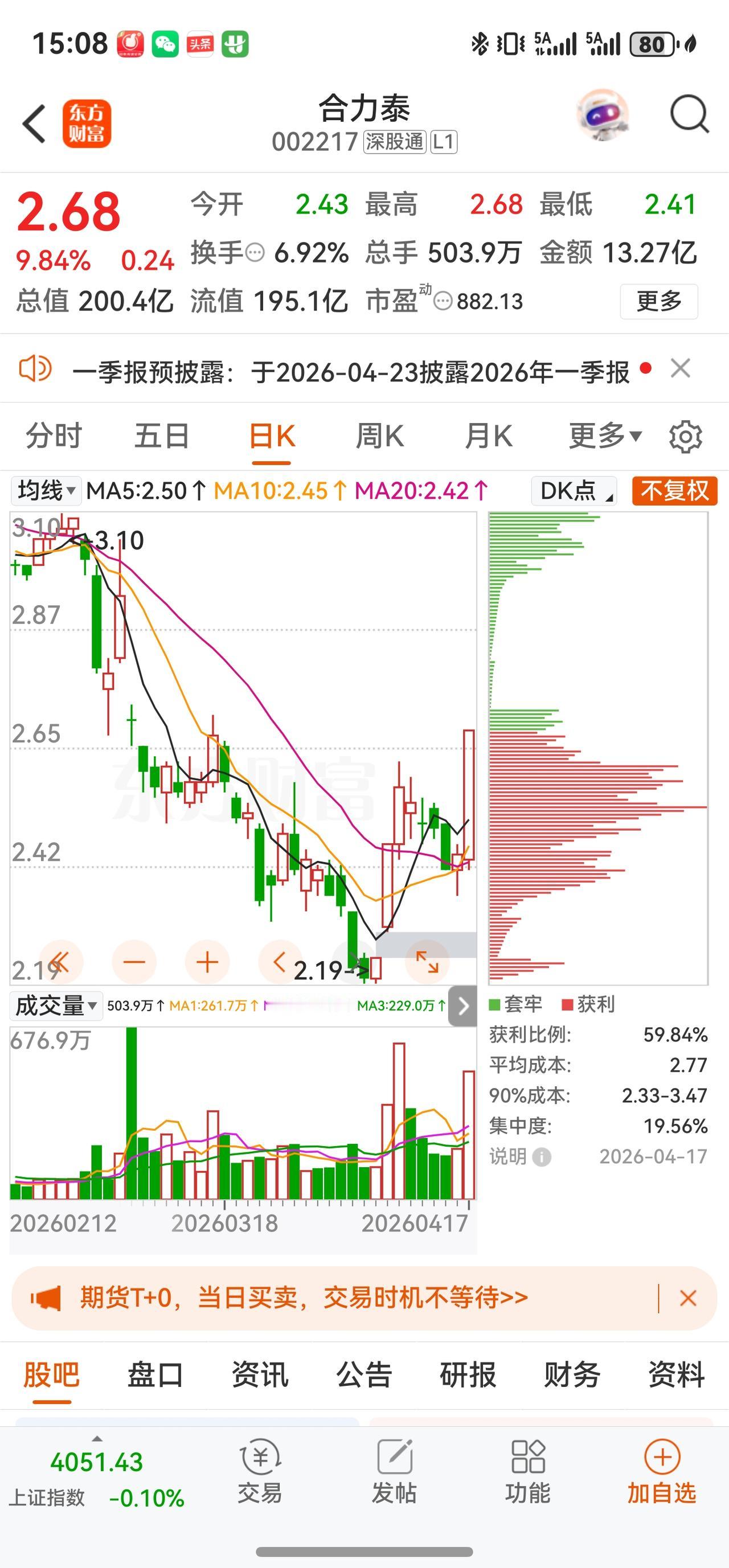 周五涨停后,股价已突破前期压力位,短期技术面由空转多。从筹码结构看,机构成本线约为2.46元(20日均线),最新主力成本2.63元,当前收盘价2.68元已基本与主力成本持平。参考前期技术分析,压力位在2.21元左右,目前股价已明确突破该位置,进入新的运行区间。