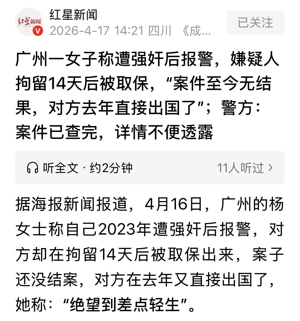 参考信息:红星新闻.(2026,4月17日).广州女子称遭强奸,嫌疑人刑拘14天后取保出国,受害者:绝望到写遗嘱.
