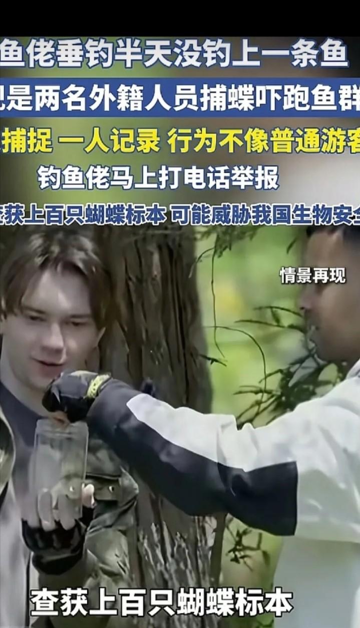 还有一位钓鱼爱好者,在西南边境自然保护区钓了半天,一条鱼没上钩,却发现岸边两个老外一个拿捕虫网抓蝴蝶,一个拿高清设备全程拍摄。