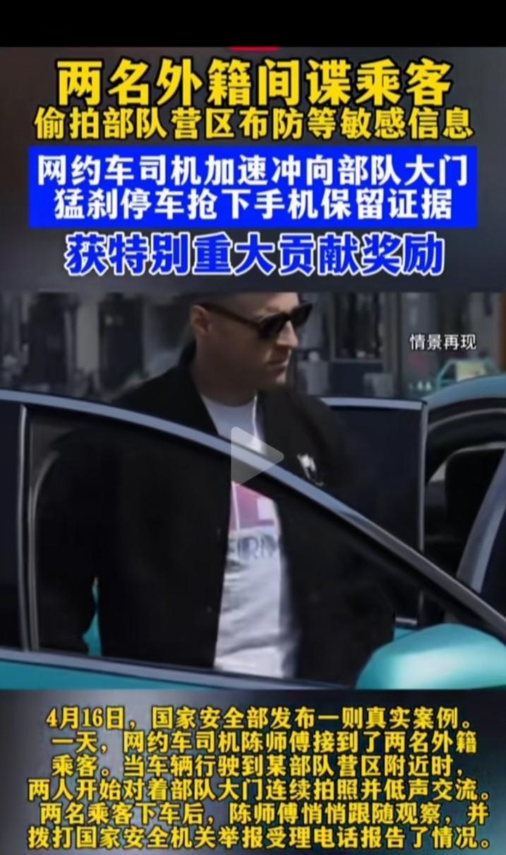 参考信息:国家安全部.(2026,4月16日).网约车司机智斗境外间谍,获特别重大贡献奖励[微信公众号].