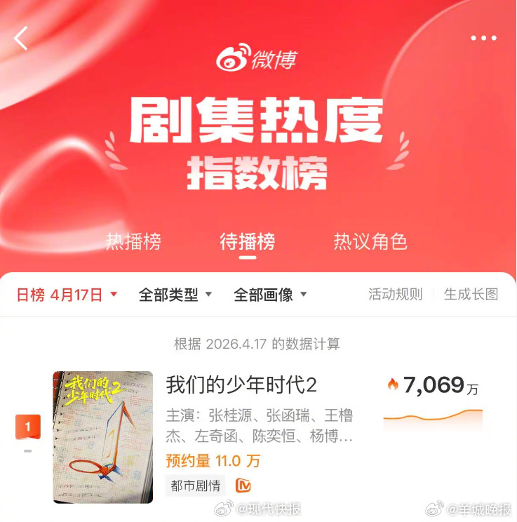 【#我的少年时代2杀青待播热度再登顶#】青春校园剧《我们的少年时代2》由TF家族新生代演员(排名不分前后,按年龄大小排序)等主演,有消息称该剧于近日在海南杀青。《我们的少年时代2》未播先火,热度持续领跑,4月17日再回待播剧热度日榜第一。截至4月18日,已有超11.2万人在全平台预约。该剧以“篮球+校园乐团”双线叙事,讲述少年们挽救宜北中学篮球社、共建秘密基地的青春成长故事,一起演绎青春最真实的模样。在社交平台上,主演们的营业也同样青春可爱,备受网友喜爱,你最pick谁?(现代快报)(编辑:惠天骄;审签:谢杨柳)