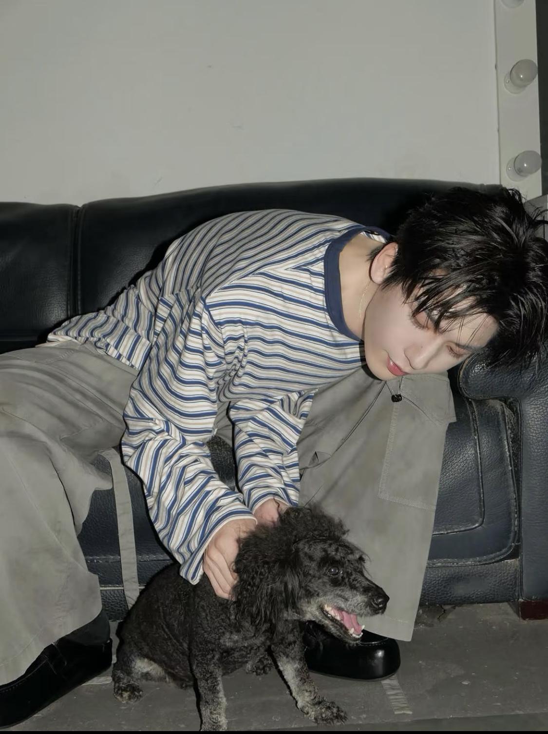 张凌赫这组条纹衫,有种青春男大的即视感。精致男生搭配潦草小狗。把两个物种特色展现的淋漓尽致。潦草的更加潦草,精致的更加精致。