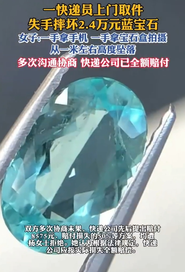 近日,四川,杨女士将价值2.4万元的蓝宝石交快递员上门取件。快递员在验货时,一手持手机拍照、一手持宝石盒,不慎从约1米高度摔落宝石,致其开裂。杨女士支付22.95元运费时,系统默认选择了1000元保额,但她认为快递尚未揽收,摔坏是快递员重大过失,不应适用保价限额条款。双方经多次协商,4月17日,快递公司称双方已协商一致,全款赔付杨女士并已完成打款,杨女士也确认已经收到赔偿款。
