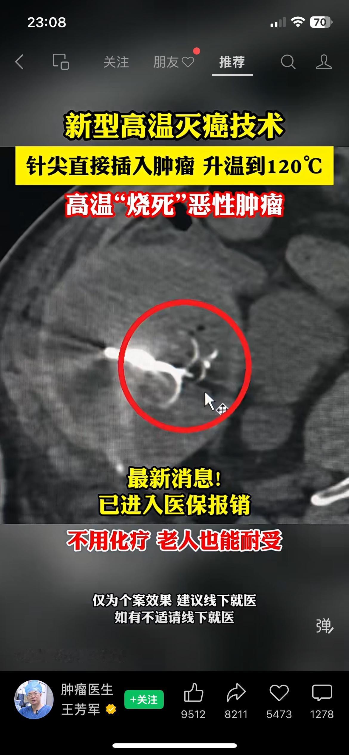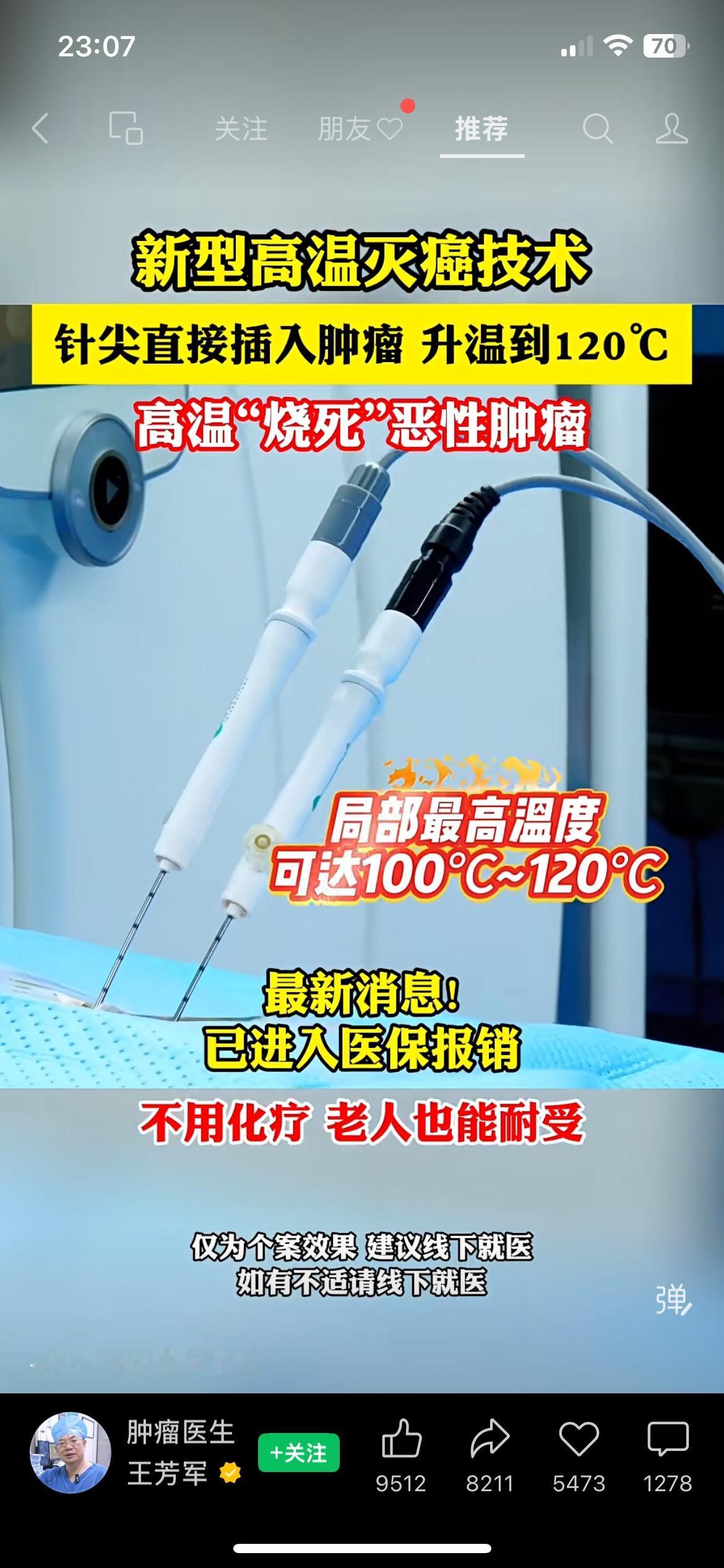 新型高温灭癌技术纳入医保了,用针尖对准肿瘤升温灭杀癌细胞,不用化疗,老人也能扛得住。