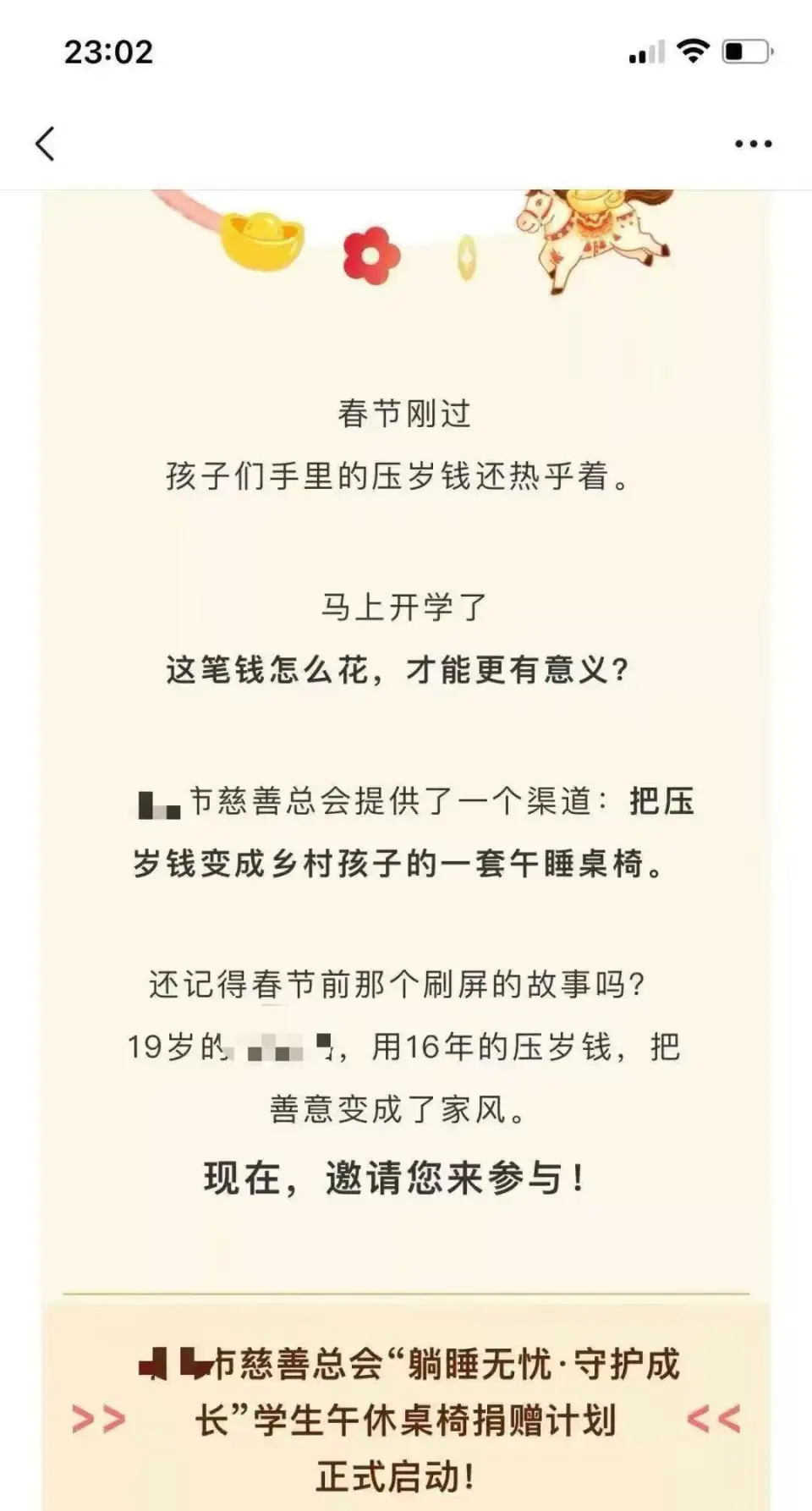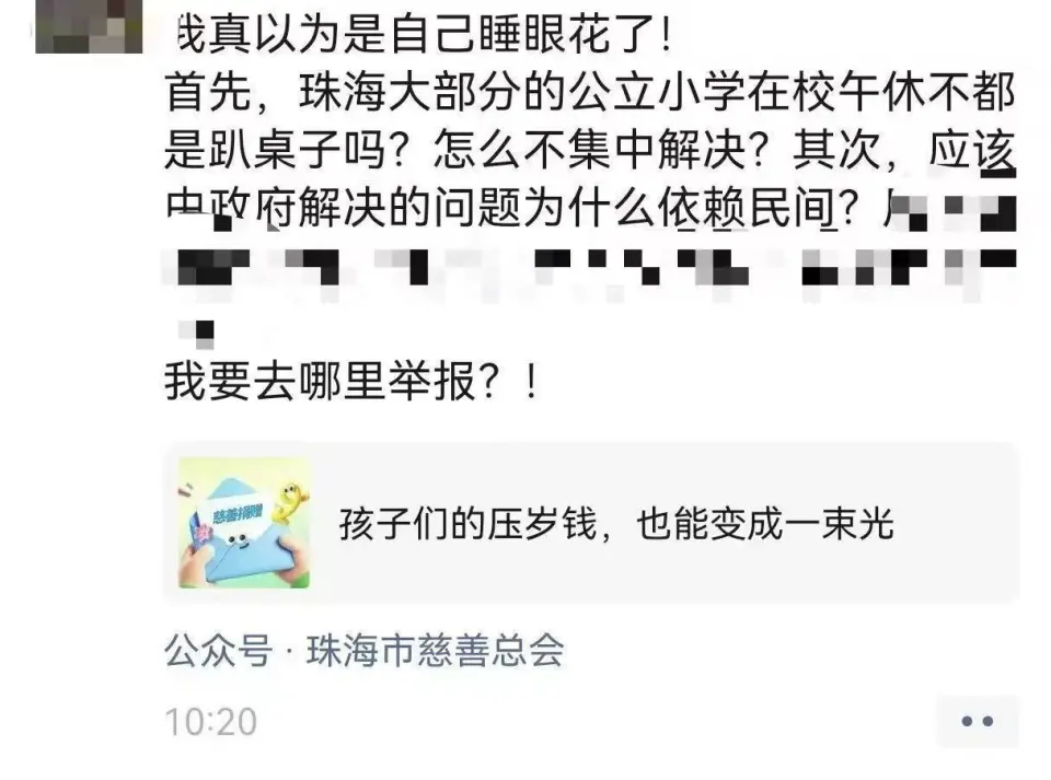 #向趴睡孩子募捐躺椅唤醒午睡困局#【南都快评:向“趴睡”孩子募捐躺椅,“唤醒”了午睡困局】#让孩子躺睡不该只靠慈善#今年春节后,珠海市慈善总会发起募捐,号召孩子们“把压岁钱变成乡村孩子的一套午睡桌椅”,该推文被多所中小学转发。然而,市区大多数孩子仍在趴桌午睡,家长认为此举未兼顾城区学生的午睡需求,有违慈善公平原则。对此,珠海市慈善总会向南都记者回应称,推文在内容表达上未能充分兼顾城区学校同样存在的午休改善需求,已主动下架。